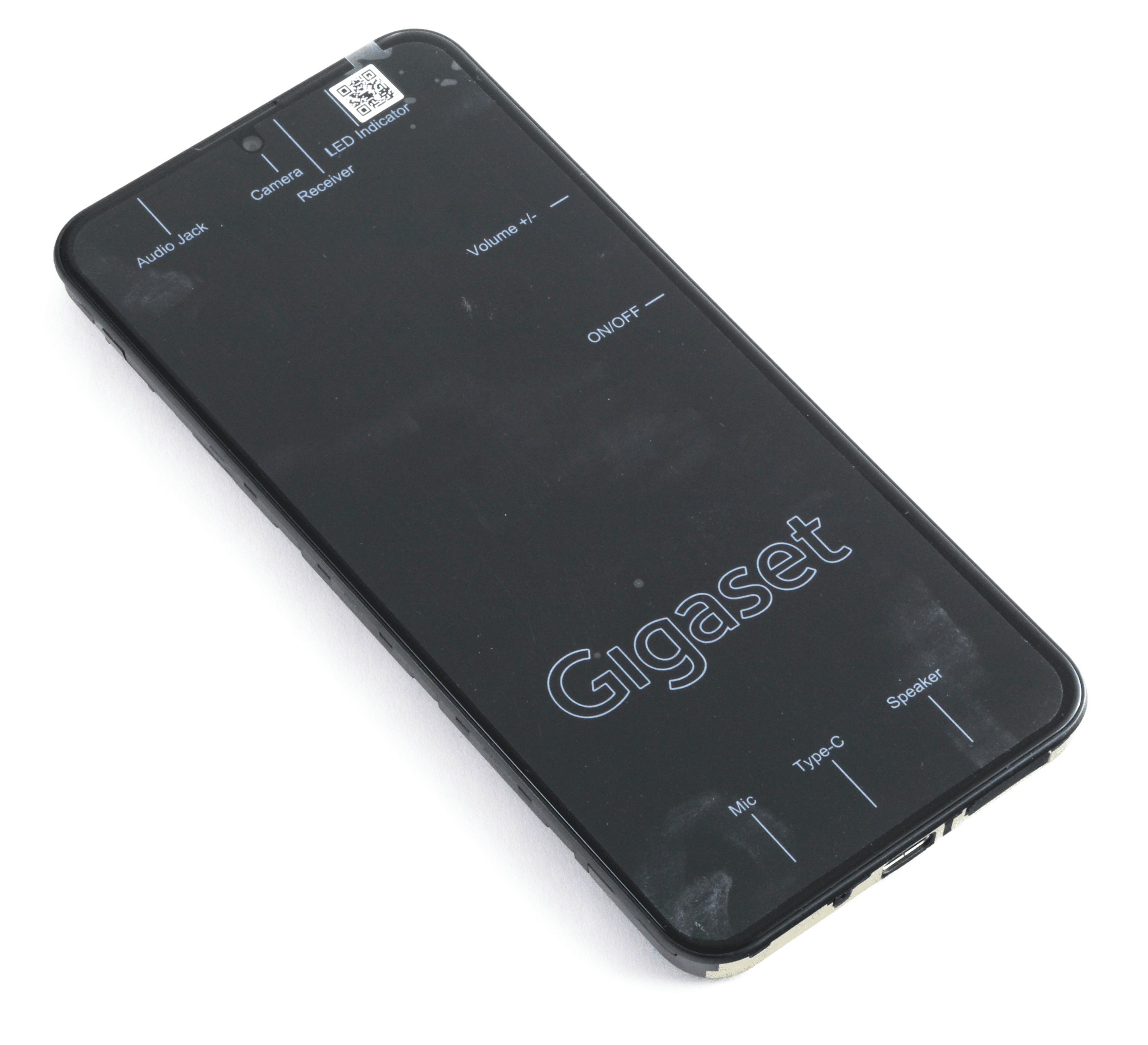 Im Gegensatz zum auffällig designten Gigaset GS4, das durch die Glasrückseite und die Rosegold-Akzente hervorsticht, ist das GS3 deutlich schlichter, konventioneller gestaltet. Erneut wird fast die gesamte Vorderseite vom Display überdeckt, das einzig durch die Kamera-Notch durchbrochen wird. Die Positionierungen der Buttons sind ebenso üblich: Die Power-Taste und die Lautstärkewippe sind rechts, der USB-C-Anschluss unten und die Klinkenbuchse oben.