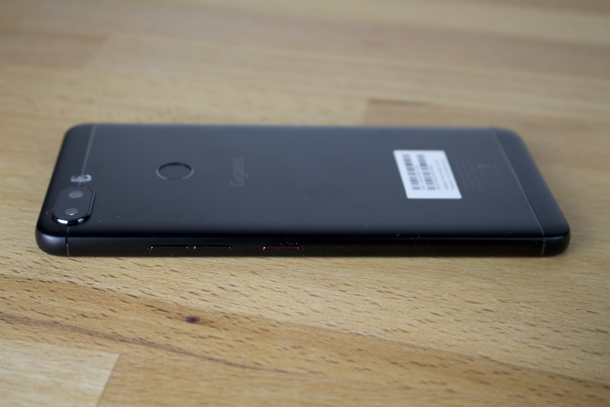 Mit einer Größe von 151 x 72 x 8,2 Millimetern und einem Gewicht von knapp 145 Gramm liegt das Gigaset GS370 Plus gut in der Hand. Es ist also recht kompakt. Die Ecken sind abgerundet, was den angenehmen Eindruck beim Aufliegen auf der Hand verstärkt. Rechts finden sich ein Powerbutton sowie ein Lautstärkeregler. Rückseitig befindet sich ein Fingerabdrucksensor. Links auf der Rückseite befindet sich die Hauptkamera. Unten ist der Lautsprecher zu finden, während oben ein 3,5-Millimeter-Audioausgang angebracht ist.