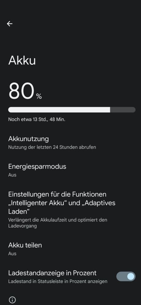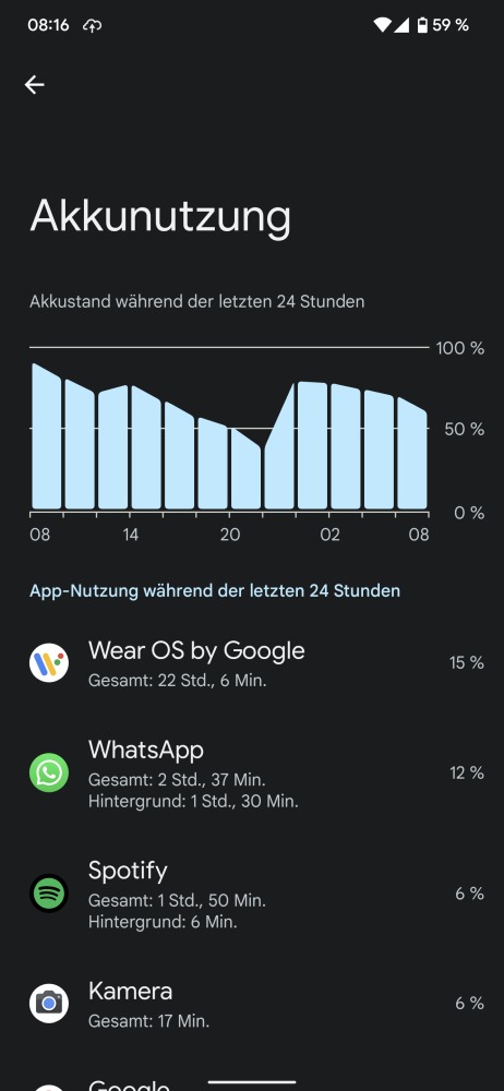 Dank der mit Android 12 neugestalteten Akkunutzungsanzeige fällt es etwas schwer, genau Schlüsse zu ziehen. Denn hier kann nur mehr die Akkunutzung in den letzten 24 Stunden angezeigt werden, nicht aber seit dem letzten Ladevorgang.