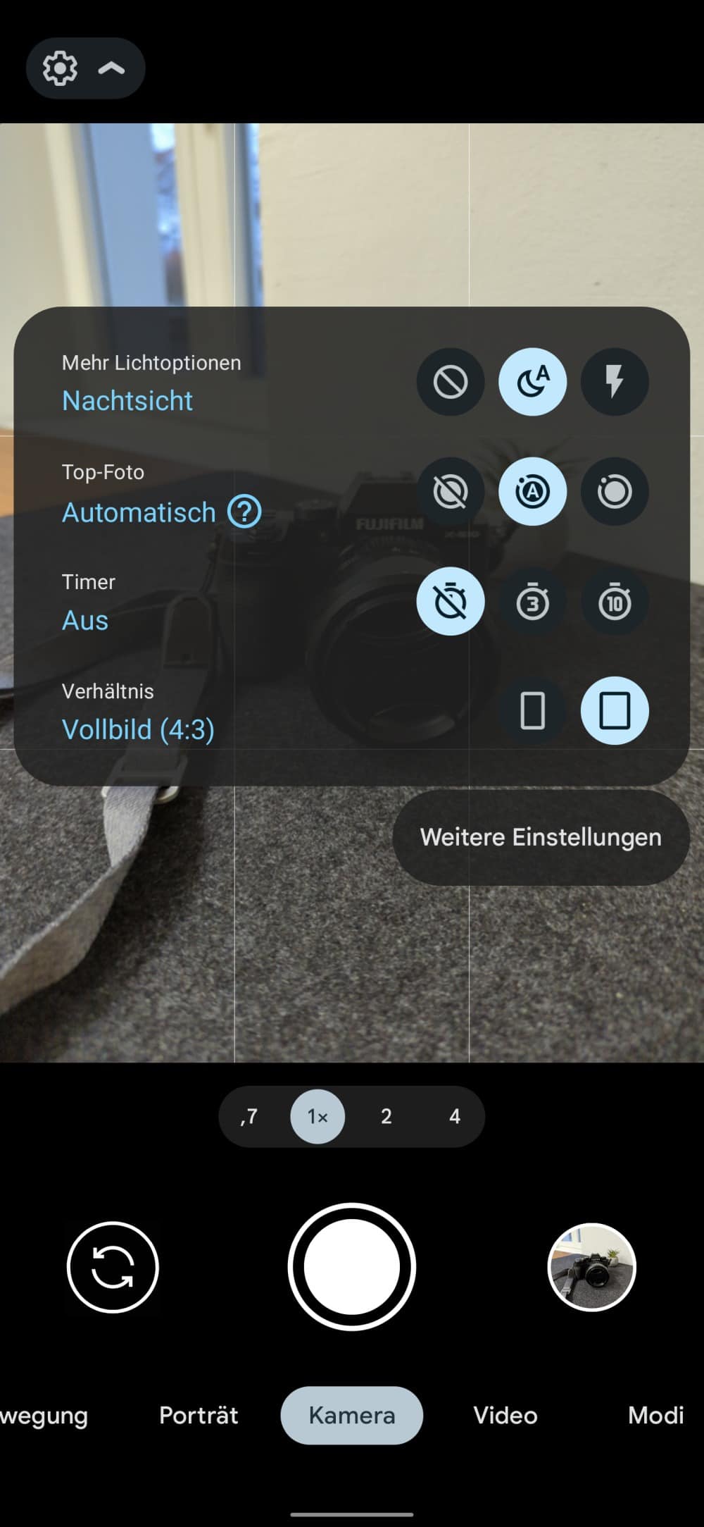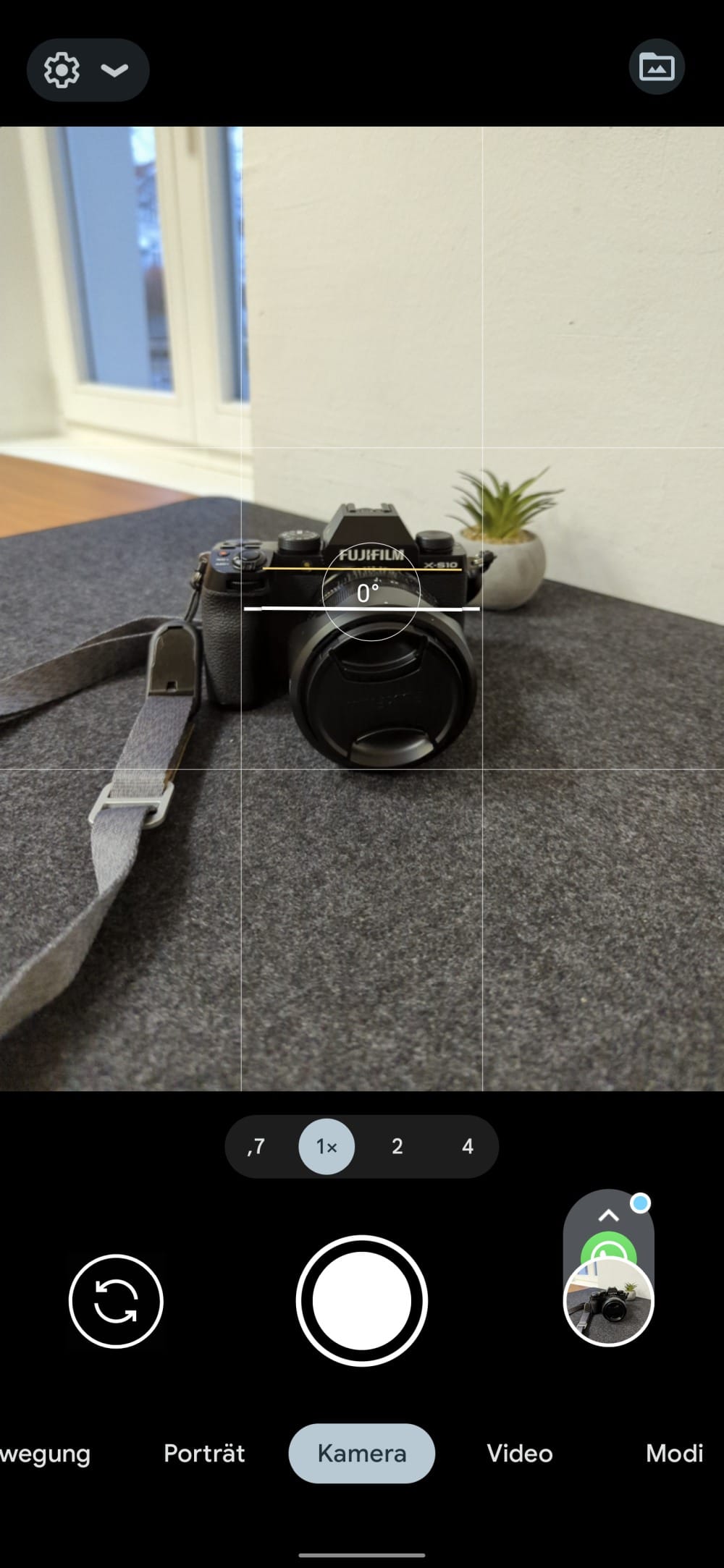Google überzeugt mit einem klaren, aufgeräumten Kamera User Interface. Unterhalb des angezeigten Bildes stehen die verschiedenen Zoom-Stufen (0,7x für Ultraweitwinkel, 1x, 2x und 4x optischer Zoom) zur Wahl.