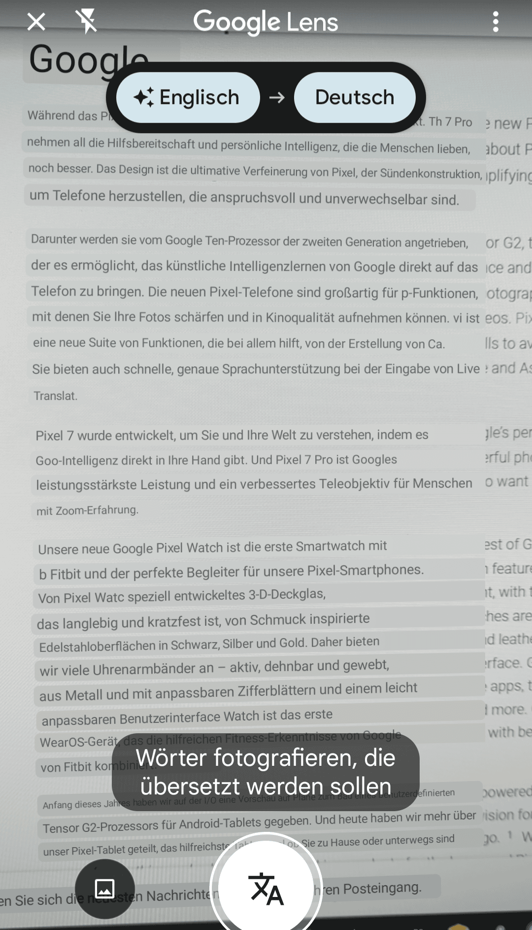 Mit Google Lens ist es nun sogar möglich, Texte mit geöffneter Kamera live übersetzen zu lassen und das ohne dabei überhaupt ein Foto aufnahmen zu müssen. Es sind diese und viele weitere praktische Funktionen, die das Google Pixel 7 Pro so besonders machen. Hinzu kommen smarte Kamera-Features, auf die ich später zu sprechen komme.