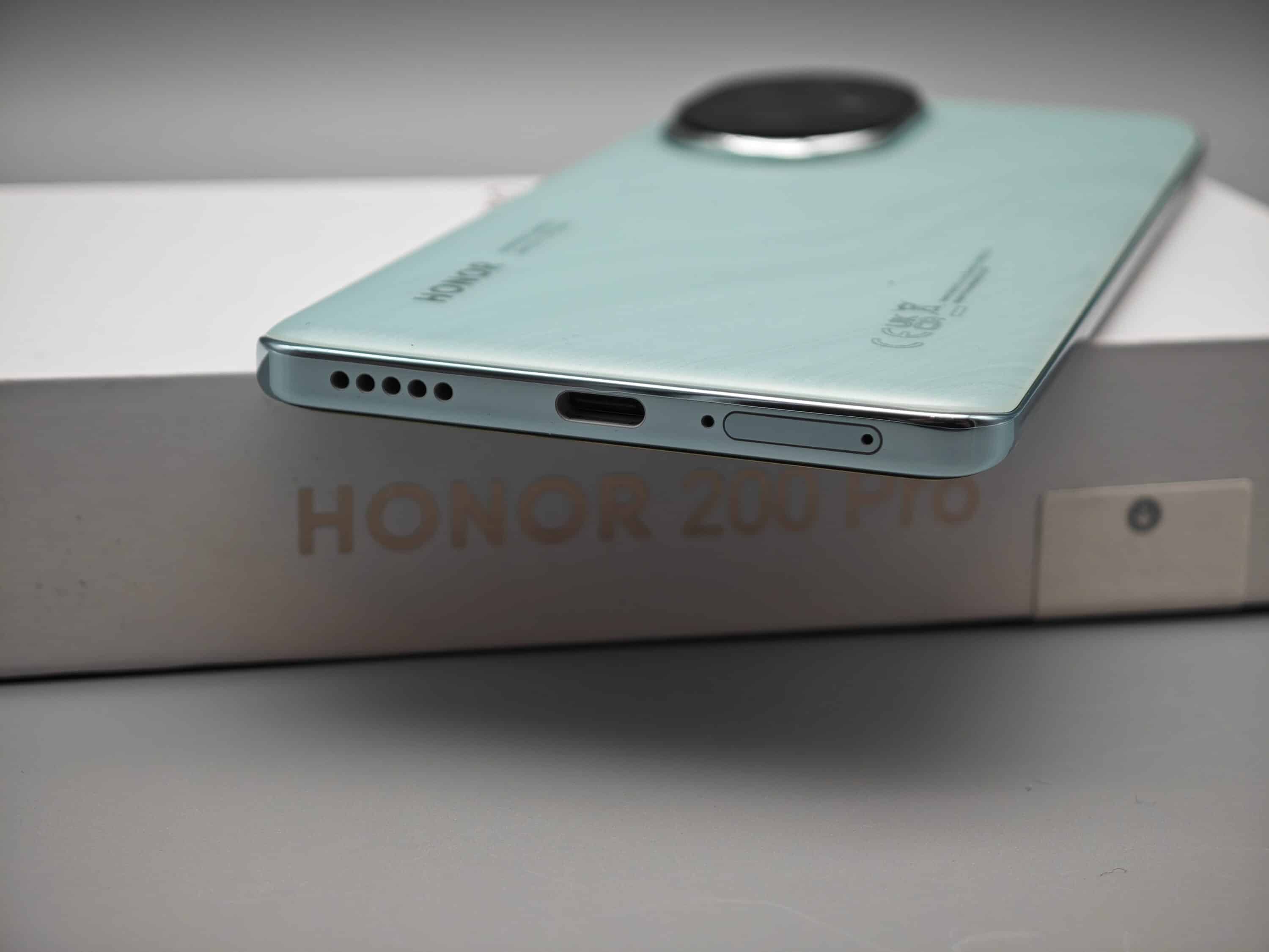 In Kombination mit dem silbernen Rahmen macht das HONOR 200 Pro optisch einiges her. An der rechten Seite findet ihr Lautstärkewippe und Power-Button, während unten und oben die Lautsprecher verbaut sind. Den USB-Port zum Laden, sowie den SIM-Kartenslot platziert man an der Unterseite, während die linke Seite leer bleibt.