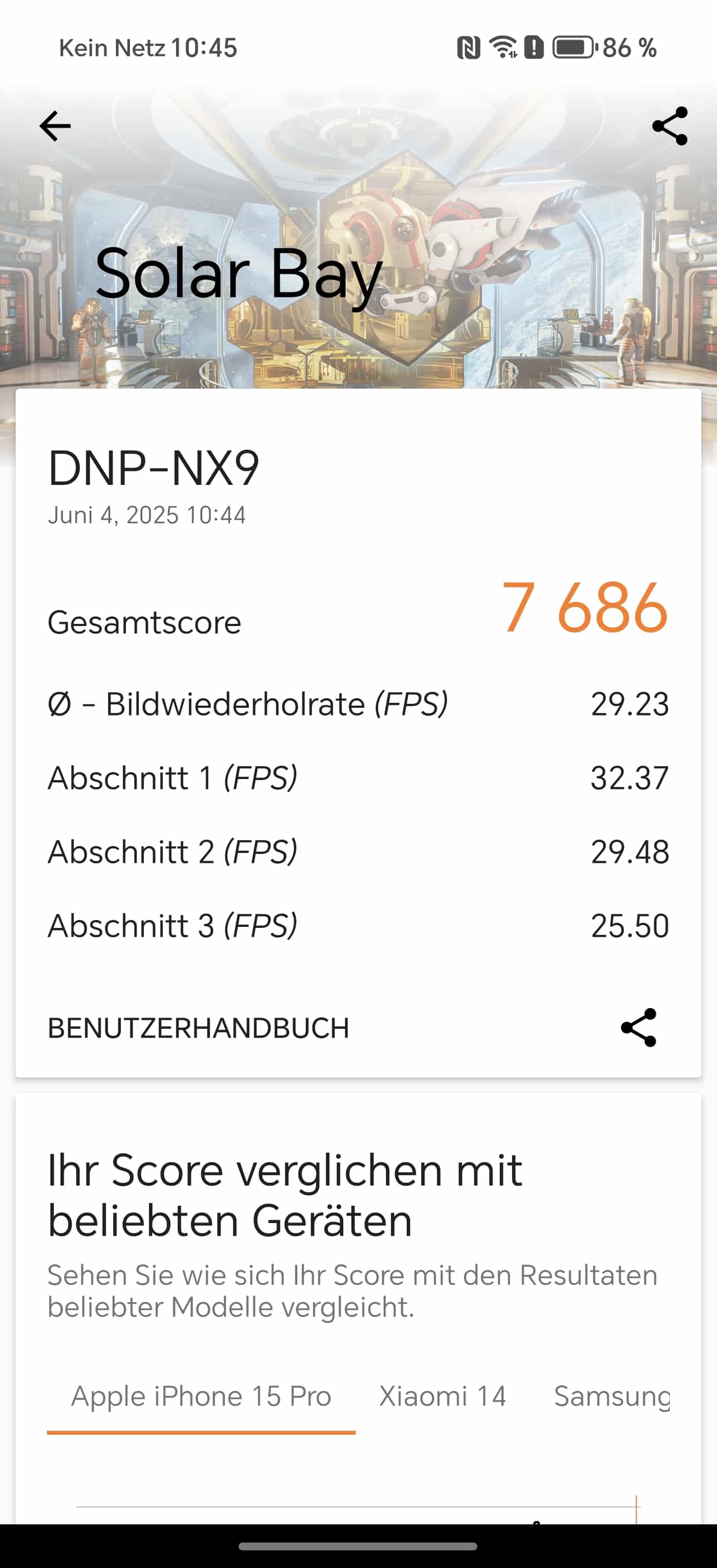 Schwächen zeigen sich dennoch einmal mehr im Belastungstest, in dem der 3DMark Steel Nomad Light-Benchmark 20-mal hintereinander durchläuft. Hier kommt das HONOR 400 Pro „nur“ auf rund 76 Prozent – immerhin deutlich besser als seinerzeit das HONOR 200 Pro (65 %), aber weit entfernt von der Spitze. Die Leistung reduziert sich also nach zehn Durchläufen merklich.