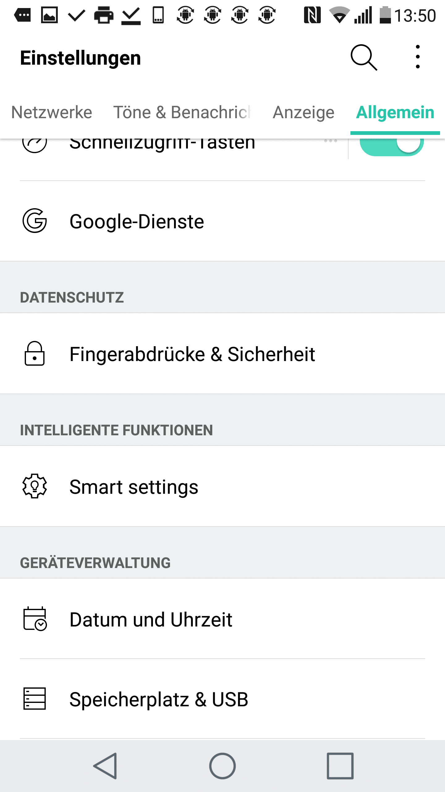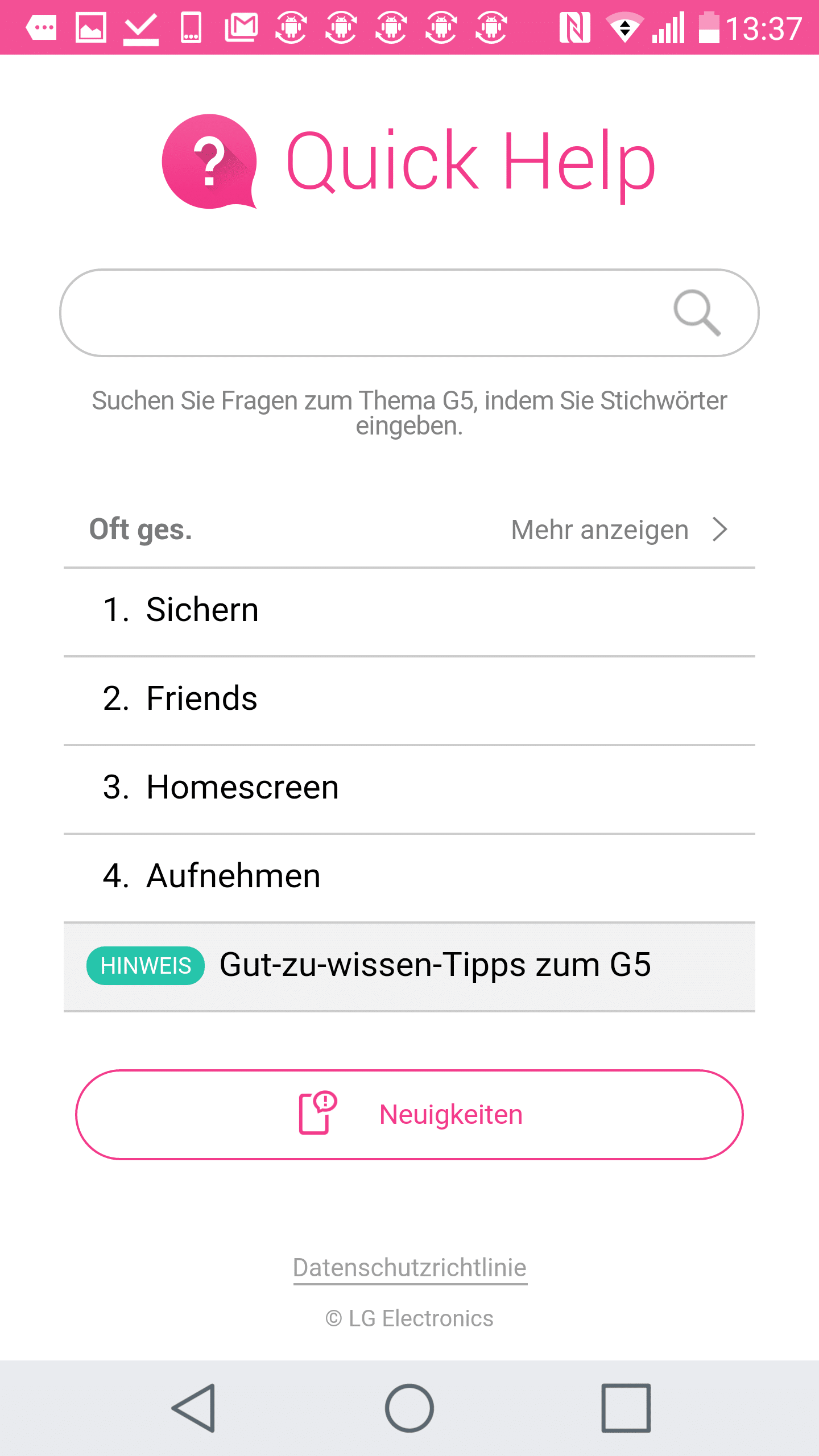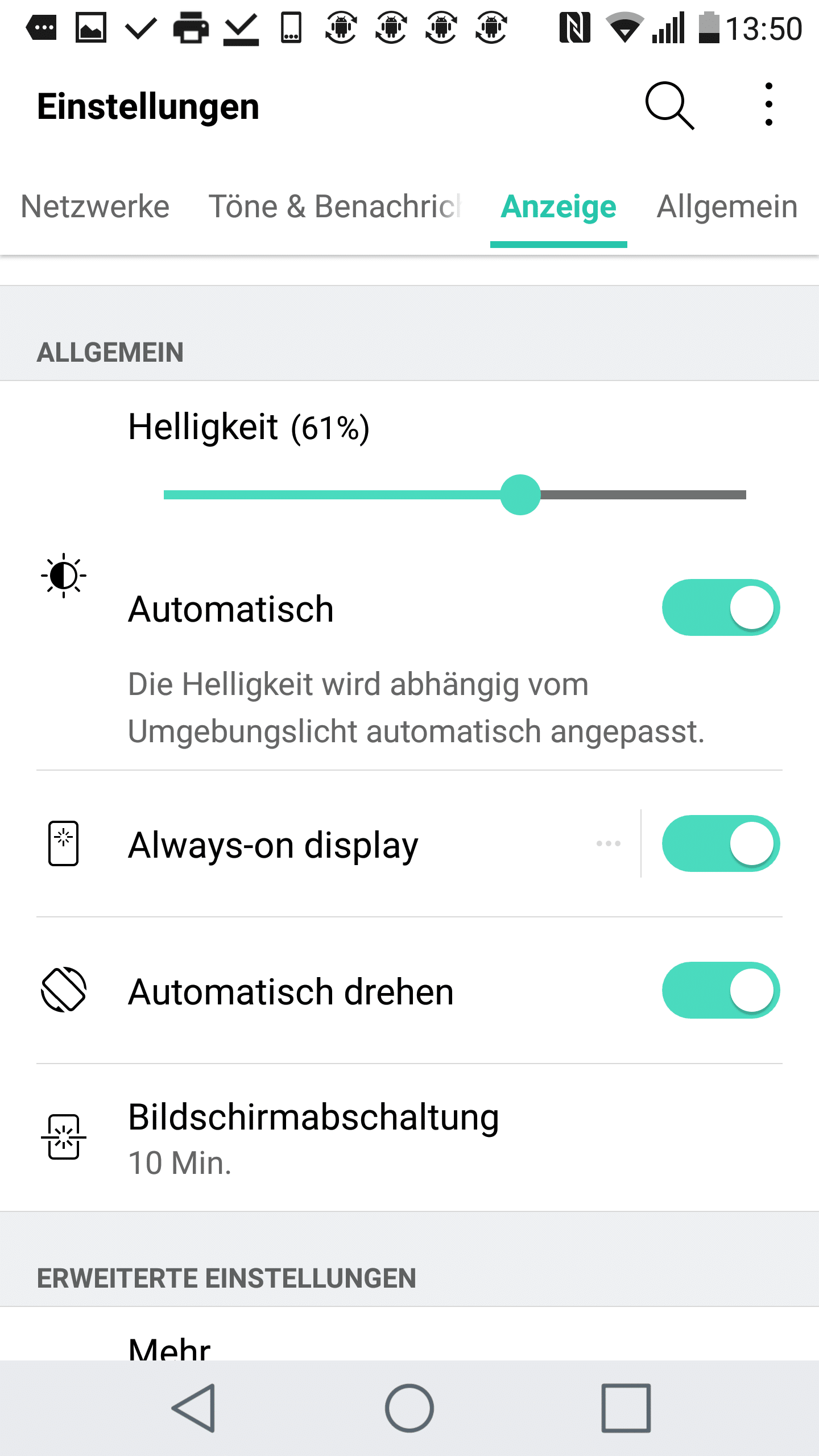 Mit dem Always-on-Display bietet LG ein schönes Display-Feature, welches ähnlich wie die Kanten bei Samsungs Edge-Reihe ist – es leuchtet immer. Bei LG ist das obere Drittel des Displays dauerhaft beleuchtet, da beim IPS-Panel die Pixel nicht einzeln ansteuerbar sind. Dadurch muss jedoch die Leuchtkraft sehr reduziert werden, wodurch das Always-on-Display bei Sonneneinstrahlung praktisch gar nicht mehr lesbar ist. Dafür zieht das Feature jedoch kaum am Akku, sodass normale Nutzer keinen Unterschied merken würden. Power-User können das Always-on-Display notfalls aber auch deaktivieren um ein paar Prozent mehr rauszuholen. Laut LG werden 0,3 bis 0,8 Prozent Akku pro Stunde für das Feature verbraucht.