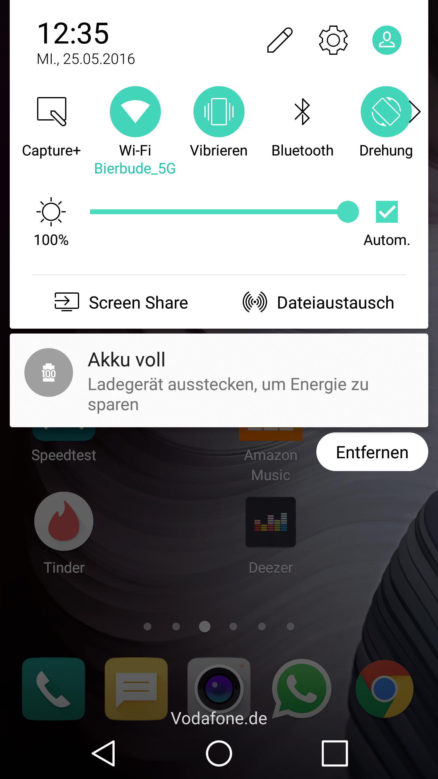 Im Vergleich zu anderen aktuellen Smartphones hat das LG G5 eine niedrige Akkuleistung. Diese liegt bei „nur“ 2.800 mAh. Mir hat der Akku aber dennoch locker über den Tag gereicht, obwohl ich das Smartphone während der Testdauer als einziges Smartphone genutzt habe.