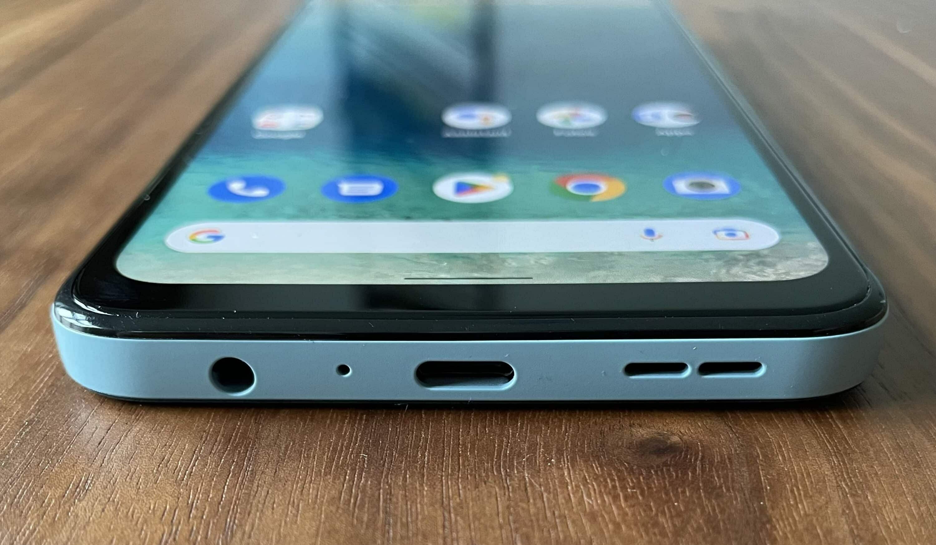 Letzteres dürfte Freunde kabelgebundener Kopfhörer sehr erfreuen. Unser Testgerät kommt in der Farbe Lagoon Blue, die einen sehr edlen Eindruck macht. Alternativ gibt es das G22 auch in einem Grauton (Meteor Grey). Unabhängig der Farbe setzt der Hersteller auf eine glänzende Rückseite. Nach einigen Minuten in den Händen wird schnell klar, warum die Silikonhülle dem Lieferumfang beiliegt. Schließlich zieht die Rückseite Fingerabdrücke geradezu magnetisch an. Rückseitig befindet sich präsent in der Mitte das Markenlogo von Nokia.