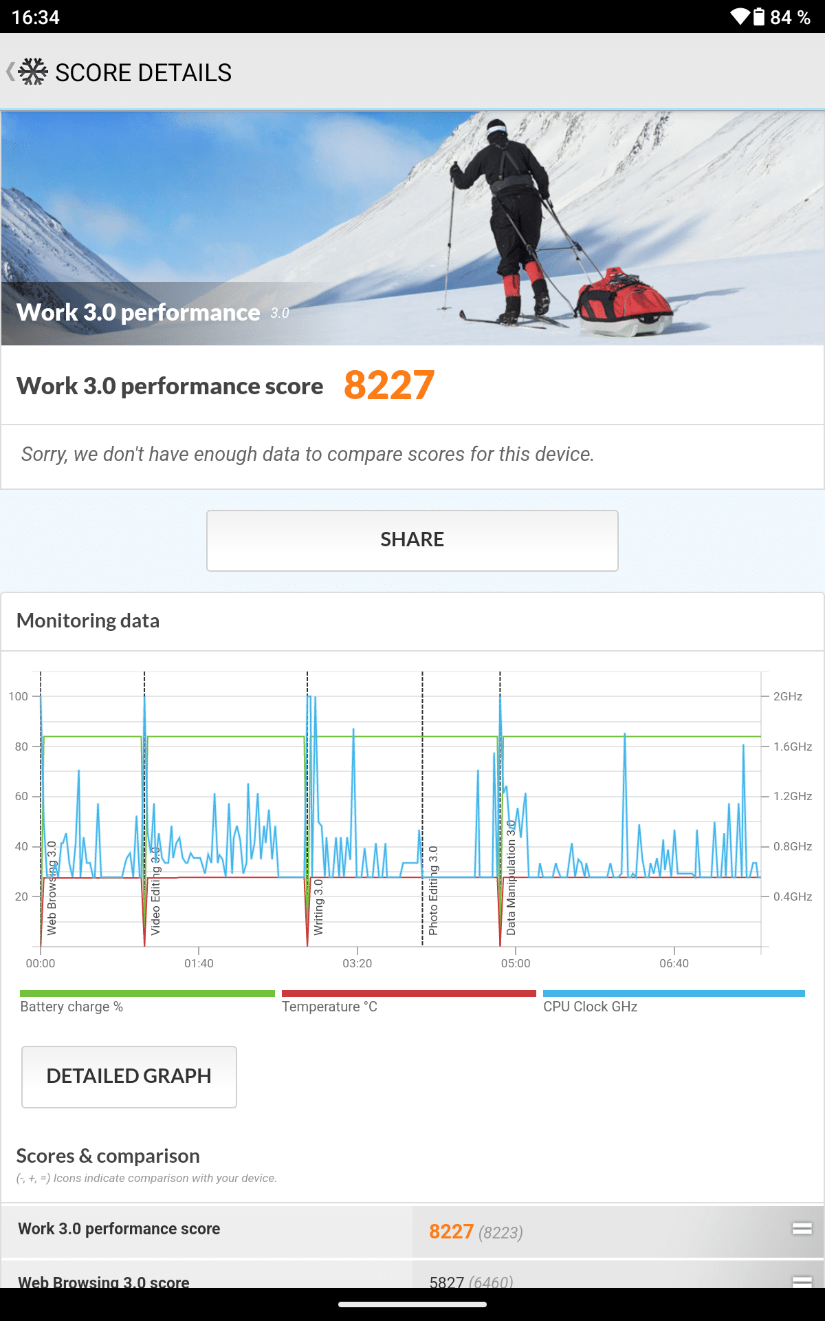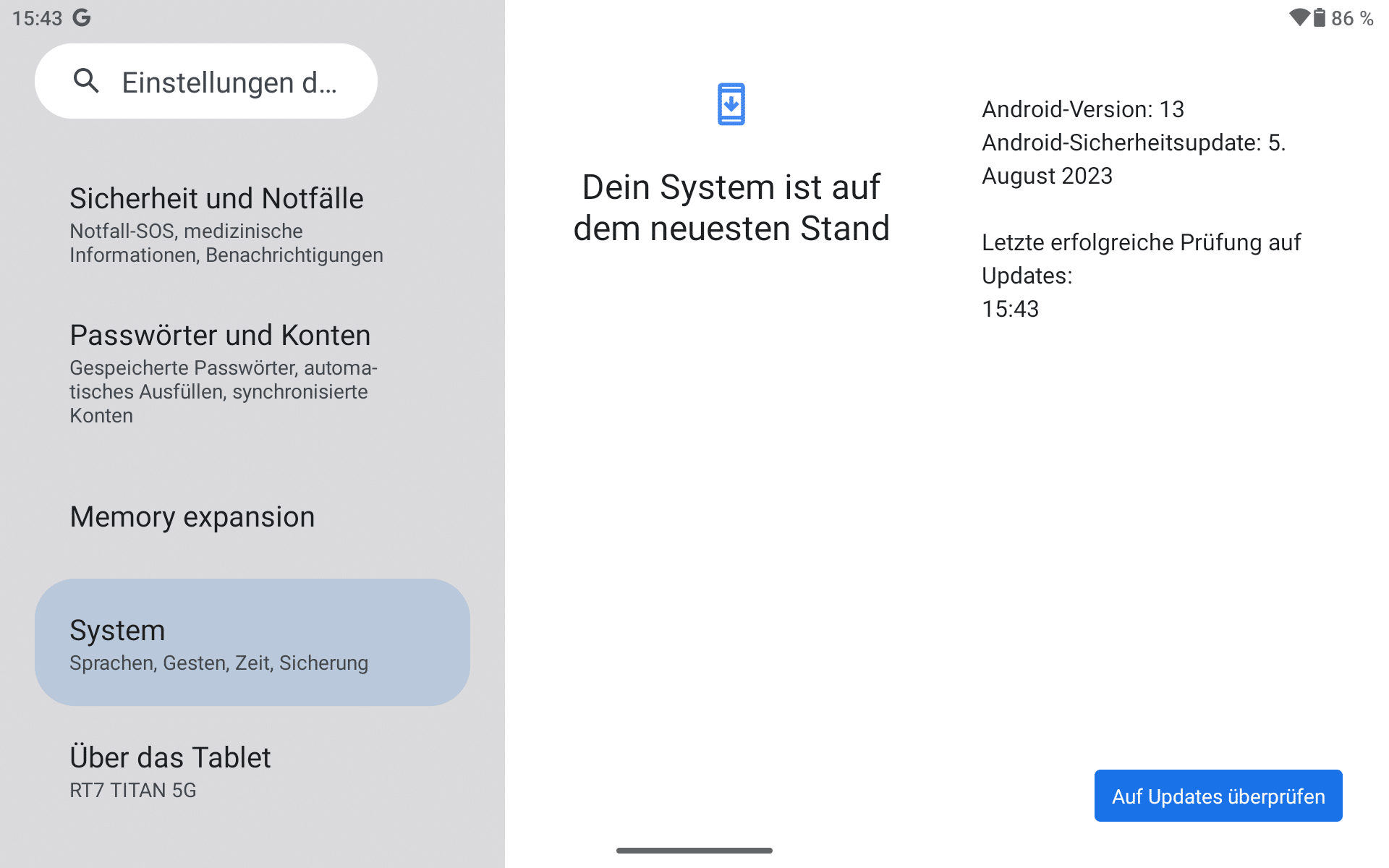 Überzeugend fällt die Systemleistung des mit Android 13 und Sicherheitspatch von August 2023 ausgelieferten Gerätes aus. Die Navigation und Nutzung funktionierten angenehm flüssig und fehlerfrei.