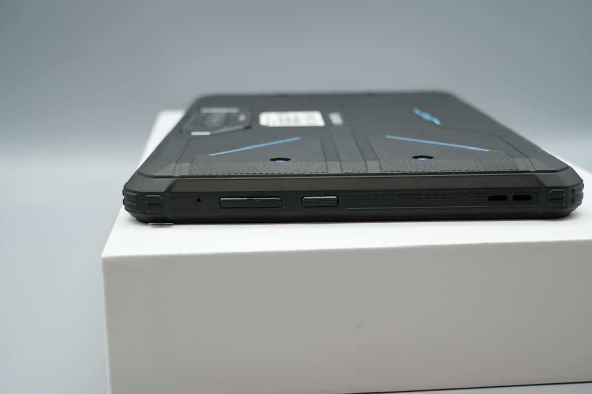 Kein Wunder, weist das nach Militärstandard MIL-STD810H geschützte Gerät doch eine IP68 / IP69K-Zertifizierung auf. Links und rechts sitzen zudem Lautsprecher und Mikrofone, sowie auf der rechten Seite eine Lautstärkewippe und ein angenehm griffiger Power-Button.