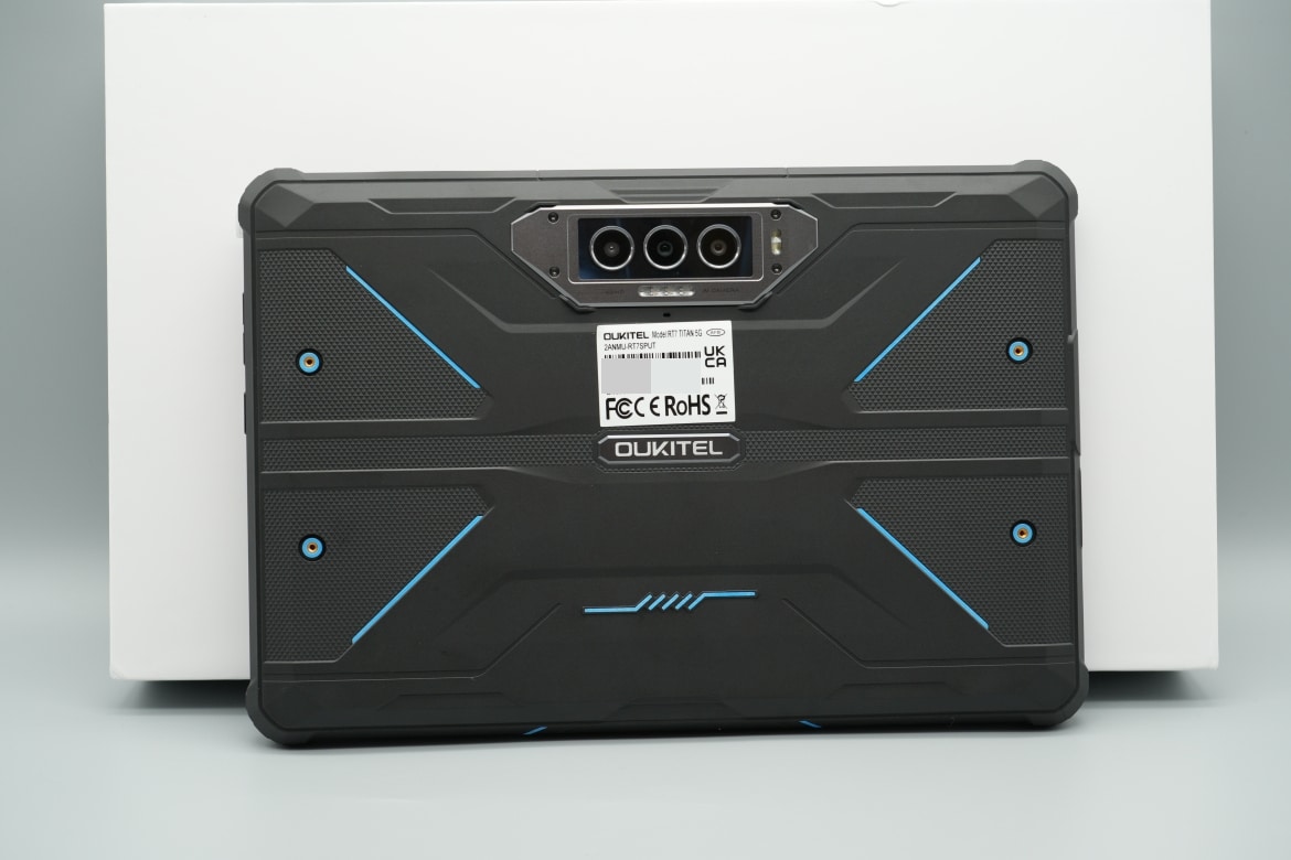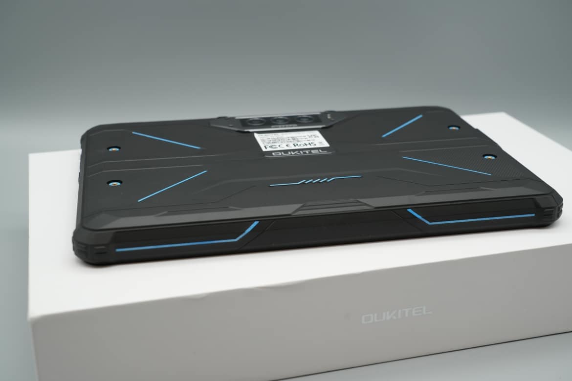 An der Front finden wir das 10,1-Zoll-Display, das leider recht große Displayränder vorweist, sowie die Frontkamera, die auch für die Gesichtserkennung genutzt wird. Hinten, sowie an den Seiten, setzt Outkitel auf eine griffige, gummierte Oberfläche samt blauer Details, dank denen das Tablet trotz des hohen Gewichtes sehr angenehm in der Hand liegt.