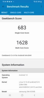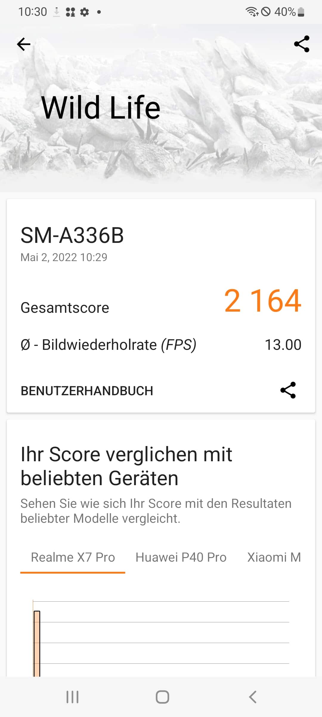 Wir haben insbesondere die Ergebnisse in Geekbench und 3DMark unter die Lupe genommen. Während der erste Benchmark die allgemeine Prozessorleistung abbildet, spielt beim zweiten eher die Grafikleistung eine Rolle. Im 3DMark Wild Life punktet das Galaxy A33 5G mit 2.164 Punkten. Damit ist es in etwa auf einer Stufe mit dem Galaxy M33 5G. Wir gehen davon aus, dass beide über denselben Prozessor verfügen. Im Geekbench punktet das A33 5G hingegen mit 683 Punkten (Single-Core) und 1.628 (Multi-Core). Während das Mittelklasse-Gerät beim 3DMark besser abschneidet als das vergleichbare Redmi Note 11 Pro+ 5G (1.957 Punkte), ist Xiaomis Smartphone beim Geekbench mit 734 respektive 2.215 Punkten überlegen.