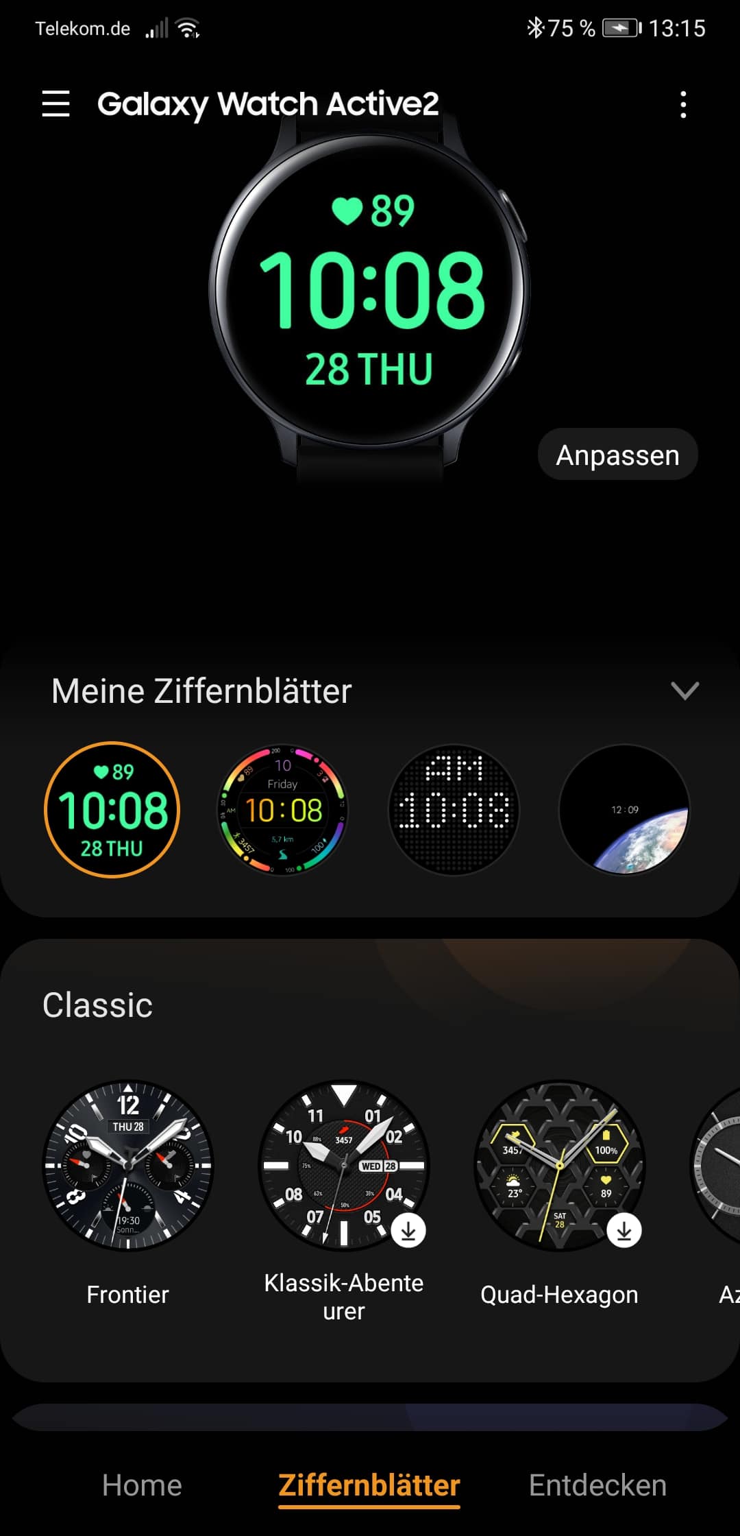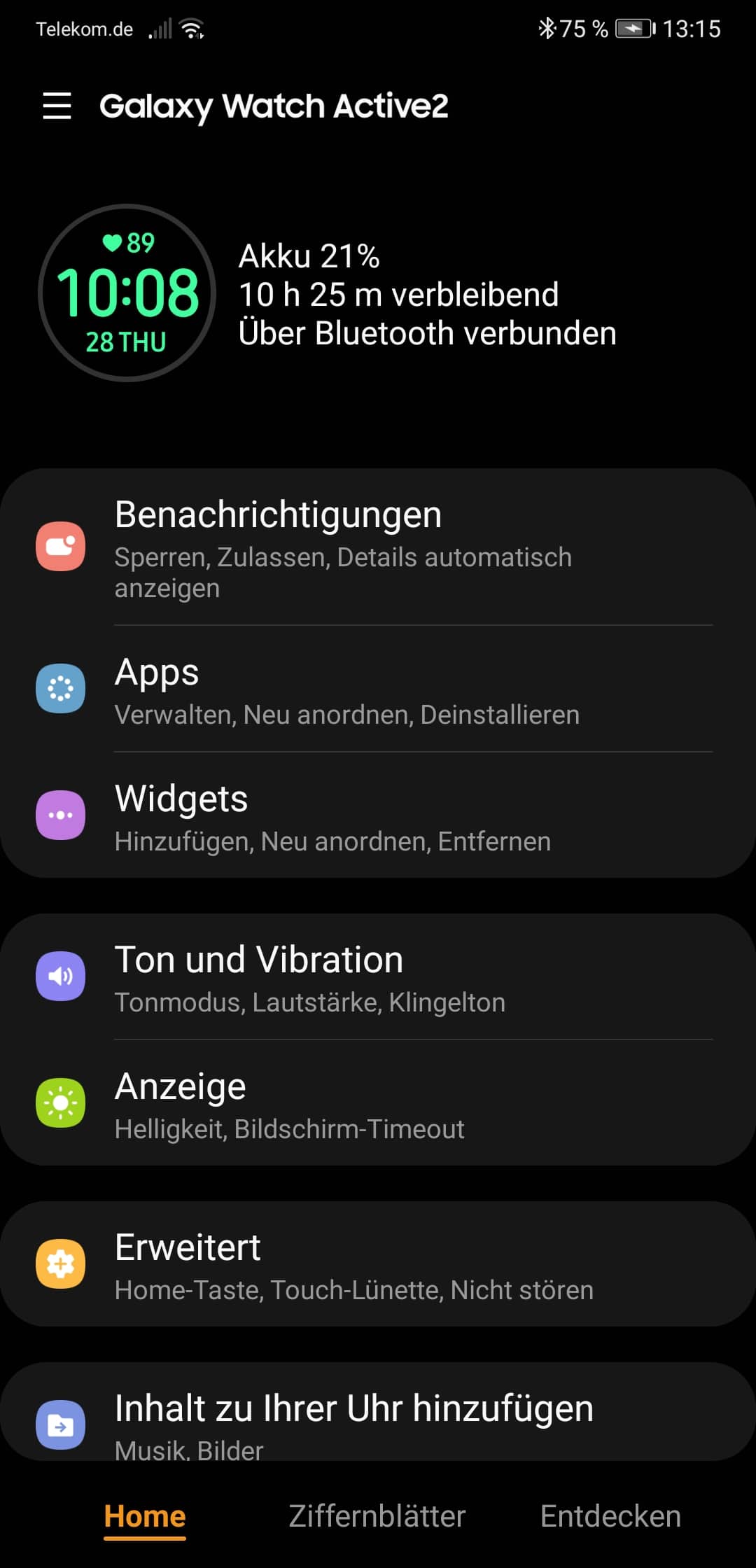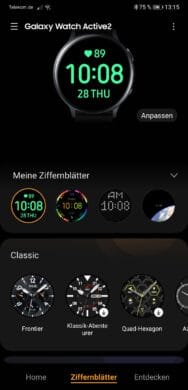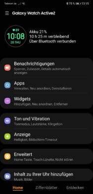 Die Galaxy Wear App ist sehr übersichtlich gestaltet. Auf der ersten Seite „Home“ finden wir bereits alle Einstellungsmöglichkeiten, die wir brauchen. Man hat die Möglichkeit, die gesamte Anzeige über die App zu verändern oder die Reihenfolge der einzelnen Widgets neu anzuordnen. Aber auch die Einstellung genereller Dinge, wie Helligkeit und Ton bzw. Vibration, ist hier kein Problem. Mit dem mittleren Reiter haben wir Zugriff auf Ziffernblätter in allen Formen und Farben, teilweise kostenlos und teilweise auch Kostenpflichtig.