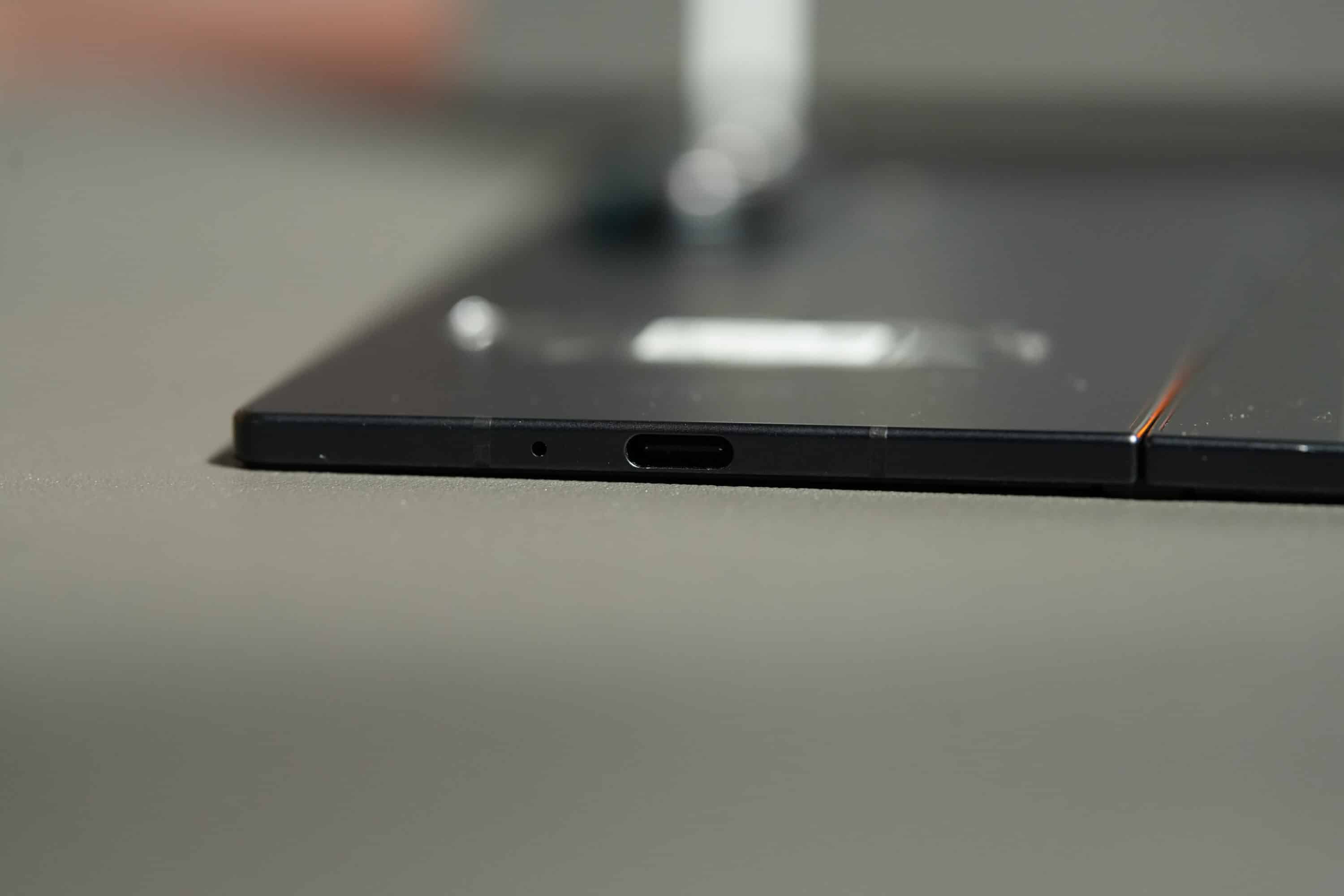 Aufgeklappt ist das Z Fold7 dabei sogar so dünn, dass der Rahmen gerade so Platz für den USB-C-Anschluss bietet. Was mir allerdings nicht gut gefällt ist, wie weit die drei Kamera-Elementen an der Rückseite hervorstehen. Dadurch liegt das Falt-Smartphone sehr wackelig auf Oberflächen auf, wenn man es nicht auf die Displayseite legt.