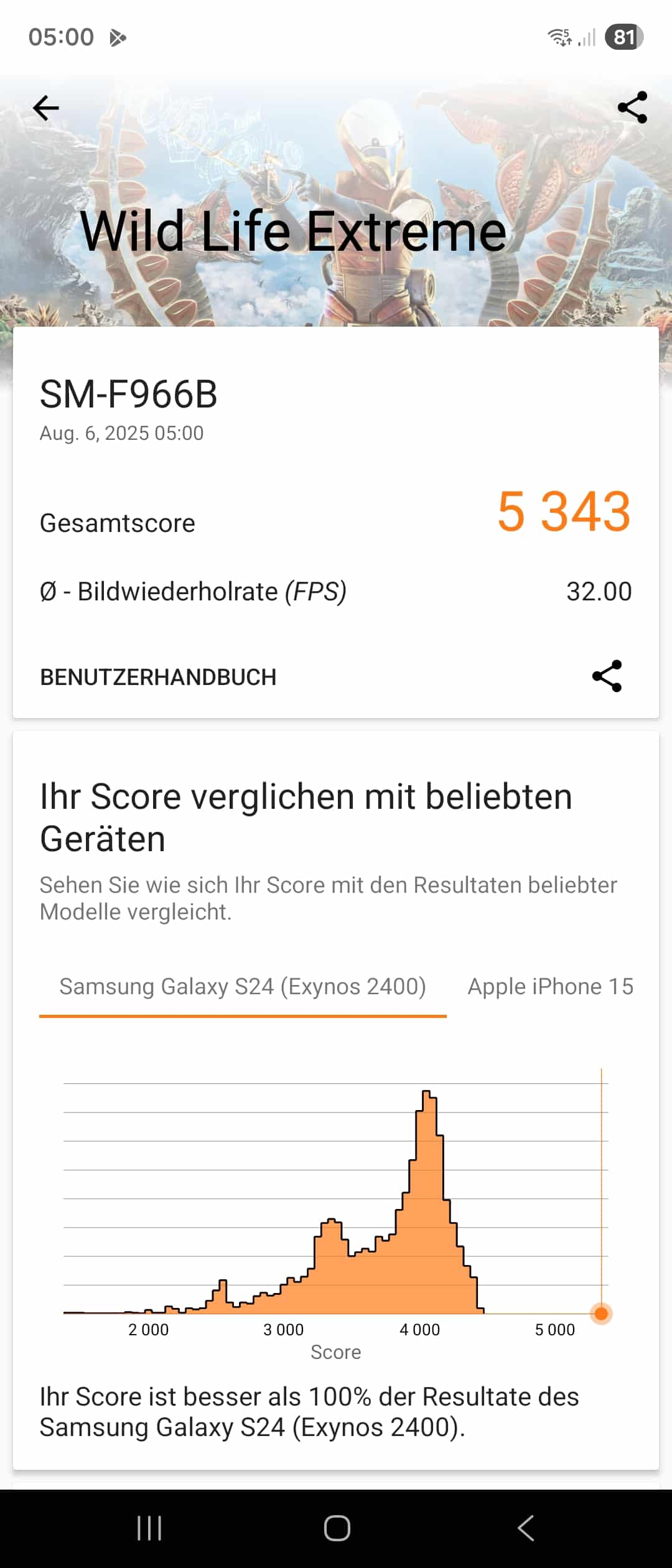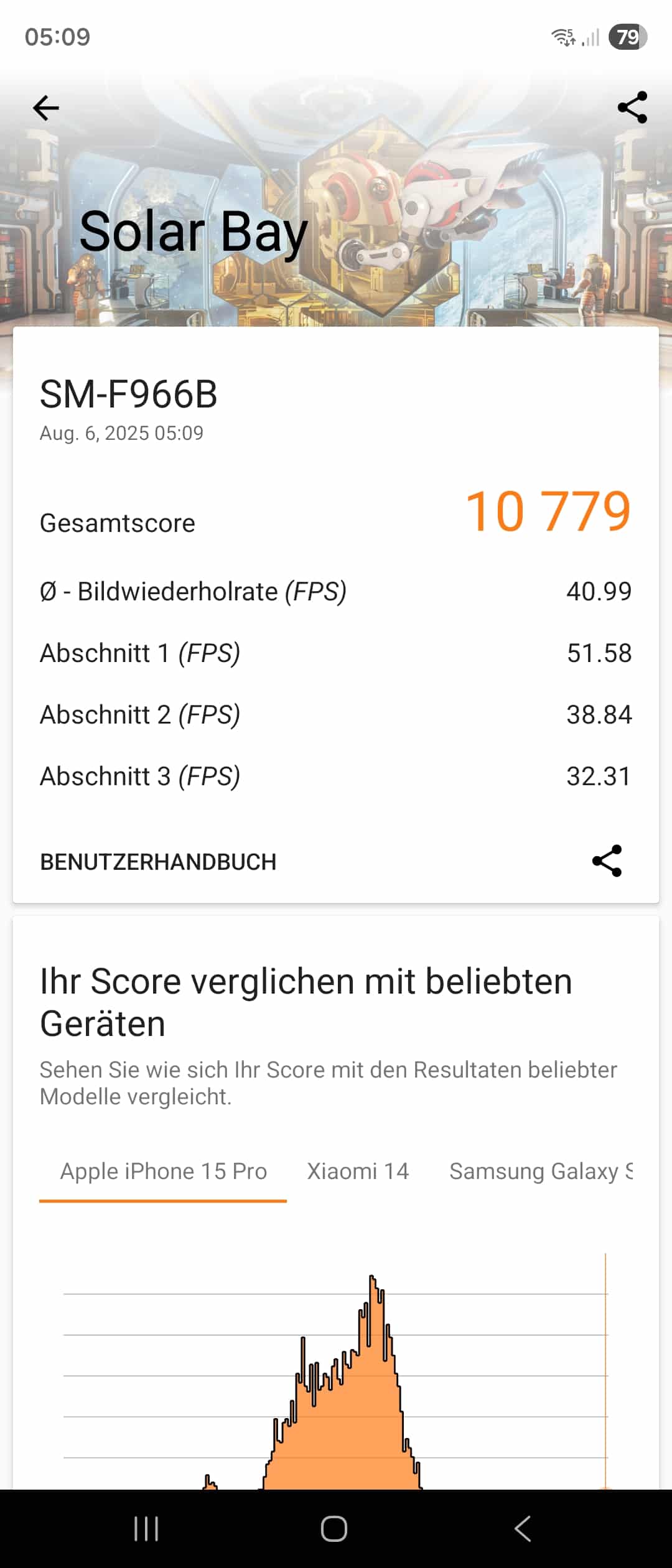 Beim reinen Medienstreaming reiht sich das Z Fold7 aber hinter den Vorgängermodellen Fold6 und Fold5 ein. Dasselbe gilt für das Surfen im Web. Hier muss man deutliche Abstriche im Vergleich zu den aktuellen Flaggschiff-Smartphones wie dem Pixel 9 Pro, Galkaxy S25 Ultra oder iPhoone 16 Pro in Kauf nehmen.