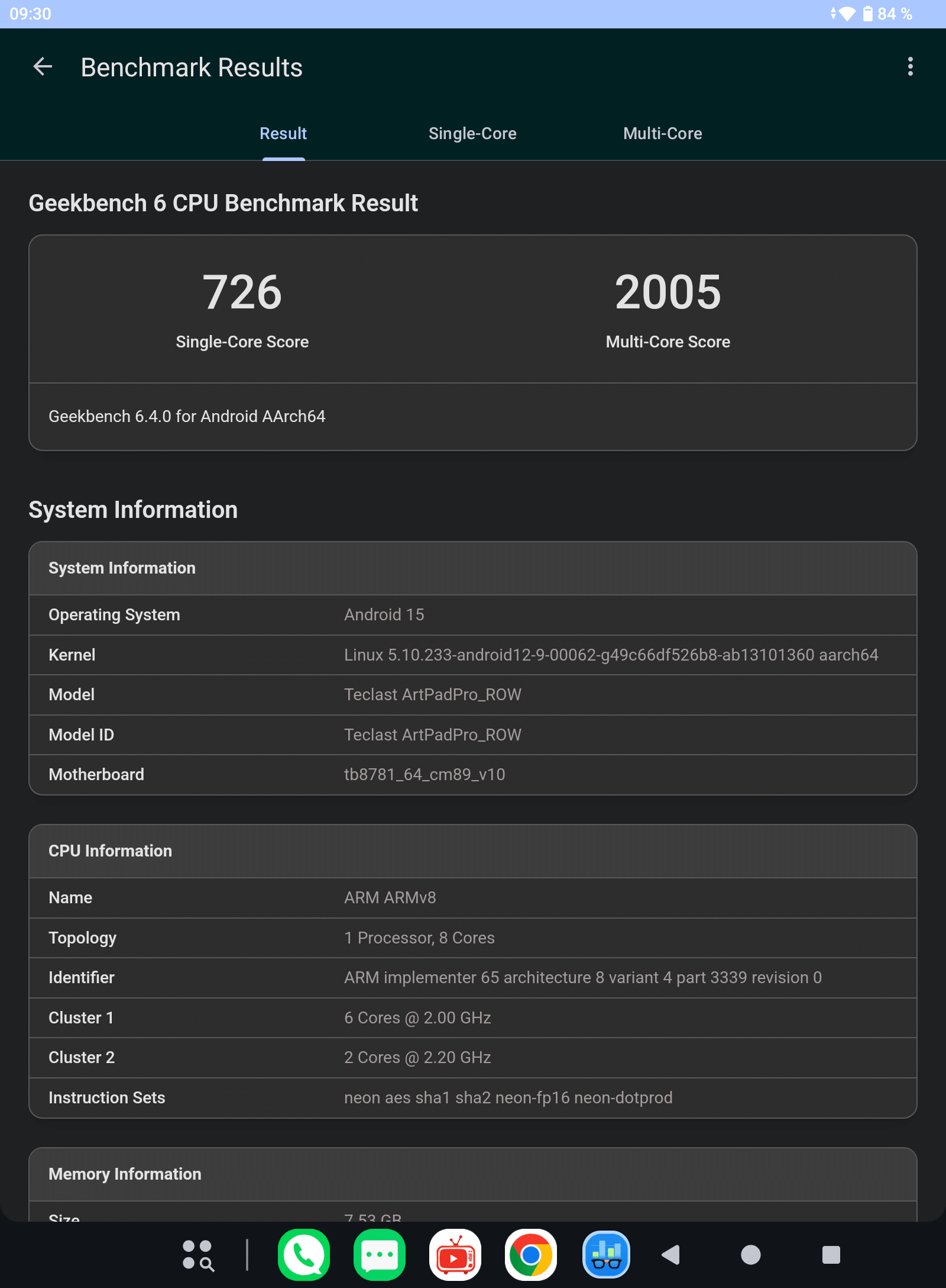| Geekbench 6 Single Core | 726 Pkt. |