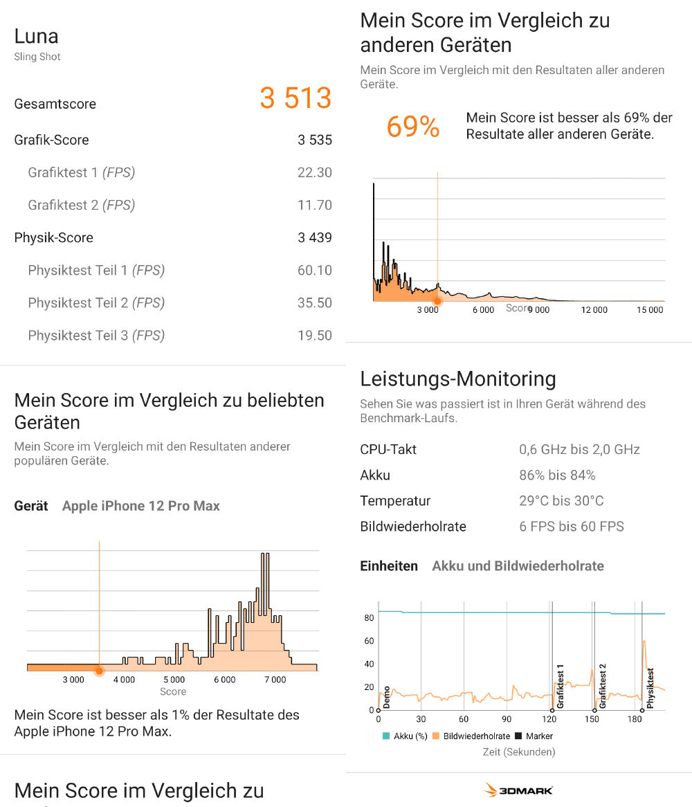 Um die Hardwareleistung für unseren Test des Unihertz Luna einordnen zu können, nutzten wir die Benchmarks Sling Shot von 3DMark, sowie Storage 2.0 und Work 3.0 von PCMark. Beim Benchmark Sling Shot, der die Grafik- und Rechenleistung aktueller Mobilgeräte ermittelt, erreichte das Luna 3513 Punkte, womit es immerhin 69% der anderen Geräte übertraf. Work 3.0 von PCMark testet praktische Aufgaben im Bereich Internetnutzung, Textverarbeitung, Video- und Bildbearbeitung und Datenmanipulation. Hierbei erarbeitete sich das Luna 9015 Punkte. Bei Storage 2.0, der sich speziell den Datenspeicher vornimmt, kamen dank hoher Schreib- und Leseraten von 896 und 808 MB/s 27545 Punkte zusammen.