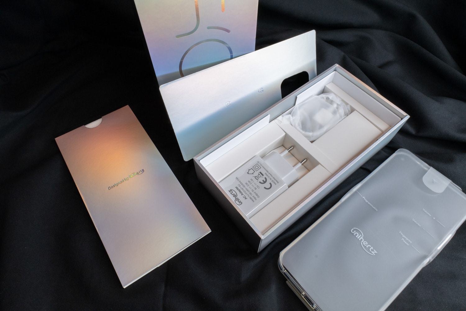 Eine silberfarbene Pappschachtel beherbergt den Lieferumfang des Unihertz Luna. Im Wesentlichen besteht dieser aus dem Mobiltelefon, seiner Schutzhülle und dem Ladegerät. Das kleine Werkzeug zum Öffnen des SIM-Kartenslots befindet sich in jenem Umschlag, in welchem auch die Bedienungsanleitung untergebracht ist.