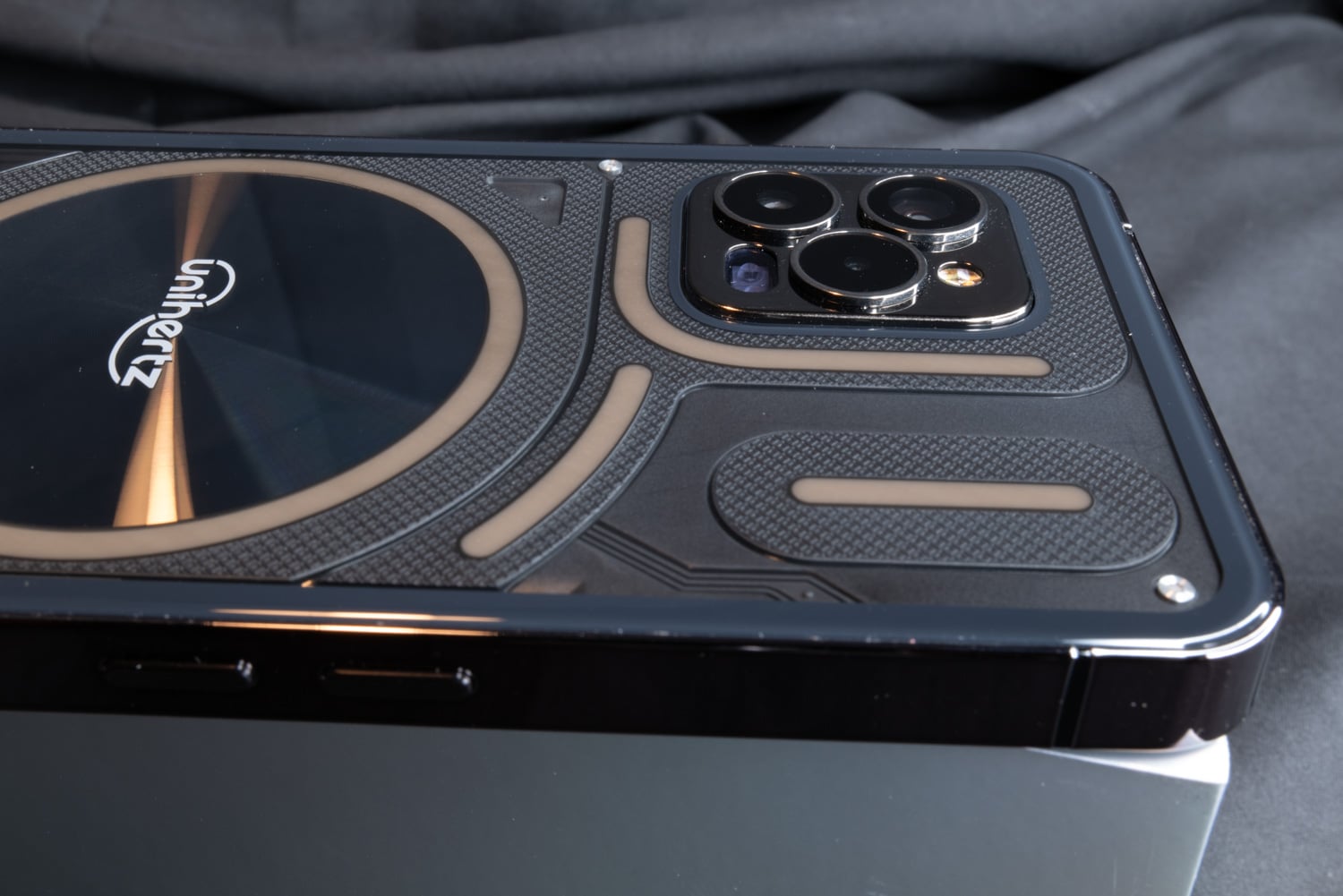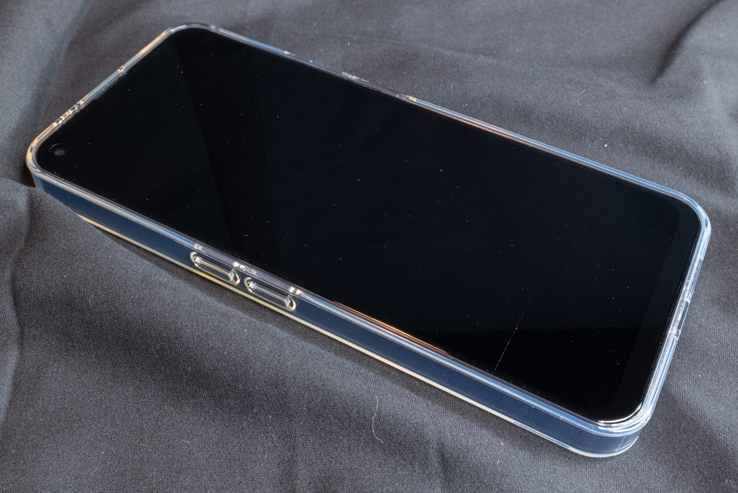 Der Rahmen des Luna besteht aus glänzend schwarzem Metall und ist gerade so glatt, dass die Oberfläche raue Spiegelbilder erzeugt. Die hinteren Kameralinsen sind ebenfalls mit diesem Material eingefasst. Die Rückseite besteht aus diversen Kunststoffen, unter anderem Panda King Glas und die dem Luna beiliegende Schutzhülle aus TPU, also thermoplastischem Polyurethan und ist daher relativ weich und flexibel.