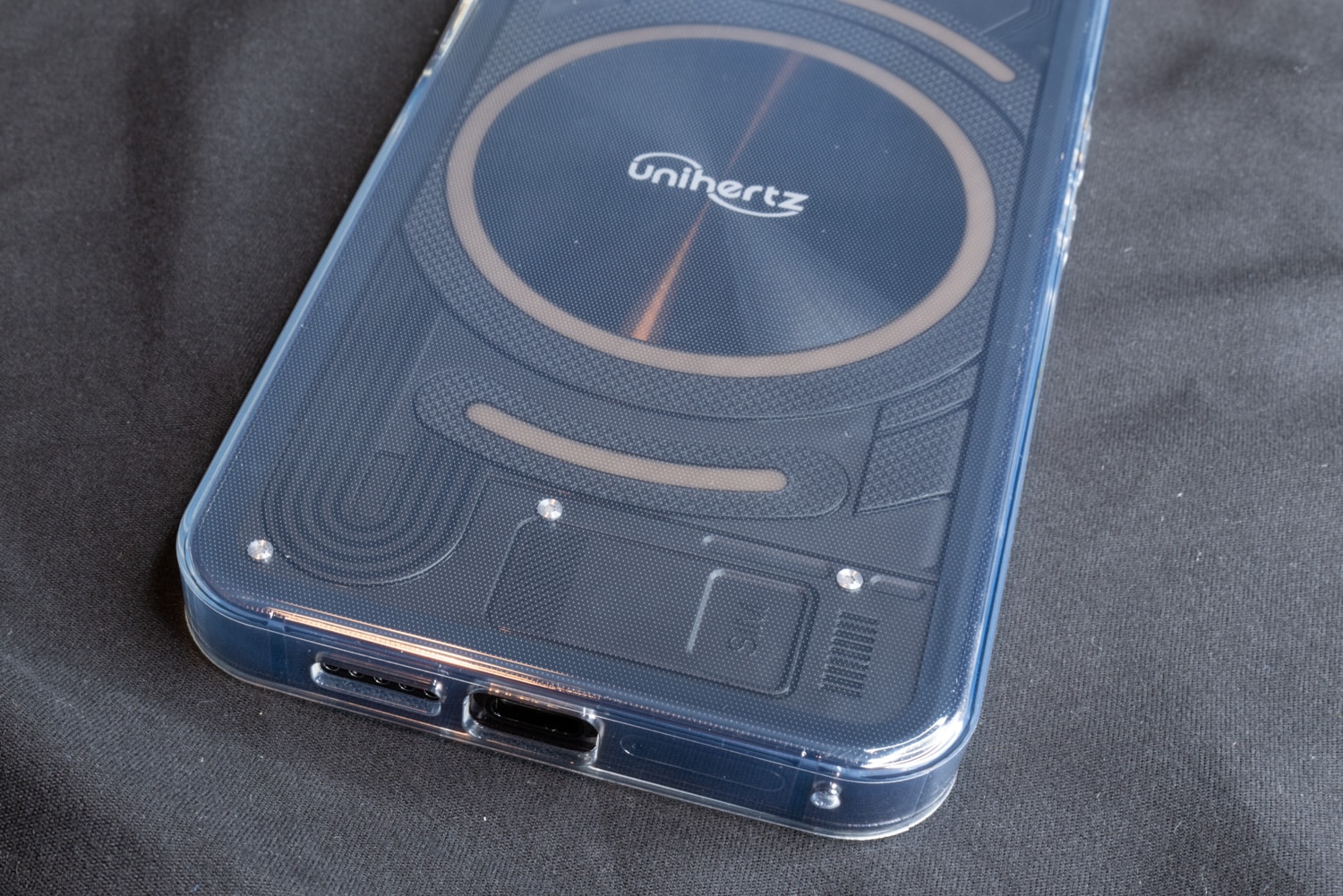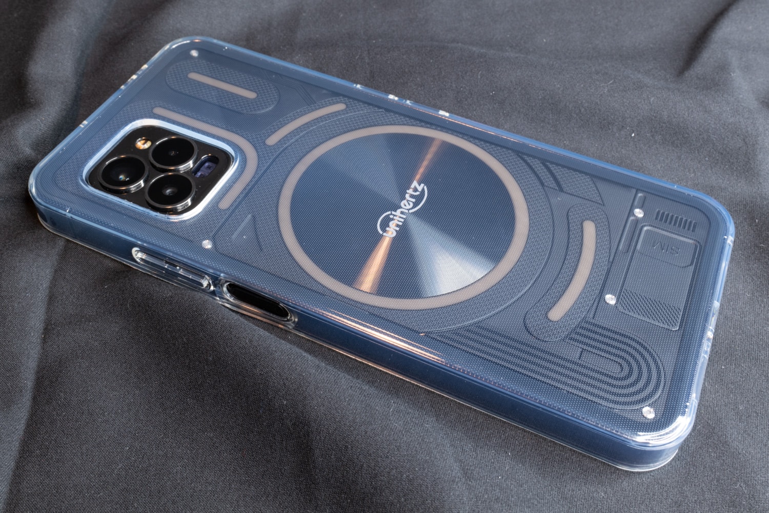 Die Kameralinsen auf der Rückseite stehen um etwa 1,5 mm von der Oberfläche ab. Durch die transparente Rückenplatte hindurch ist ein auffällig gestaltetes Panel zu sehen, dessen Formen und Muster mutmaßlich an ein fiktionales Industriedesign angelehnt sind. Vom hinteren Panel eingerahmt werden auch die 5 überwiegend kurvigen RGB-LED-Streifen, die sich über das Betriebssystem ein- und ausschalten und anpassen lassen.