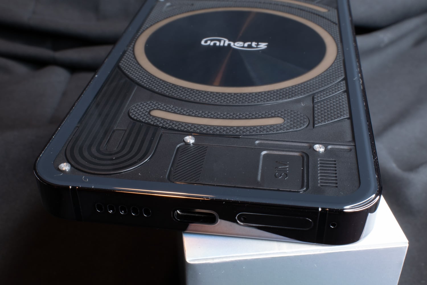 Im Rahmen untergebracht sind auf der Unterseite der USB-C-Anschluss, der Slot für zwei SIM-Karten im Nano-Format, eine kleine Öffnung für das Mikrofon und der Lautsprecher für die Medienwiedergabe. Die Oberseite beherbergt Infrarotsender und 3,5-mm-Klinkenanschluss.