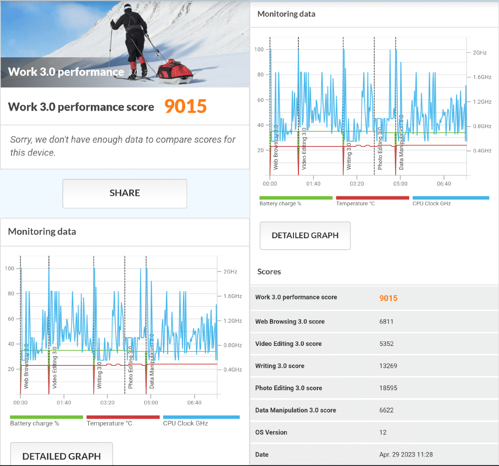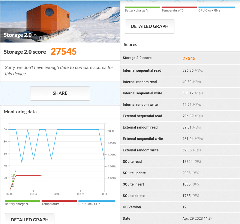 Ein Blick in die Bestenlisten offenbart, dass es sich beim Storage 2.0 Benchmark im Bereich des Xiaomi Redmi K50i oder Huawei Honor 80 bewegt. In der Work 3.0 Rangliste schnitt es besser ab als das Xiaomi Poco M5 oder Samsung Galaxy A72, aber etwas schlechter als das Unihertz Tank.