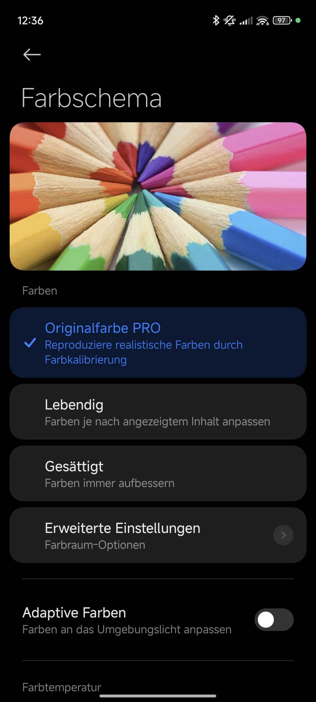 Die Auflösung kann zudem im Menü auf Full-HD+ heruntergeregelt werden, was sich positiv auf die Akkulaufzeit auswirkt, ohne dass dabei subjektiv die Bildqualität darunter leiden würde. Gleichzeitig kann das Display enorm detailliert eingestellt werden. Das umfasst beispielsweise die Helligkeit, erweiterte Texturen, einen dedizierten Lesemodus oder verschiedene Farbmodi, deren Farbraum und Temperatur zudem individuell angepasst werden kann. Top!