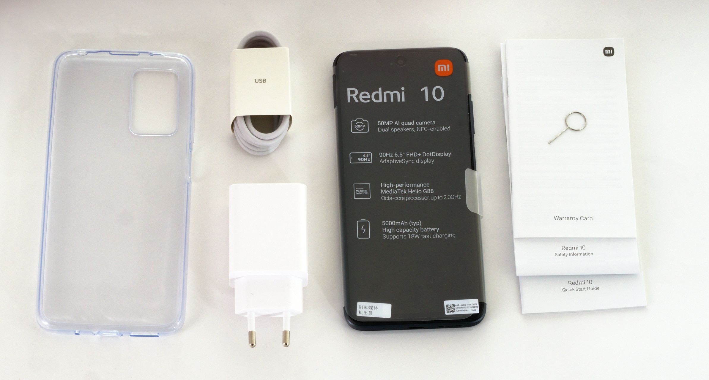 Das Xiaomi Redmi 10 wird in einer typischen Smartphone-Pappverpackung geliefert. In dieser befinden sich, neben dem Smartphone selbst, ein Öffnungsschlüssel für das SIM-Fach, ein USB-Netzteil, ein USB-C-Ladekabel mit einer Länge von 1,0m, die üblichen Anleitungen und Garantiehinweise sowie eine transparente Silikonhülle. Der Lieferumfang ist somit vergleichbar zu dem anderer Geräte.