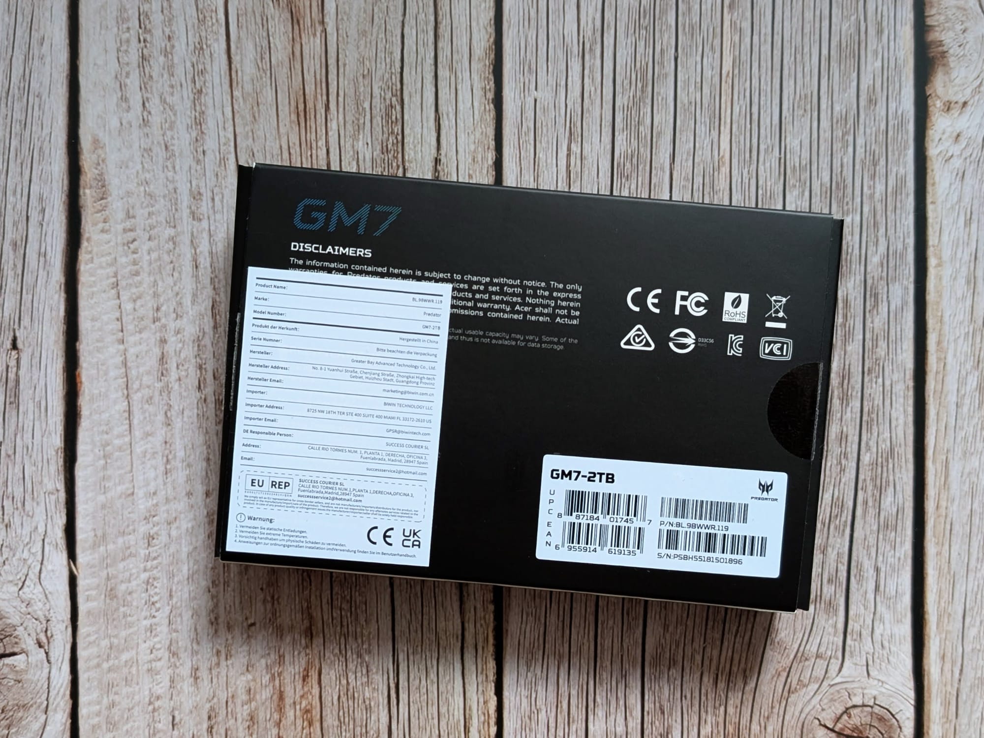Die Acer Predator GM7 wird in einem kompakten schwarzen Karton geliefert. Auf der Vorderseite befinden sich ein Bild der SSD sowie Angaben zur Kapazität, Schnittstelle und Schnittstellenprotokoll. Auf der Rückseite befinden sich weitere Informationen wie die Modellbezeichnung und die Modellnummer. Die SSD selbst ist nicht sichtbar. Der Karton enthält die SSD und eine Schraube zur Montage der SSD.