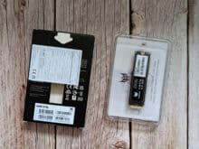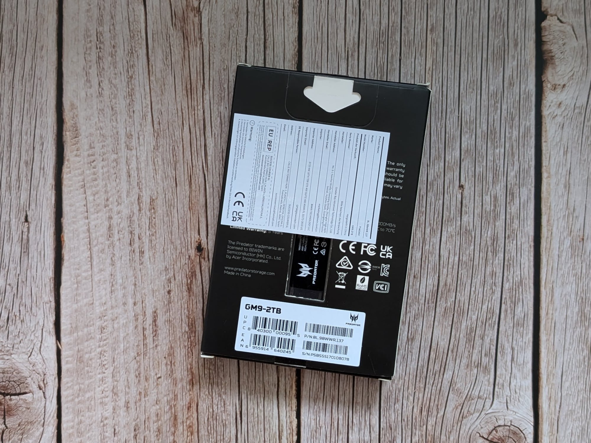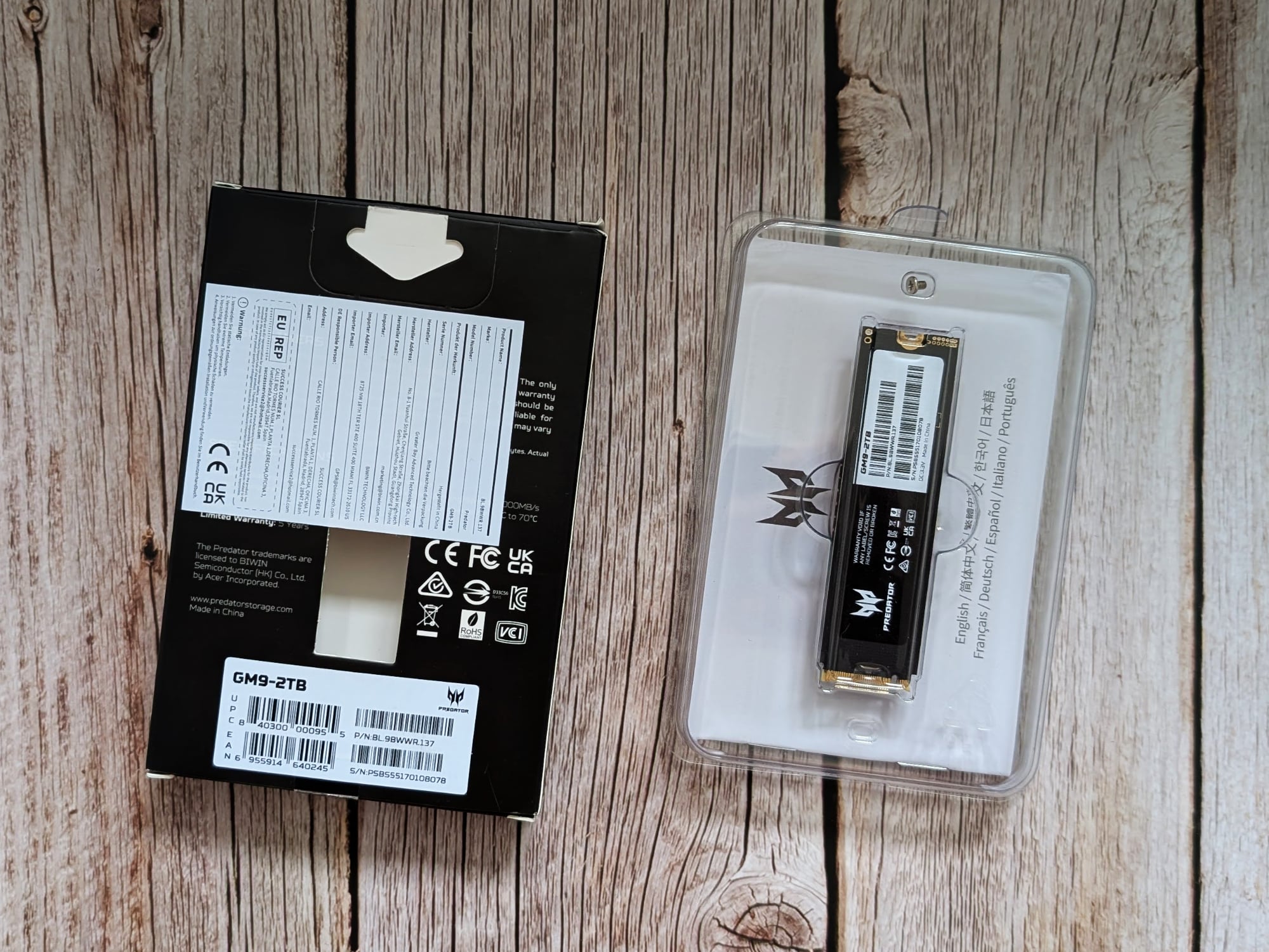 Die Acer Predator GM9 wird in einem kompakten schwarzen Karton geliefert. Auf der Vorderseite befinden sich ein Bild der SSD sowie Angaben zur Kapazität und Schnittstelle. Auf der Rückseite befinden sich weitere Informationen wie die Modellbezeichnung und die Modellnummer. Die SSD selbst ist zudem durch einen Ausschnitt auf der Rückseite des Kartons sichtbar. Der Karton enthält die SSD, ein Wärmeleitpad aus Graphen und Kupfer sowie eine Schraube zur Montage der SSD.