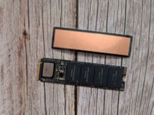 Die Platine der SSD ist schwarz und einseitig mit Chips bestückt. Die bestückte Vorderseite ist nicht von einem Aufkleber bedeckt. Die unbestückte Rückseite ist von einem schwarz weißen Aufkleber bedeckt, auf dem die Modellbezeichnung, die Modellnummer, die Kapazität und weitere Angaben zu finden sind.