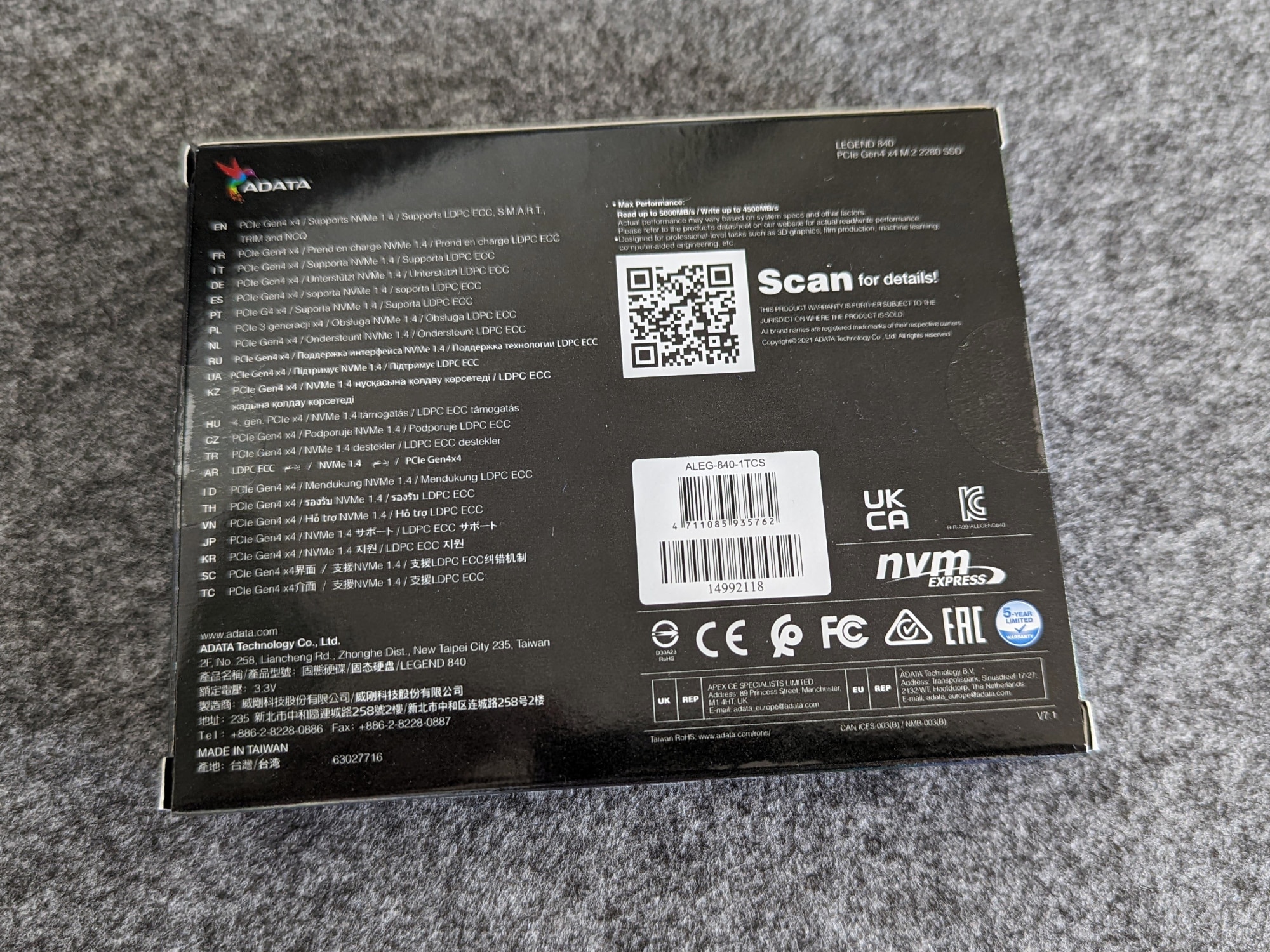 Adatas Legend 840 kommt in einem Hochglanzkarton, der von den Maßen her an den einer 2,5″-SSD erinnert. Auf der Vorderseite finden wir neben einem Foto der SSD samt grauem Kühlkörper Informationen zur PCIe-4.0-Schnittstelle und der Kapazität. Auf der Rückseite befinden sich Informationen zur Geschwindigkeit und ein QR-Code, der zu den technischen Daten führt.