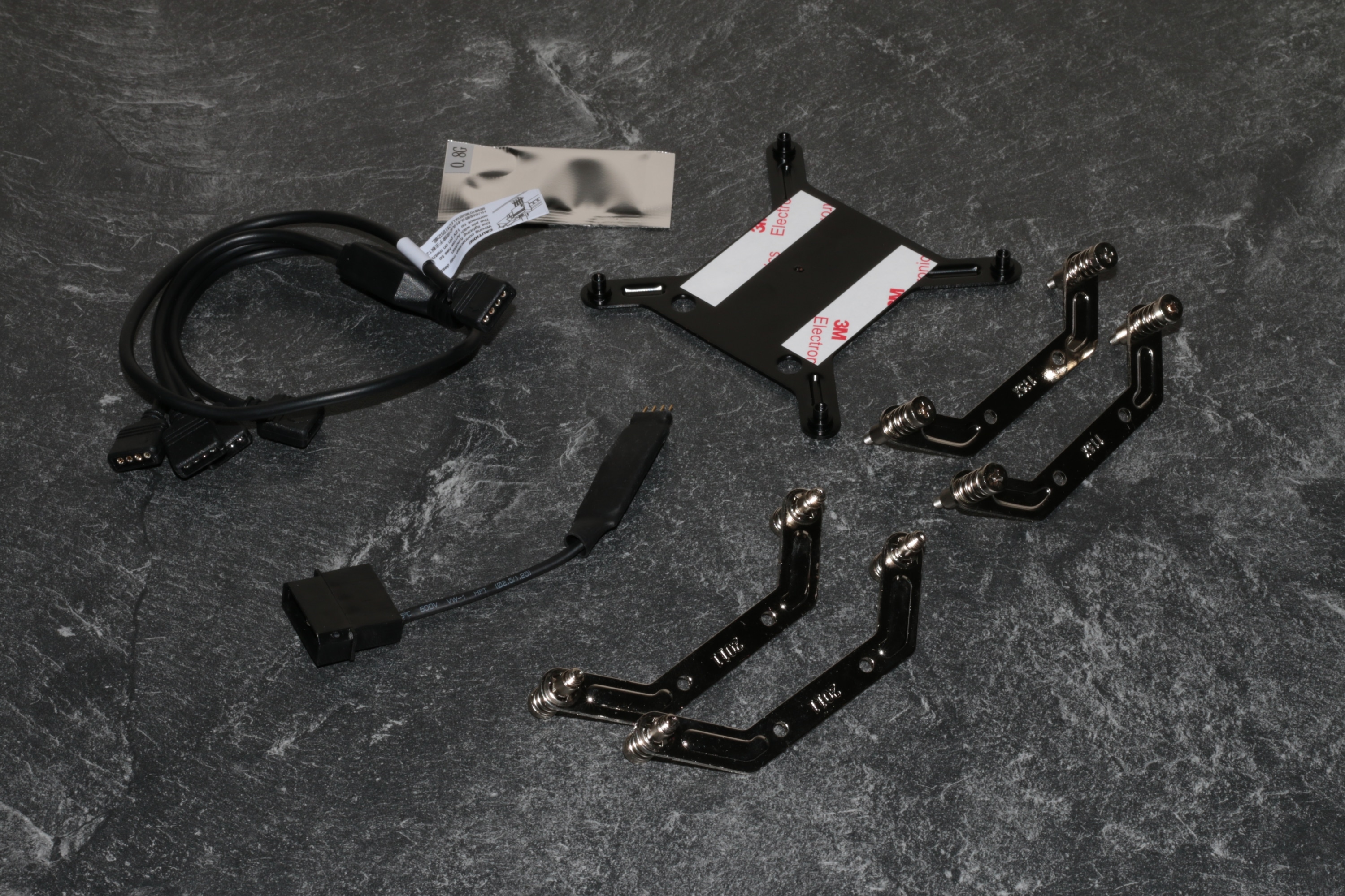 In den beiden zusätzlichen Verpackungen befinden sich eine Backplate, ein Intel- sowie ein AMD-Retention-Modul, eine Tüte mit Wärmeleitpaste, ein Splitterkabel für weitere LED-Streifen oder Lüfter und natürlich das Steuermodul für die Beleuchtung des Lüfters. Auffällig hierbei ist, dass die Backplate über zwei kleine Klebestreifen verfügt, womit sie absolut sicher an der Rückseite des Mainboards hält. Dadurch lässt sich die Montage des kompletten Kühlers wesentlich einfacher gestalten, da die Backplate nicht zwingendermaßen mit einer Hand an Ort und Stelle gehalten werden muss.