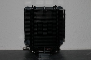 Grundlegend kommt der Kühler im klassischen Tower-Format daher, der mitsamt des serienmäßig installierten Lüfters 130 x 159 x 74 mm (B x H x T) misst. Dank der sogenannten Heatpipe-Direct-Touch-Technologie (H.D.T.) stehen die Heatpipes in direktem Kontakt zum Heatspreader der CPU, wodurch die Wärmeübertragung deutlich verbessert werden kann. Unterstützt von vier 6 mm starken Doppel-Heatpipes wird für optimale Wärmeverteilung gesorgt, welche die Wärme an insgesamt 49 Aluminiumlamellen ableiten. Eine mittig platzierte „Shock Killer Pole“ soll zudem mehr Stabilität gegen das Verbiegen der Alu-Lamellen bringen und zudem Stöße während des Transports abfangen.