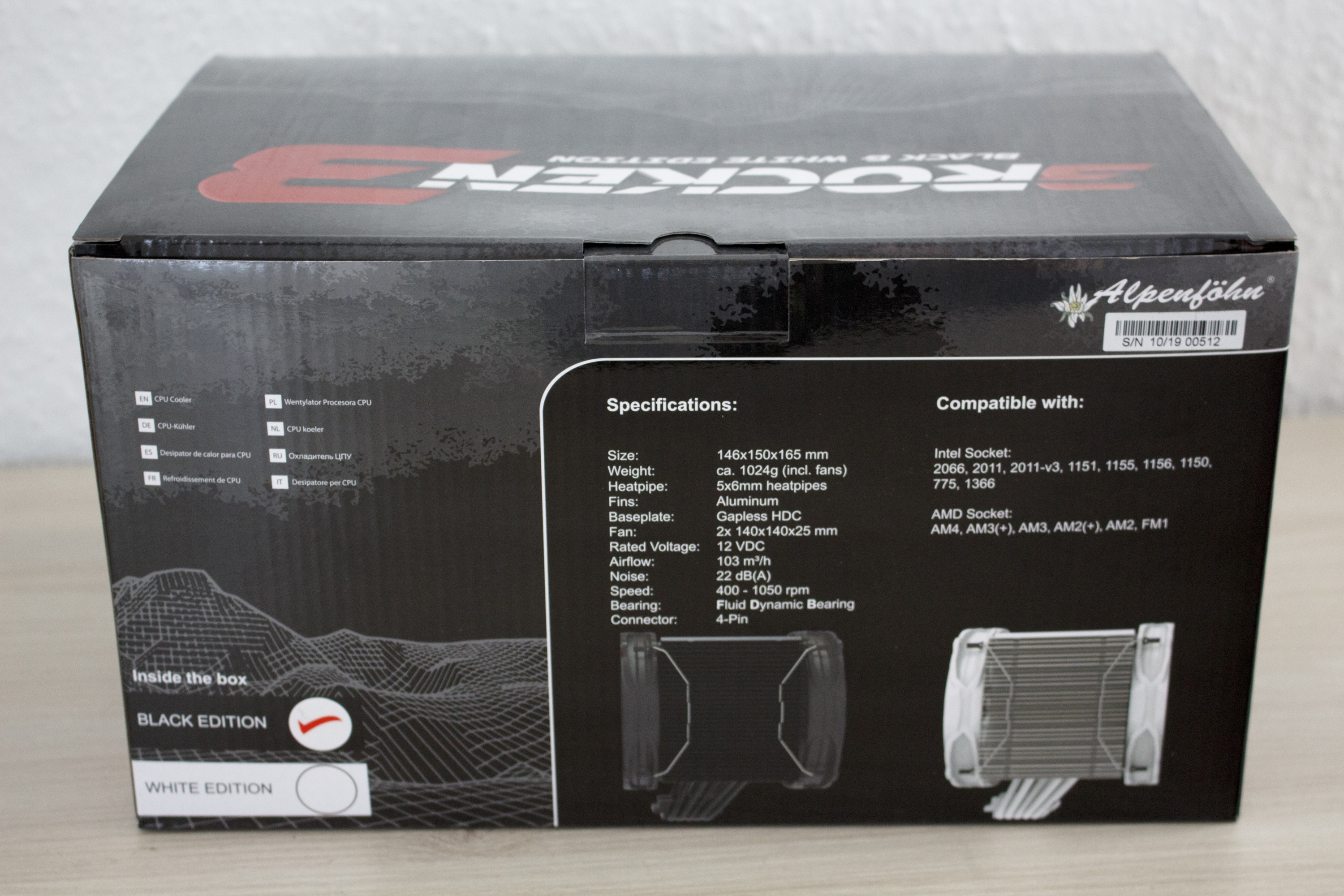 Der Brocken 3 Black Edition kommt in einem sehr großen Karton aus Pappe. Dieser ist bunt bedruckt und enthält jede Menge Informationen über den Kühler bzw. die Lüfter. Außerdem sind beide Farbvarianten des Kühlers auf dem Karton zu sehen. Alle Angaben sind in englischer Sprache verfasst.