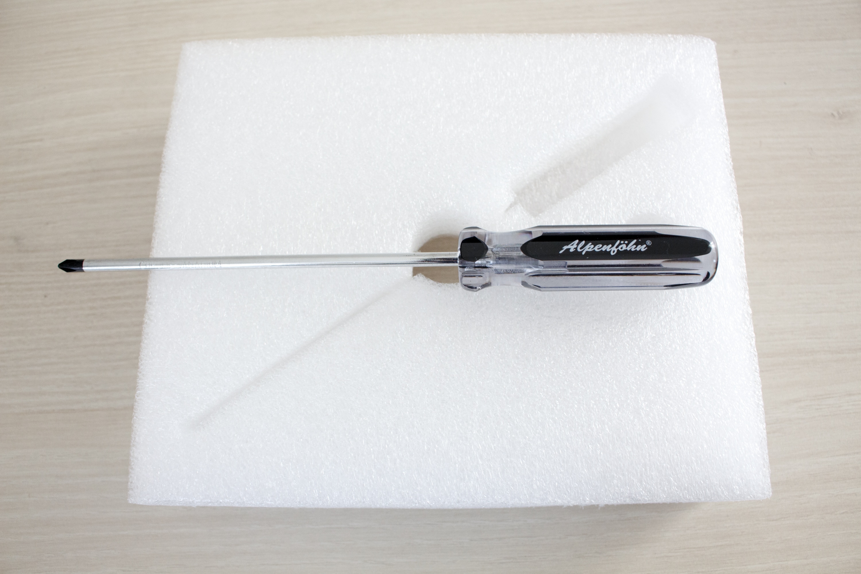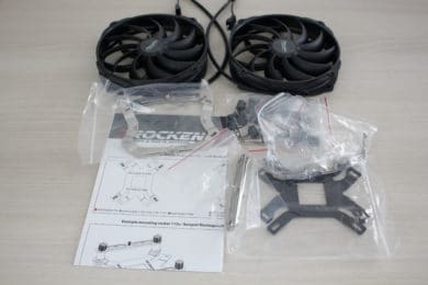 Packt man den Inhalt innerhalb des Kartons aus, dann findet man den Kühlkörper, zwei Lüfter, einen Schraubendreher, eine ausführliche Montageanleitung und eine Box mit sämtlichen Montagezubehör (Schrauben, Backplate, Abstandshalter, Bügel, Wärmeleitpaste). Vorteilhaft ist vor allem der Schraubendreher dessen Spitze magnetisiert ist und die Montage des Kühler stark vereinfachen sollte. Um den Kühler und die Lüfter vor jeglichen Beschädigungen zu schützen, sind alle Komponenten von einem weichen Schaumstoff umhüllt.