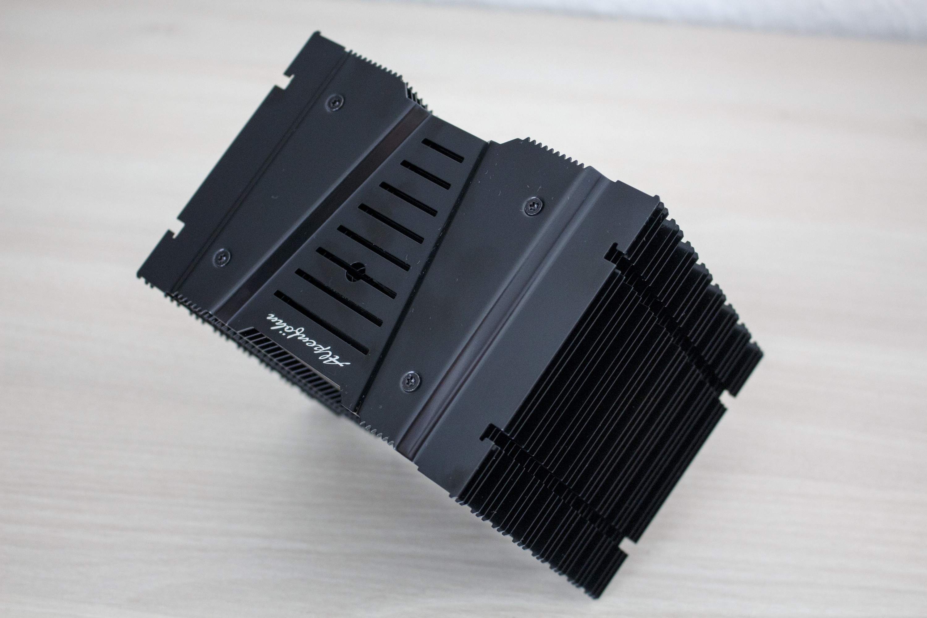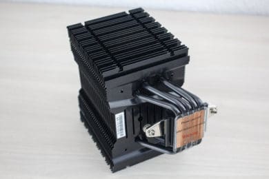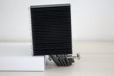 Entpackt man den Kühlkörper, wird einem schnell klar, dass Alpenföhn diesen CPU-Kühler passend benannt hat. Der 720 g schwere Brocken 3 besteht aus 32 Aluminium-Lamellen, fünf 6-Millimeter-Heatpipes und einer Bodenplatte mit der Heatpipe-Direct-Touch-Technologie. Das bedeutet, dass die Heatpipes glatt geschliffen wurden und direkt auf dem Heatspreader der CPU aufliegen. Alle Aluminium-Finnen, Heatpipes und der Sockel wurden glänzend schwarz eloxiert. Betrachtet man den Kühler von der Seite erkennt man schnell das dieser asymmetrisch aufgebaut bzw. nach links ausgerichtet ist. Dieser Aufbau soll trotz großem Lüfter eine hohe Kompatibilität zu hohen Heatspreadern auf den RAM-Modulen gewährleisten.