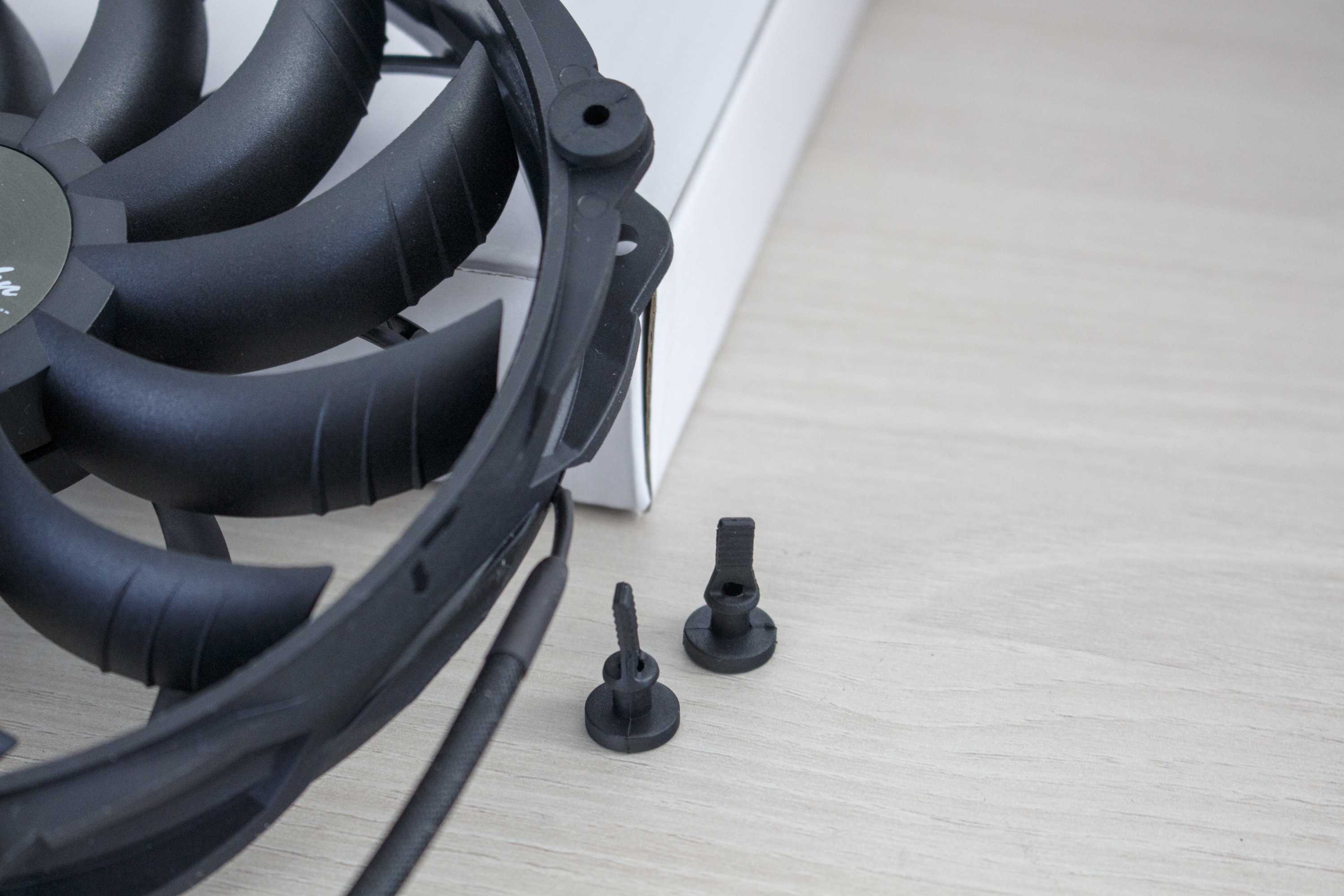 Die zwei mitgelieferten Wing Boost 3 Lüfter aus dem eigenen Hause sind komplett schwarz, verfügen über einen 4-Pin-PWM-Anschluss mit Y-Weiche und drehen mit maximal 1050 Umdrehungen pro Minute. Zur Entkopplung hat der Hersteller zudem acht Gummipuffer beigelegt.