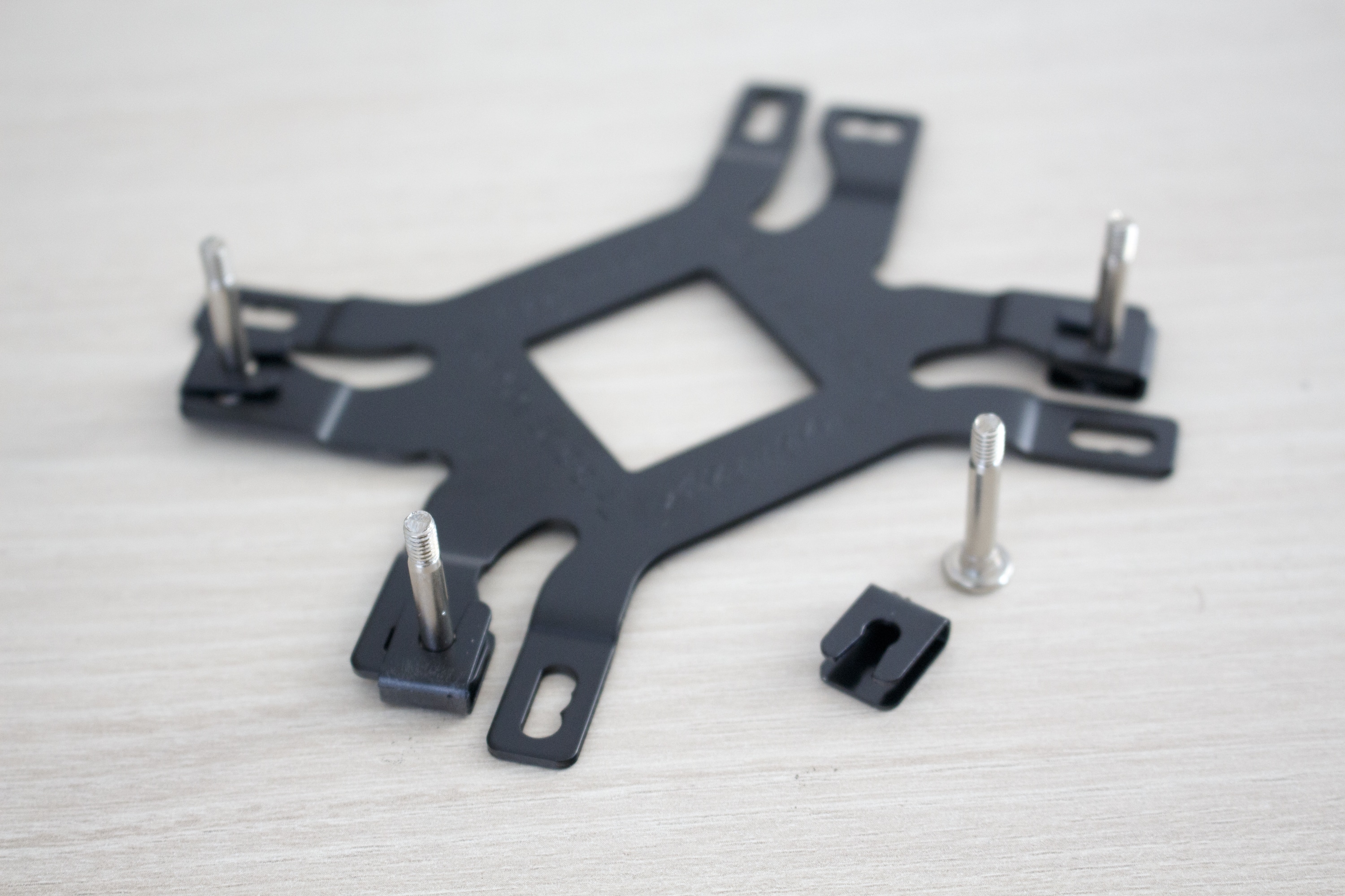 Danach müssen auf alle vier Bolzen die Abstandshalter aus Kunststoff gestülpt werden. Hiernach wird dann dann der Montagerahmen auf die Abstandshalter gelegt und mit vier Muttern verschraubt. Bevor nun der Kühler auf die CPU aufgesetzt werden kann, darf man natürlich die Wärmeleitpaste nicht vergessen. In unserem Review verwenden wir wie immer die Arctic MX-4 und verstreichen diese gleichmäßig dünn auf dem Heatspreader.