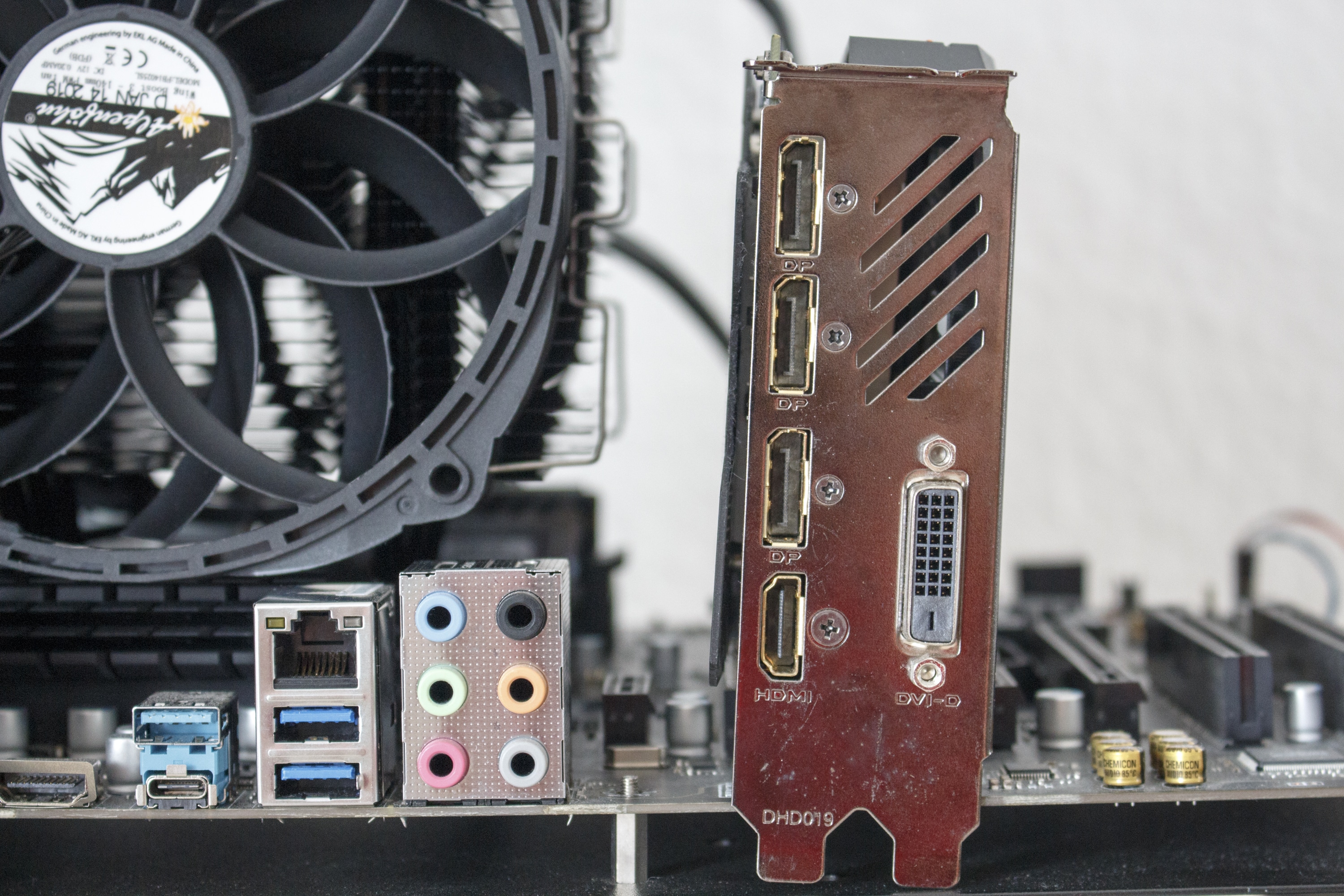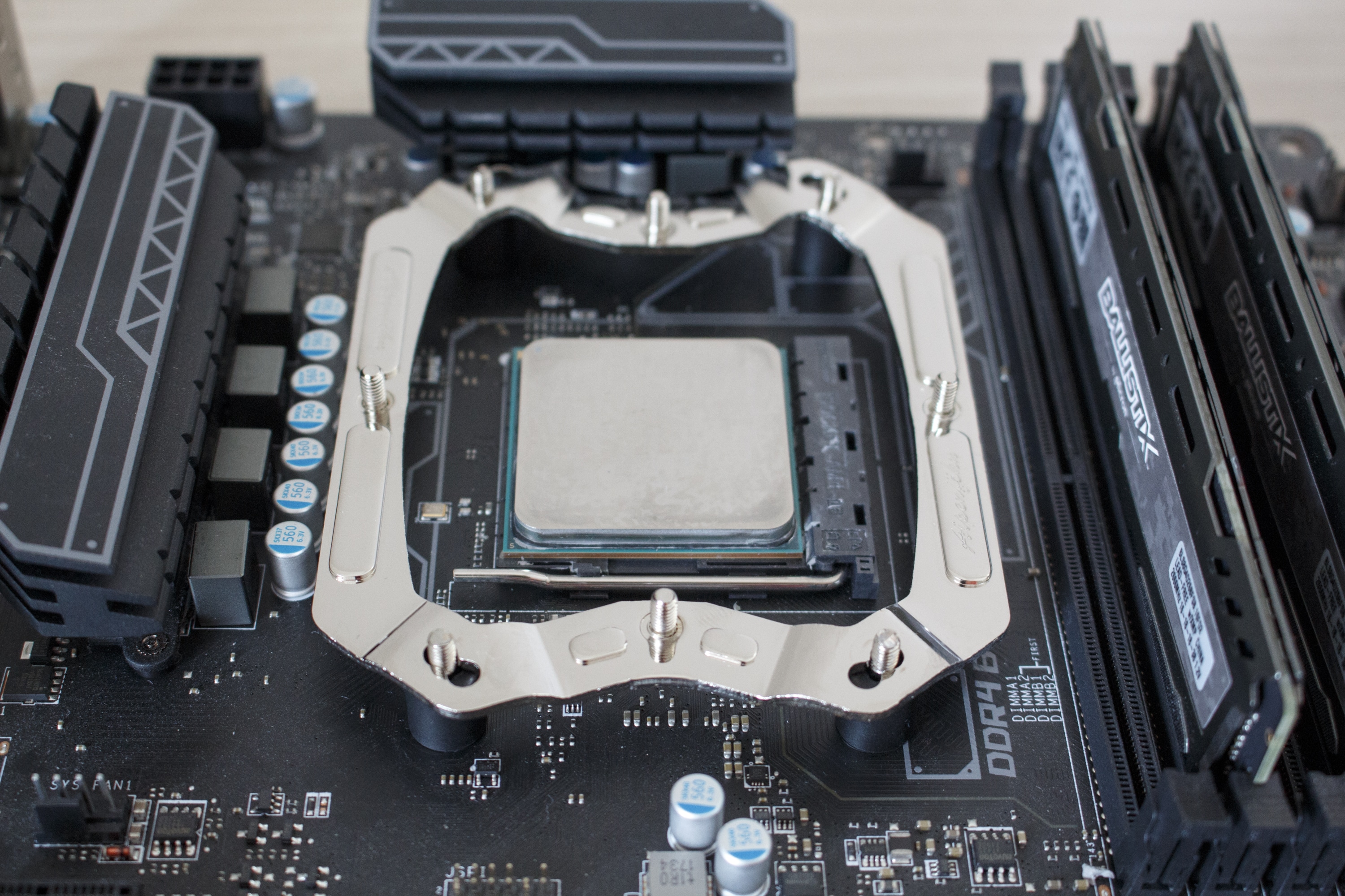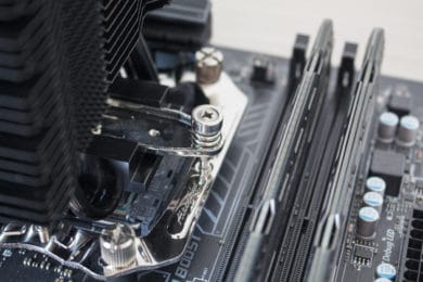 Auch mit installiertem Lüfter gibt es in allen RAM-Slots noch genug Platz für hohe Heatspreader. Hierzu muss aber gesagt werden , dass dies nur für Mainboards mit vier oder zwei RAM-Slots auf der rechten Seite der CPU gilt. Bei Plattformen die auch RAM-Slots auf der linken Seite der CPU haben, könnte es zum Problemen mit höheren Heatspreadern kommen. Das Gleiche gilt für den obersten PCIe-Slot auf dem Mainboard. Je nach Position und Backplate der Grafikkarte könnte es hier zu Komplikationen bekommen.