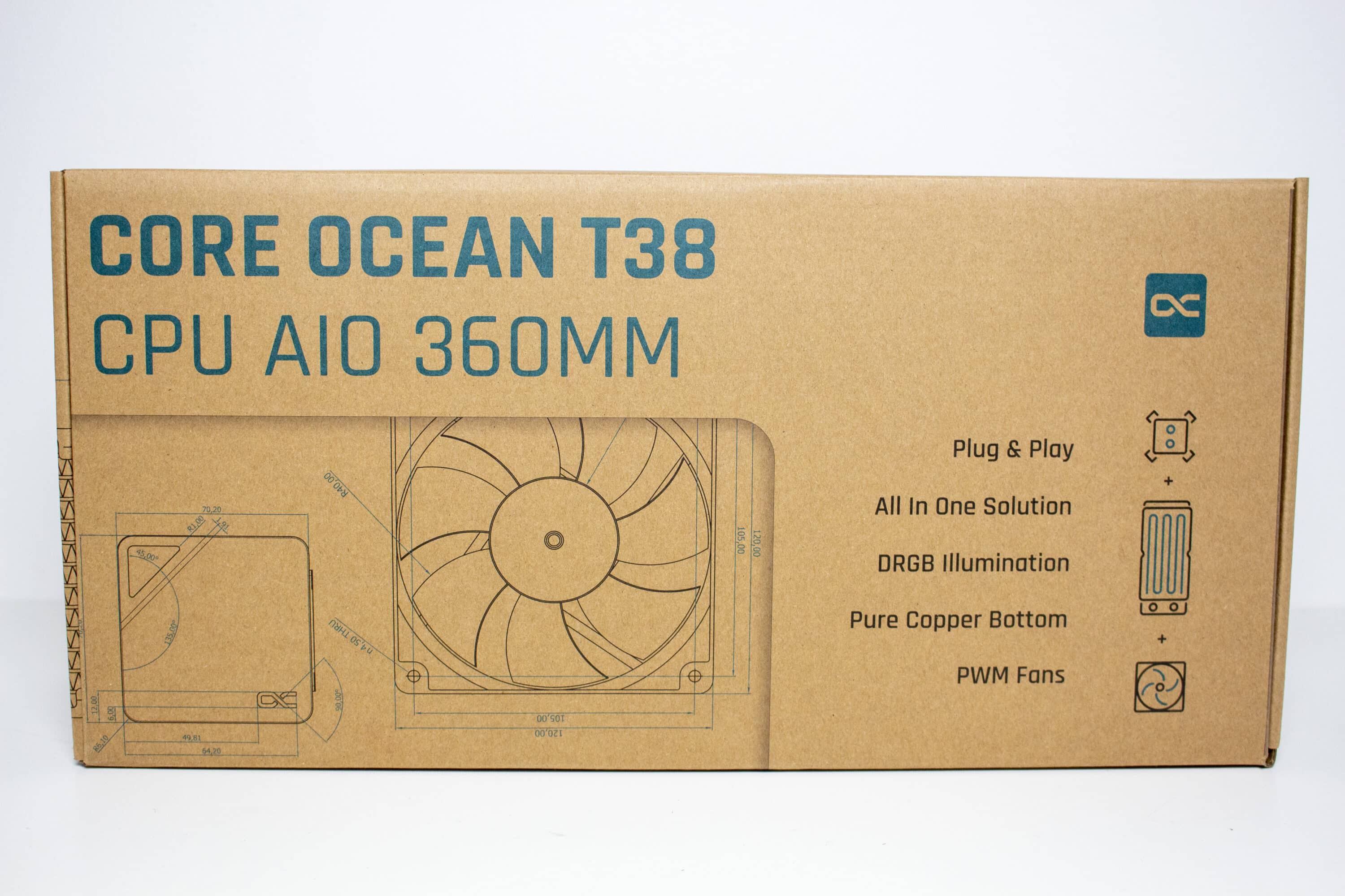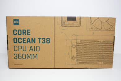 Alphacool verpackt die Core Ocean T38 360mm in einem großen Karton aus Pappe, der nur mit wenig farblichen Akzenten bedruckt wurde. Überwiegend ist der Karton braun gehalten und verrät nur wenig über die Komponenten im Inneren. Der Hersteller-Schriftzug sowie Produktname wurden mit blauer Farbe auf die Kartonage gedruckt. Außerdem sind auf der Verpackung technische Zeichnungen aller Komponenten wie Radiator, Pumpe und Lüfter zu finden. Genau technische Daten der AiO-Wasserkühlung wurden nicht auf den Karton gedruckt.