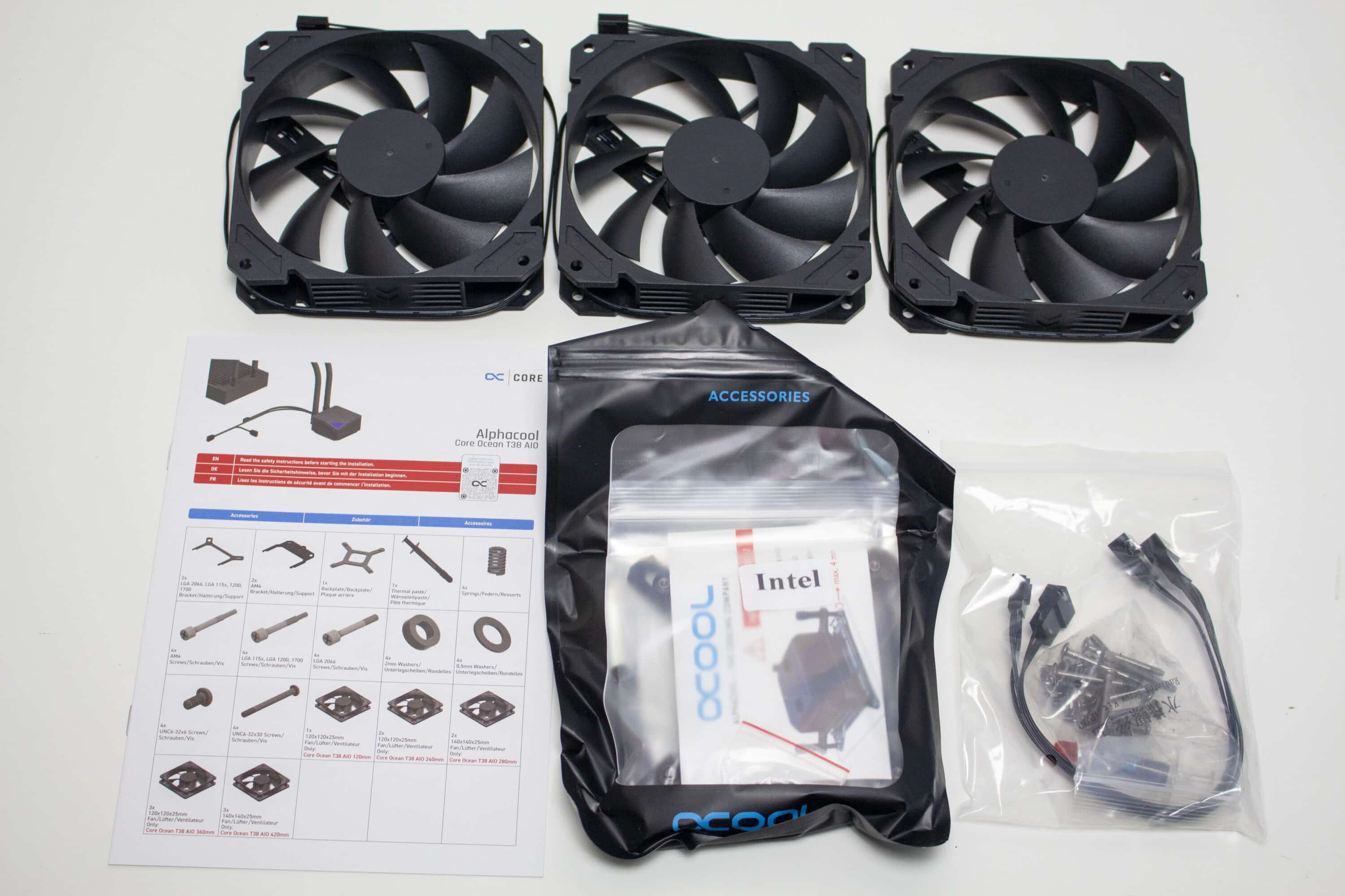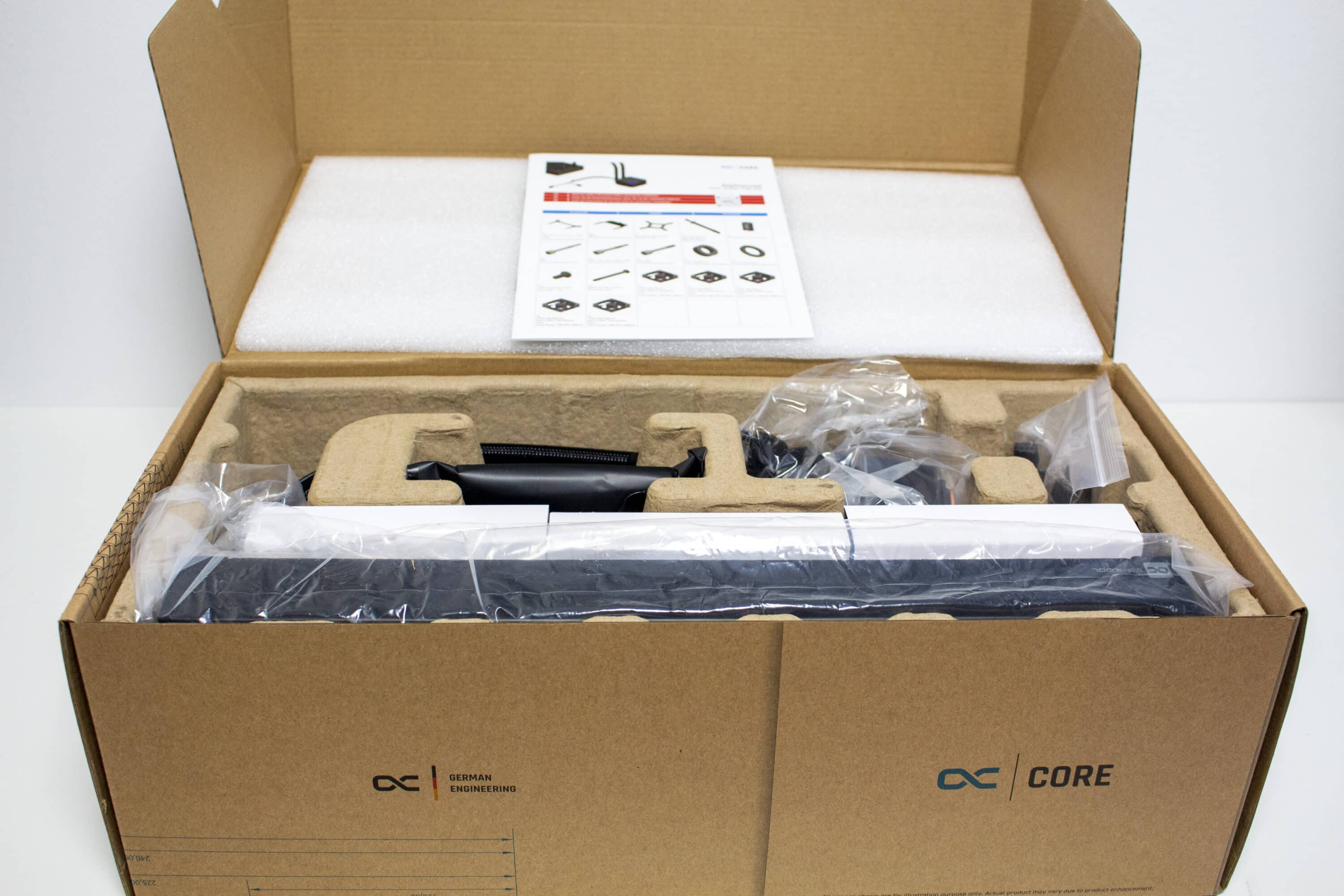 Öffnet man die Verpackung, trifft man zuerst auf eine Montageanleitung sowie eine dünne Matte aus Schaumstoff. Darunter findet sich die Wasserkühlung in einer Schutzform aus Pappe. Des Weiteren sind der Radiator sowie die Pumpe in eine zusätzliche Folie aus Kunststoff eingehüllt. Ebenfalls einzeln verpackt sind die drei beiliegenden Lüfter, die in einer weißen Pappschachtel versteckt wurden. Das restliche Montagezubehör hat Alphacool in einem Beutel platziert und in AMD- und Intel-Zubehör unterteilt.