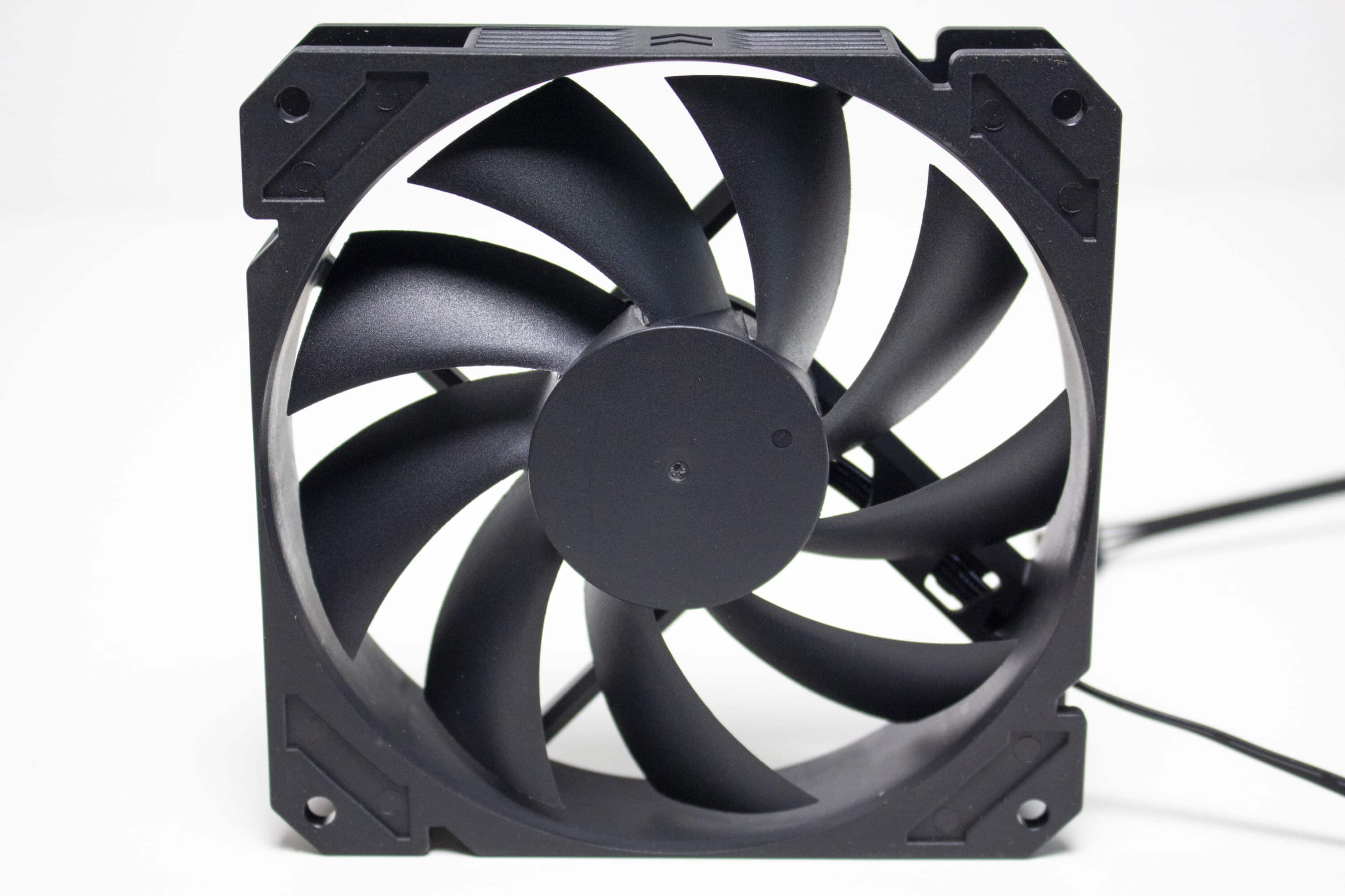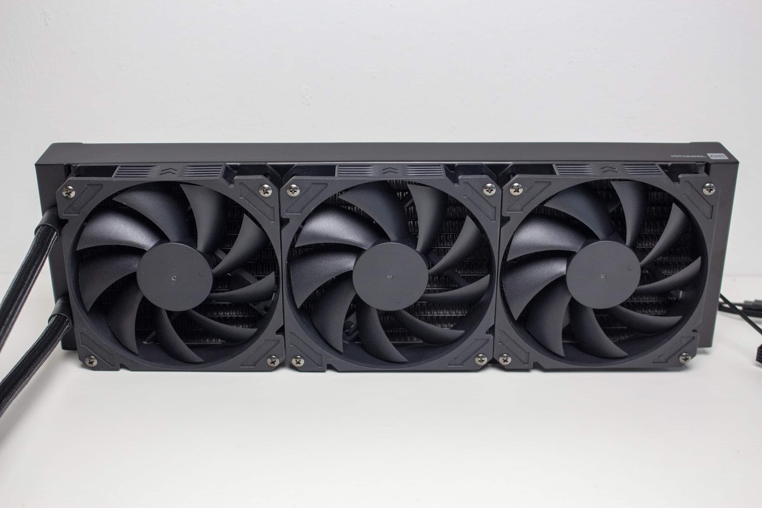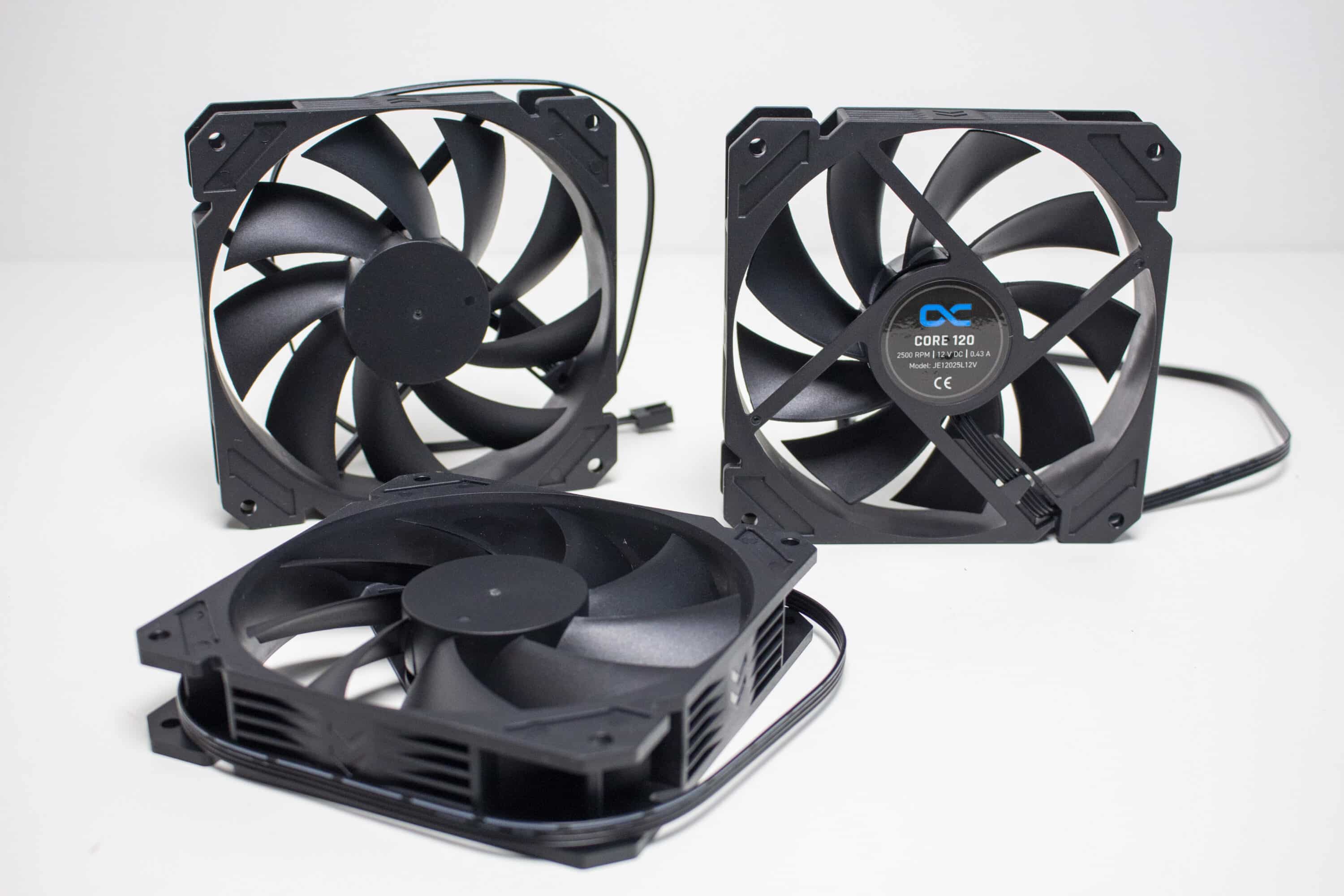 Die beigelegten Lüfter stammen aus der Core-Serie und liefern genau das, was bei dem Namen erwarten würde. Sowohl Rahmen als auch der Ventilator sind komplett schwarz gestaltet und bestehen aus Kunststoff. Die neun Lüfterblätter enden sehr nah am Rahmen, verfügen aber über keine spezielle Gestaltung. Auch auf Entkopplungselemente verzichtet Alphacool bei den Core-Lüftern vollständig. Dafür liegt die Maximaldrehzahl der Ventilatoren aber bei 2500 Umdrehungen pro Minute und der Anschluss erfolgt jeweils über einen schwarzen 4-Pin-Stecker, die über den mitgelieferten 3-fach-PWM-Splitter zu einem Kabelstrang zusammengefasst werden können.