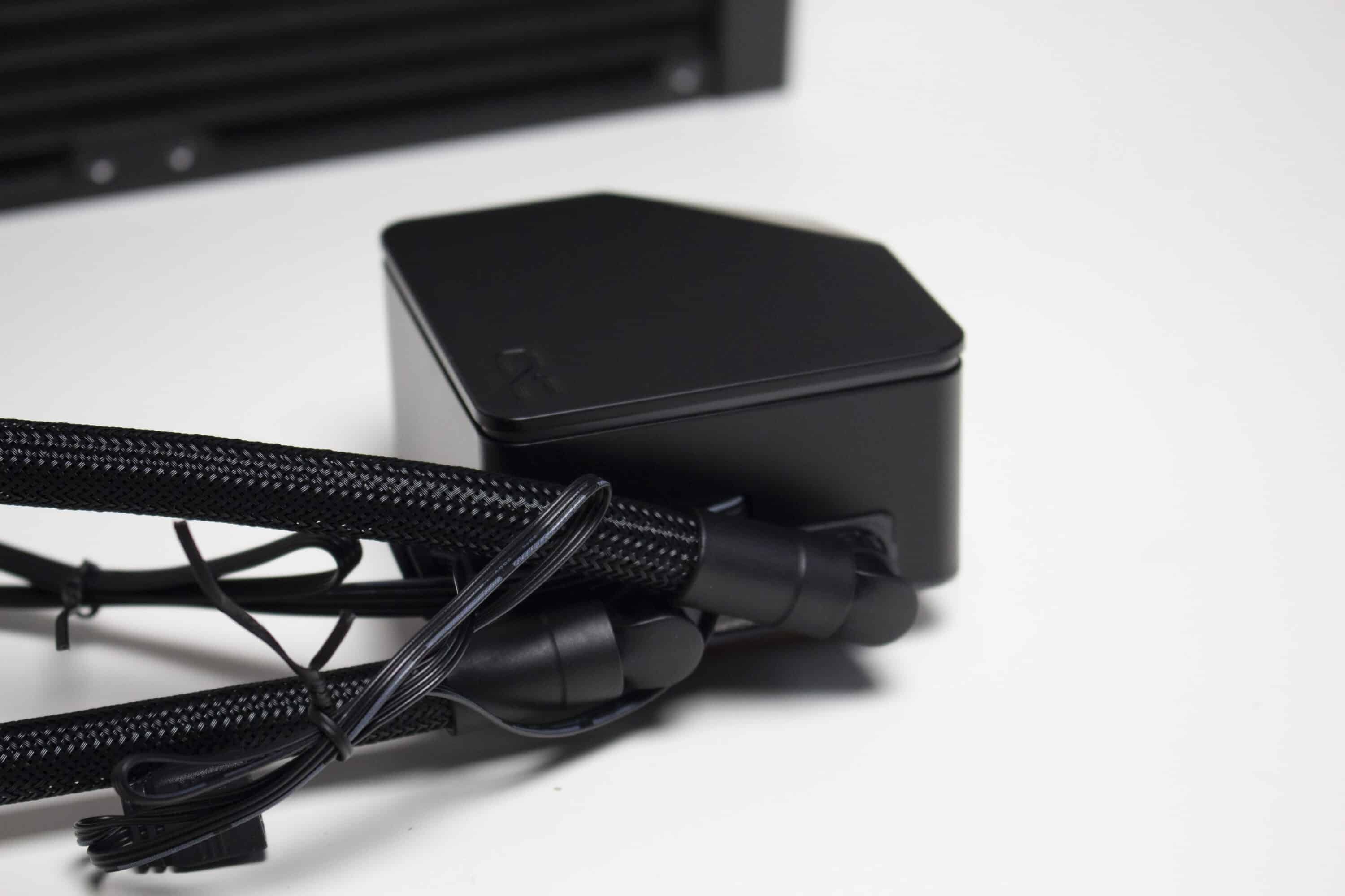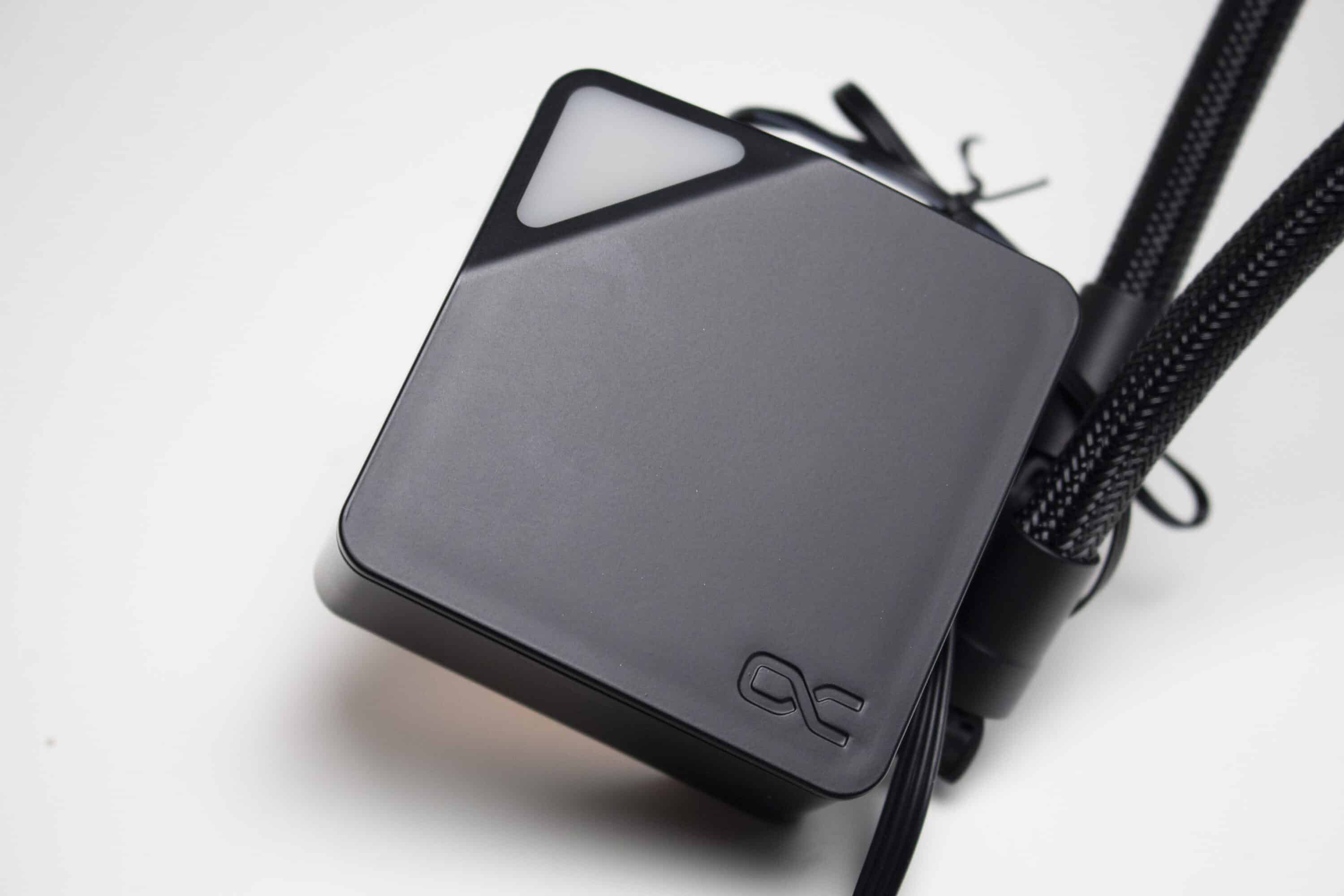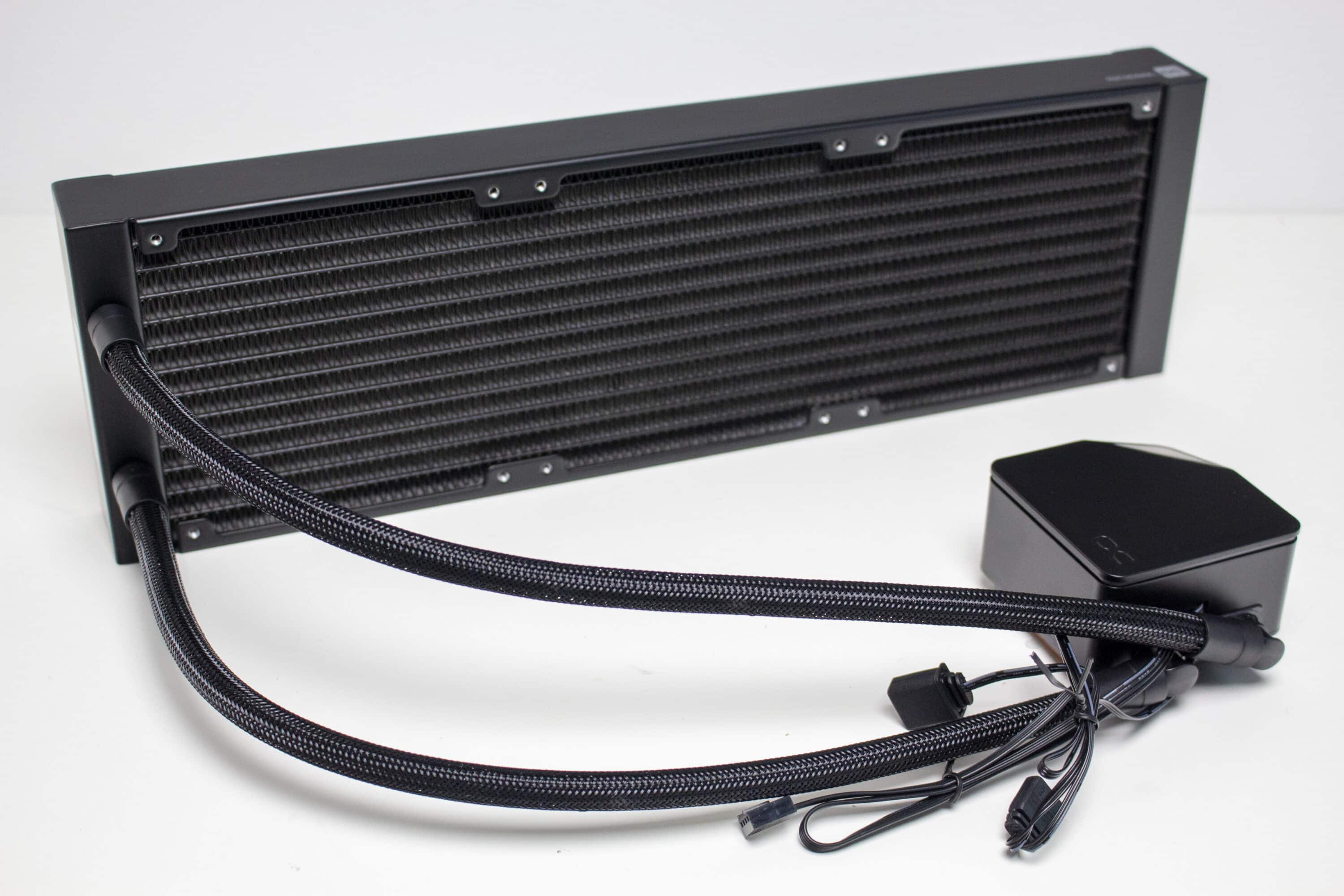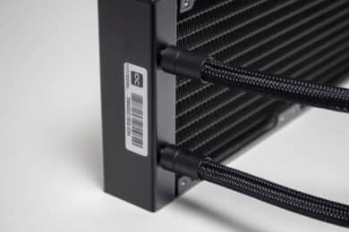 Die FEP-Schläuche sind 400 Millimeter lang, von einem feinen schwarzen Sleeve umhüllt und enden am Pumpenblock in zwei beweglichen Gelenken. Durch diese Kombination lässt sich der Radiator problemlos an jeder Stelle im Gehäuse platzieren. Die geringe Höhe des Pumpenblock und die flexiblen Gelenke ermöglichen es zudem, die Wasserkühlung auch problemlos in flachen SFF-Gehäusen unterbringen zu können. Sowohl am Pumpenblock als auch am Radiator wurden die Schläuche mit den Verbindungselementen verpresst und sind somit nicht erweiterbar.
