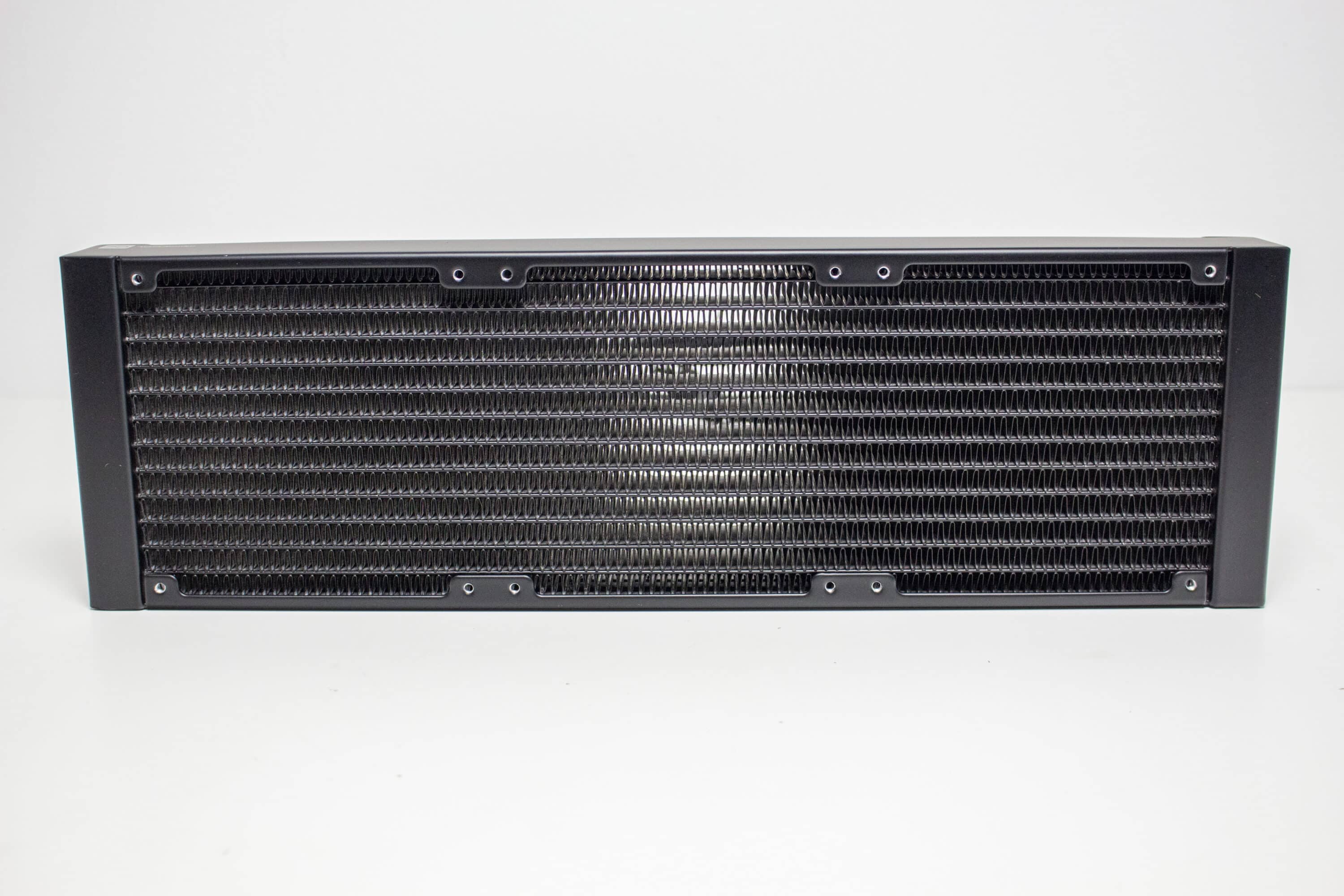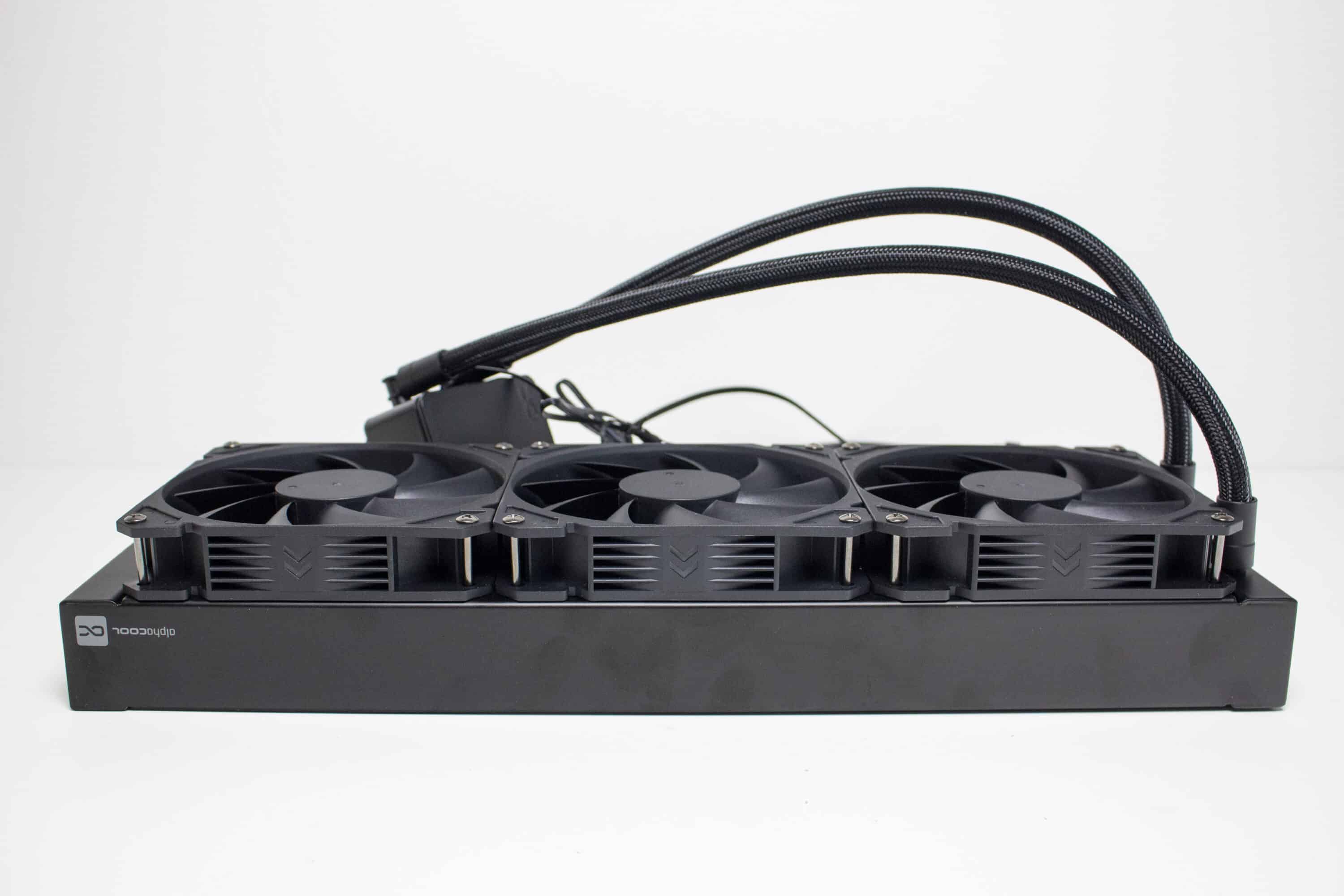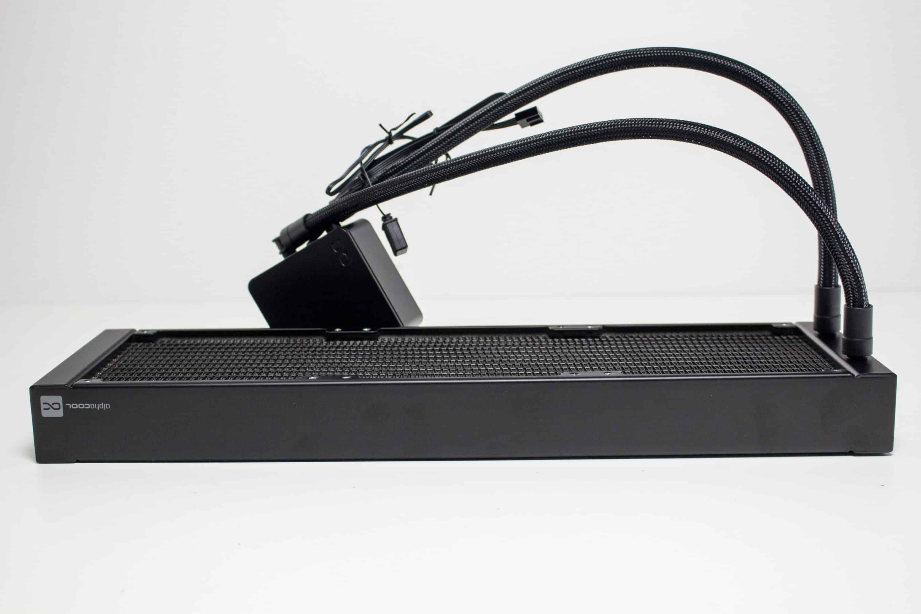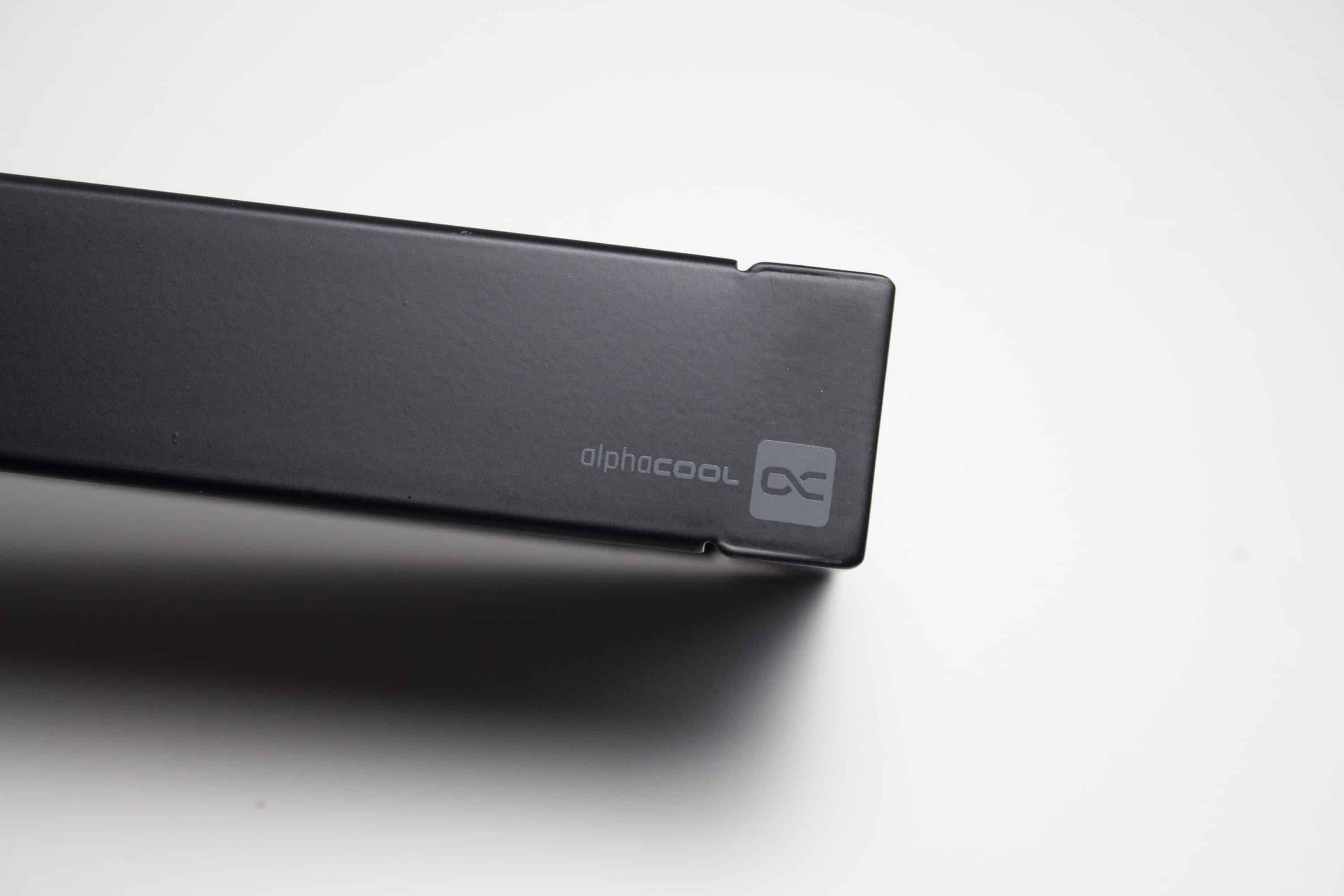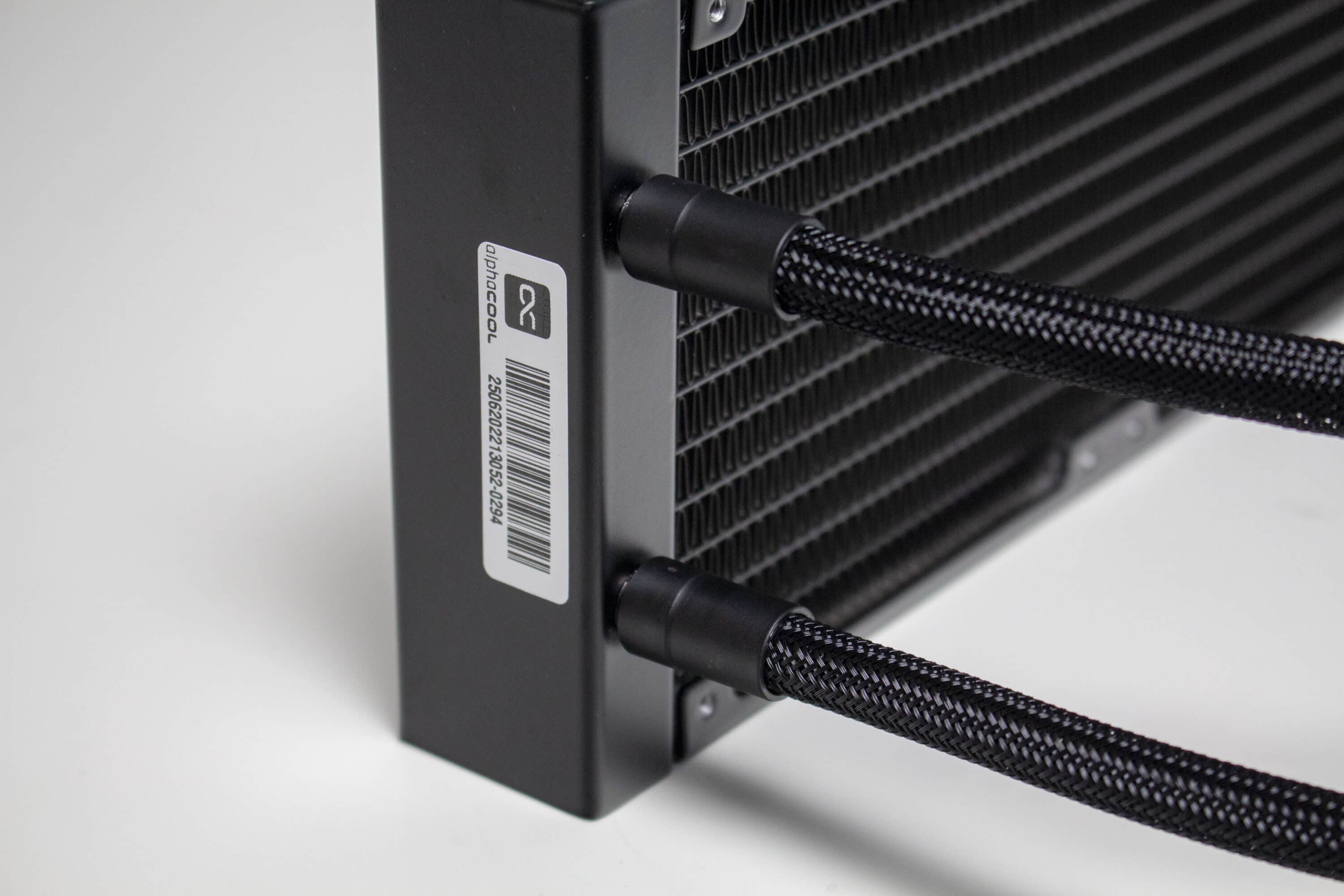 Alphacool verzichtet zu Gunsten des Kaufpreises auf teure RGB-Lüfter oder ein besonders auffälliges Design des Pumpenblocks oder des Radiators. So ist letzterer komplett schwarz lackiert und mit einer Tiefe von 37 Millimetern erstaunlich dick konstruiert. Die Rippen des Radiators bestehen aus Aluminium und haben eine Dichte von 19 FPI. Der Schriftzug des Herstellers ist seitlich am Radiator in grau-weiß aufgedruckt.