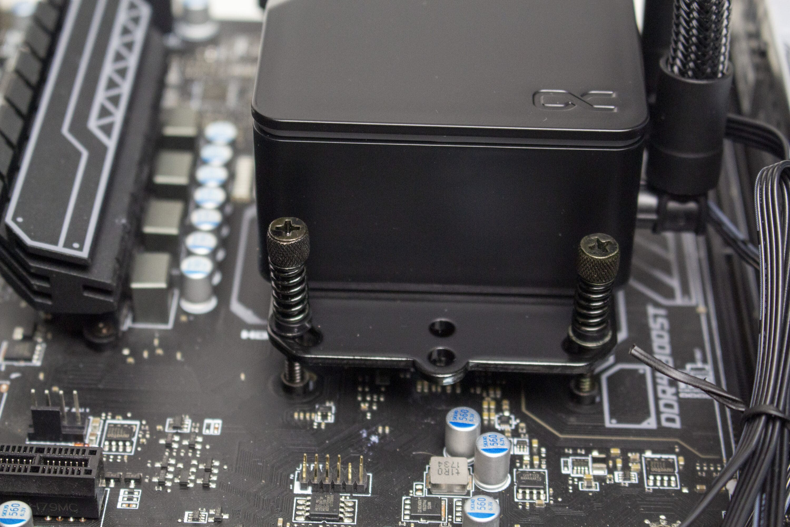 Nachdem nun die korrekte Menge an Wärmeleitpaste aufgetragen wurde, kann der Pumpenblock auf die CPU gestellt und mit den Montageschrauben befestigt werden. Dieser Schritt war leider etwas fummelig, da die Federn und Distanzscheiben nicht fest sind und mit den Fingern festgehalten werden müssen, währen die Schrauben durch den Montagerahmen geführt wird.