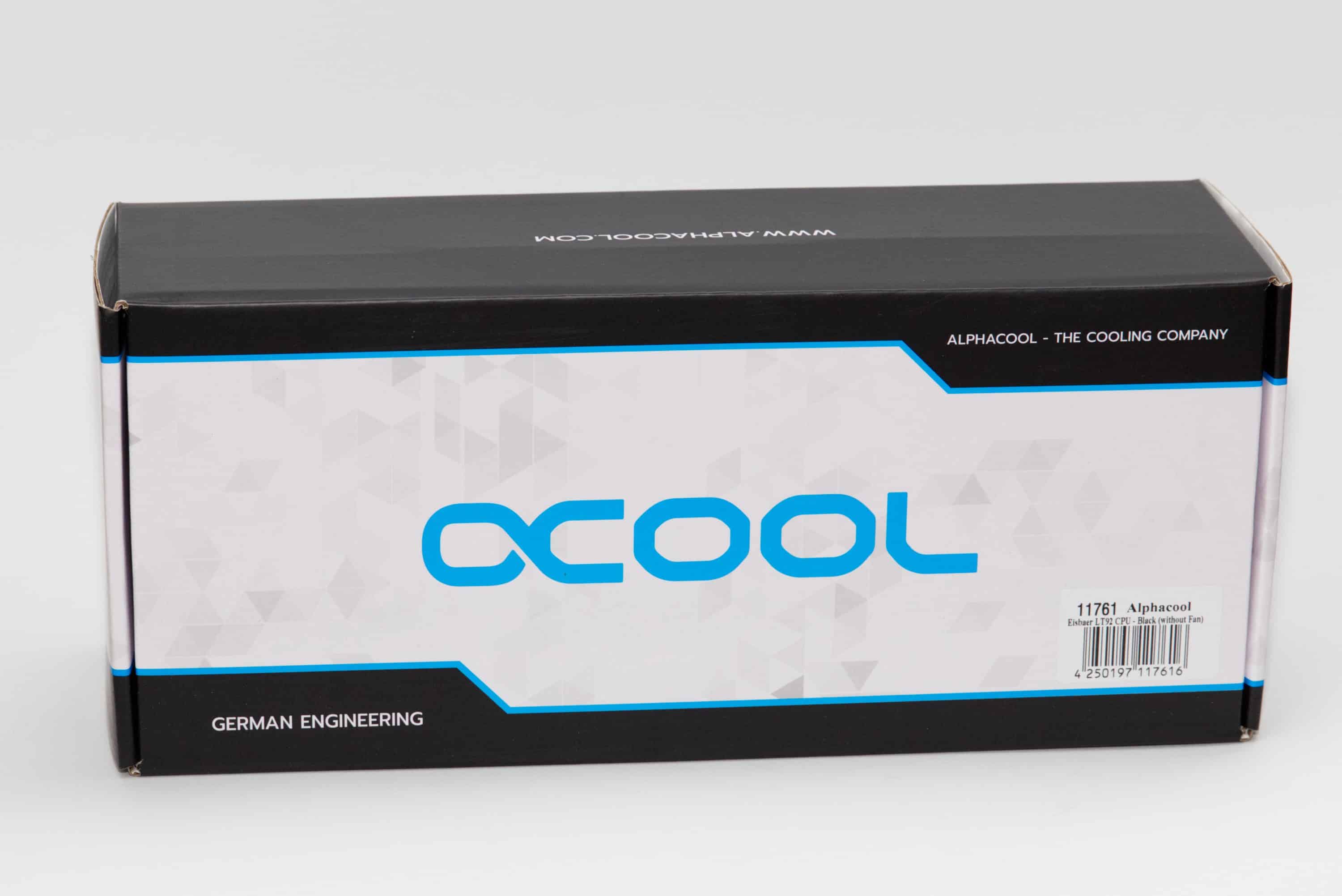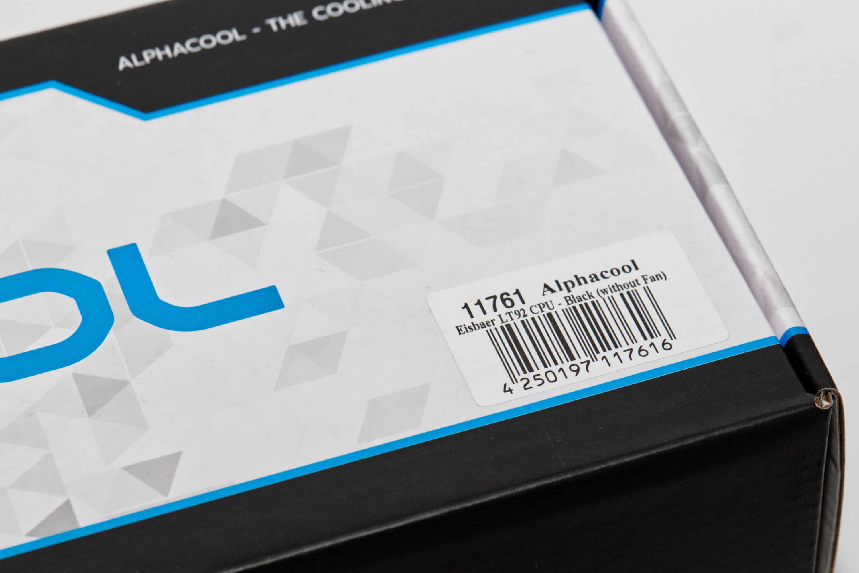 Die Verpackung der Alphacool Eisbaer LT92 CPU AIO ist recht simpel und universell gestaltet. Es gibt auf der Verpackung also keinen konkreten Aufdruck, der darauf hinweist, was sich in der Schachtel findet. Bis auf einen Aufkleber im Eck.