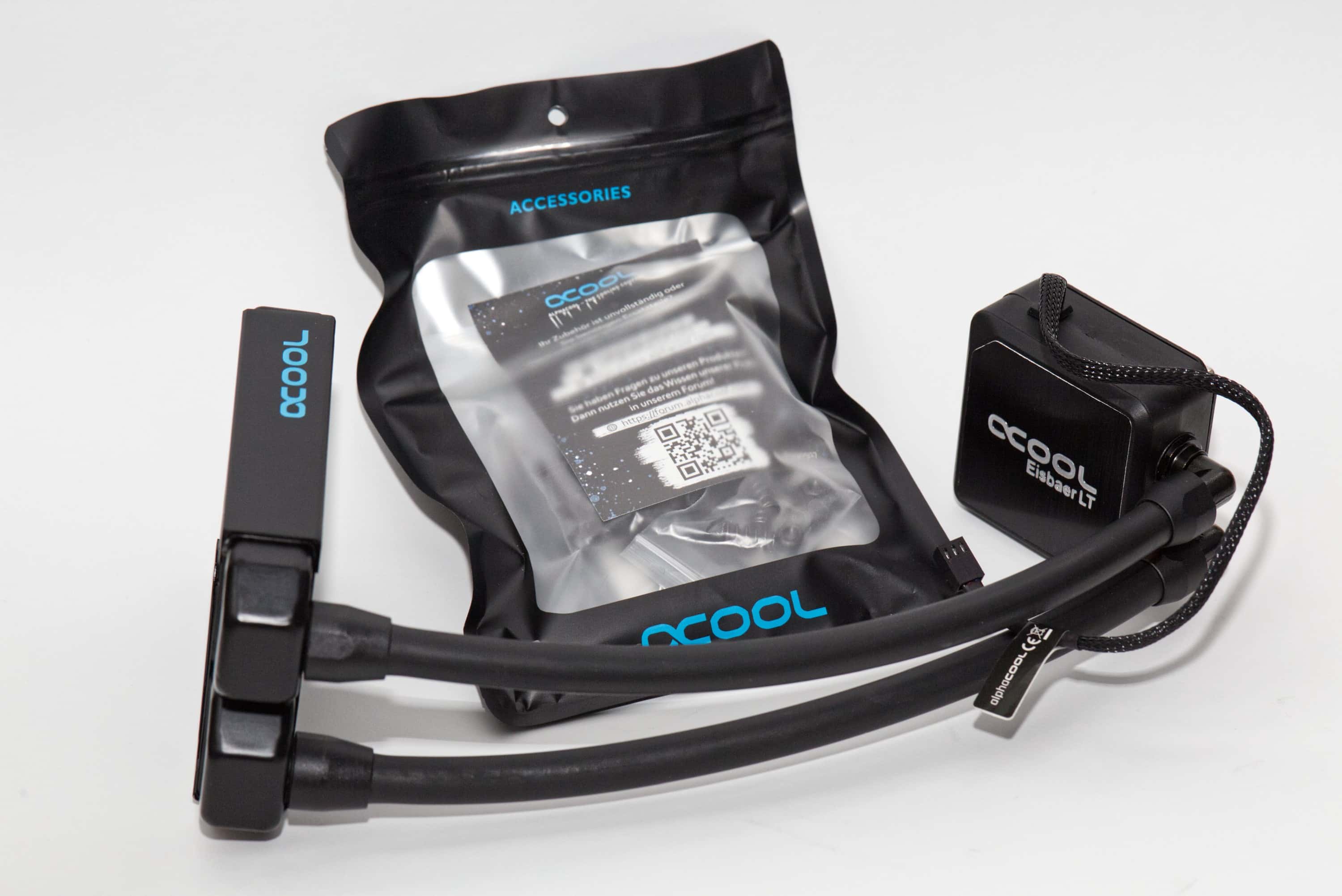 Die AIO steckt in einer langen Folie und wird geschützt durch Schaumstoff. In der Mitte liegt eine Tüte mit Zubehör und Montagematerial. Dieses besteht aus Montagematerial für AMD und Intel sowie high-end Subzero-Wärmeleitpaste und Schrauben, die zur Montage oder auch für zwei Lüfter reichen. Hierfür gibt es auch einen Lüftersplitter. Und das führt uns gleich hierzu: