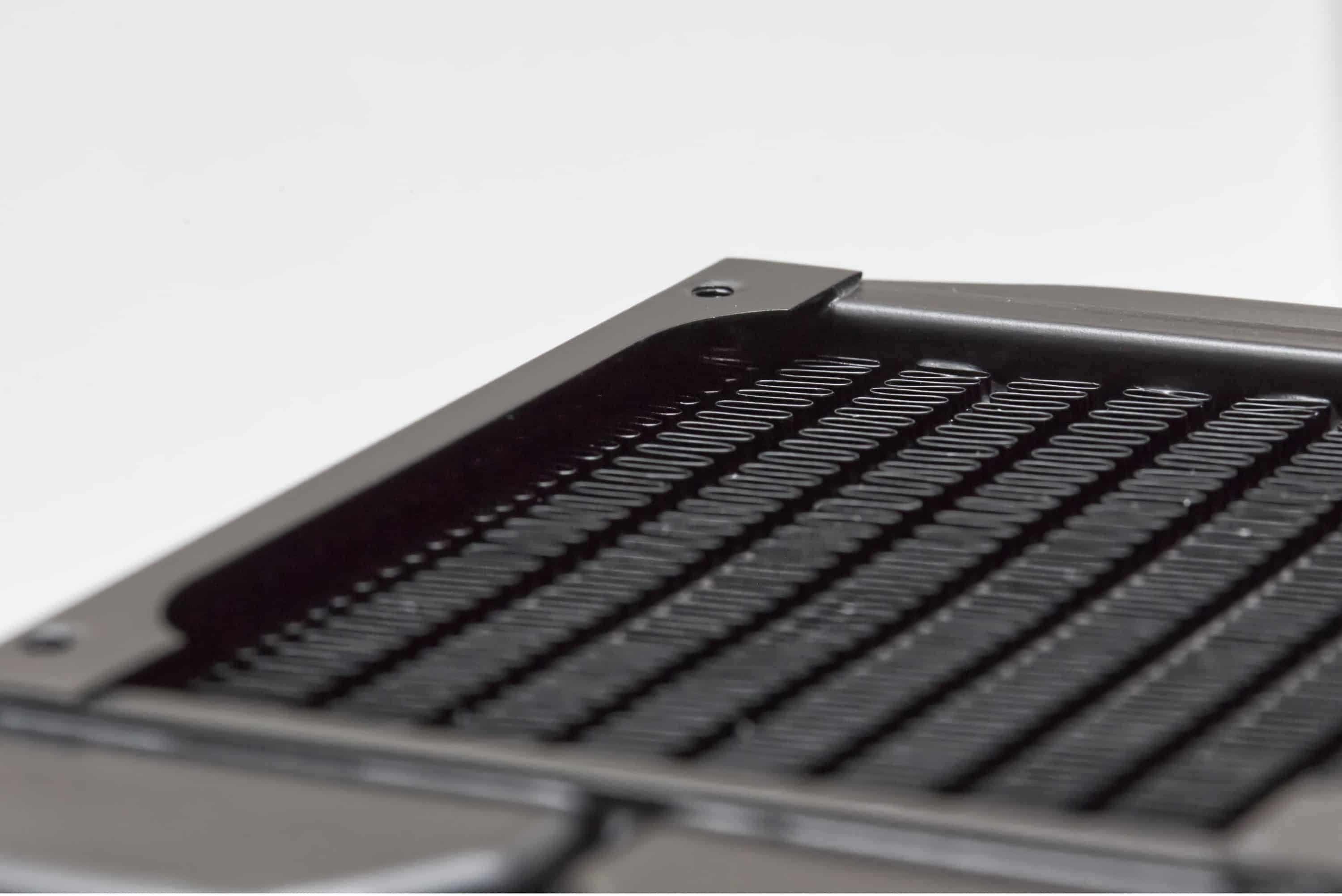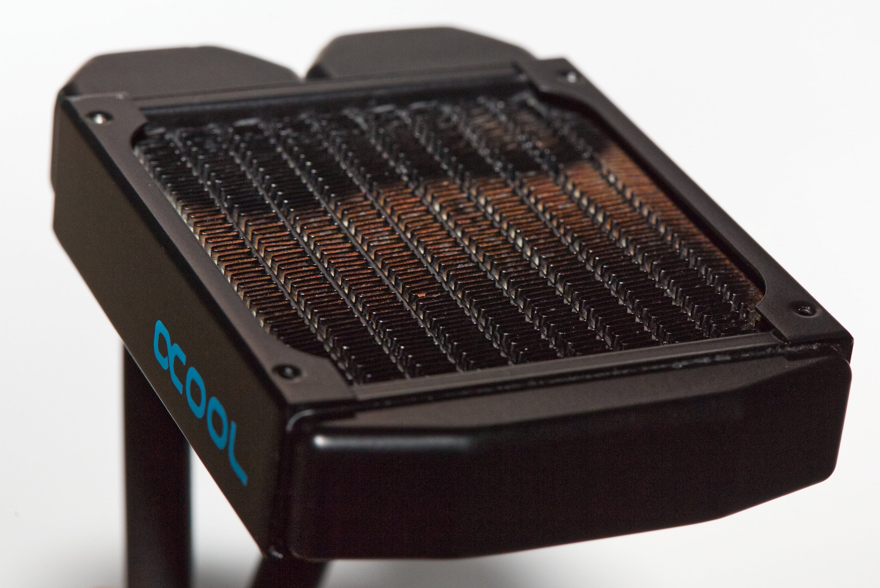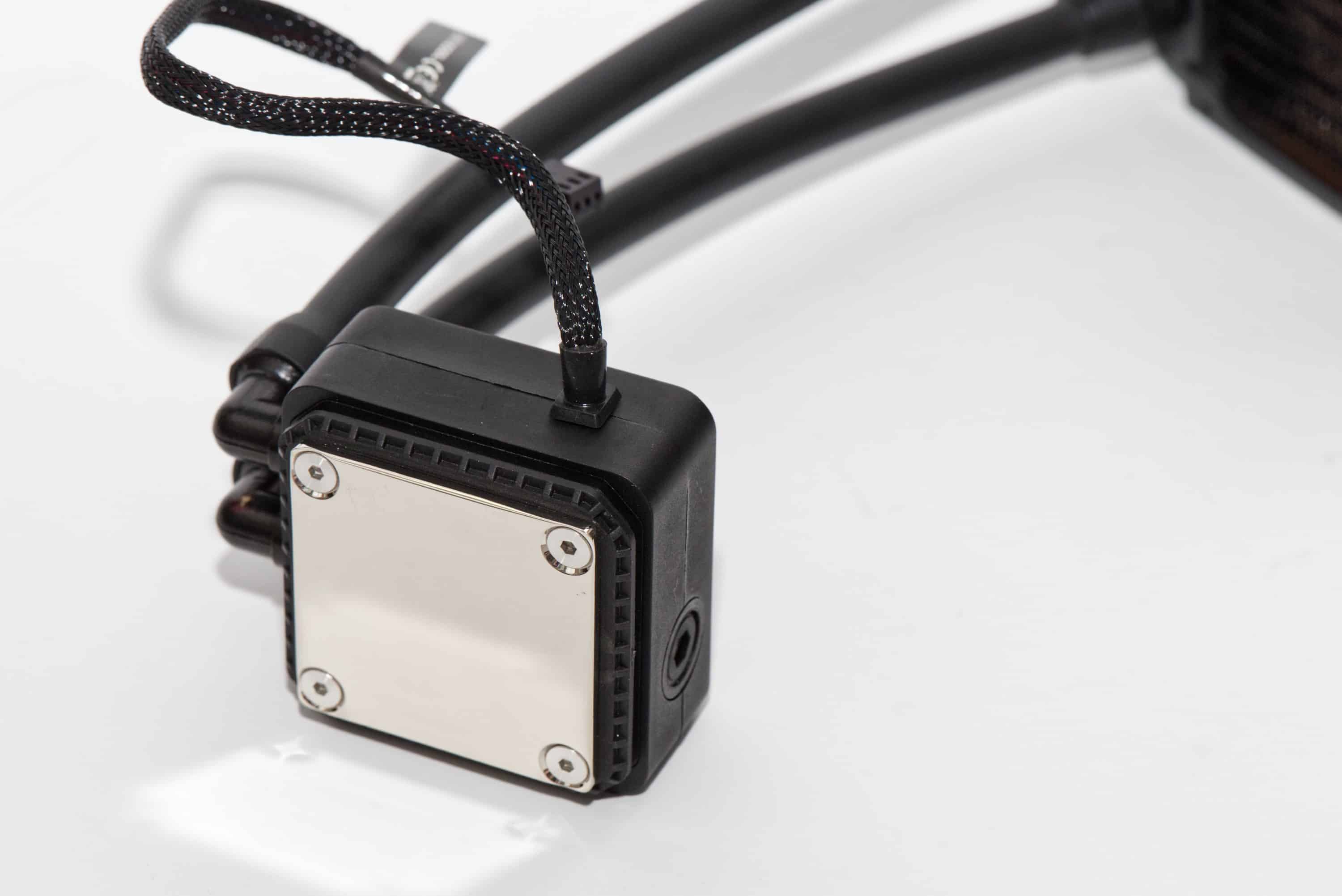 Um den Rand des Radiators findet sich im Gegensatz zu größeren Alphacool-Radiatoren kein Schraubenstopp, sondern möglicherweise zu lang gewählte Schrauben würden sich in die weichen Lamellen drehen. Das ist kein gewaltiges Problem, da die Leitungen für die Flüssigkeit selbst nicht betroffen wären. Der Kühlerboden ist sehr glatt und sauber verarbeitet und auch das 3-Pin-Kabel mit Ummantelung wirkt hochwertig. Der einzige Punkt, der mir etwas negativ aufgestoßen ist, ist der Rand der Frontabdeckung auf der Pumpeneinheit. Hier glänzt der Rand metallisch, das ist allerdings etwas unregelmäßig. Das beeinflusst die Leistung allerdings nicht.