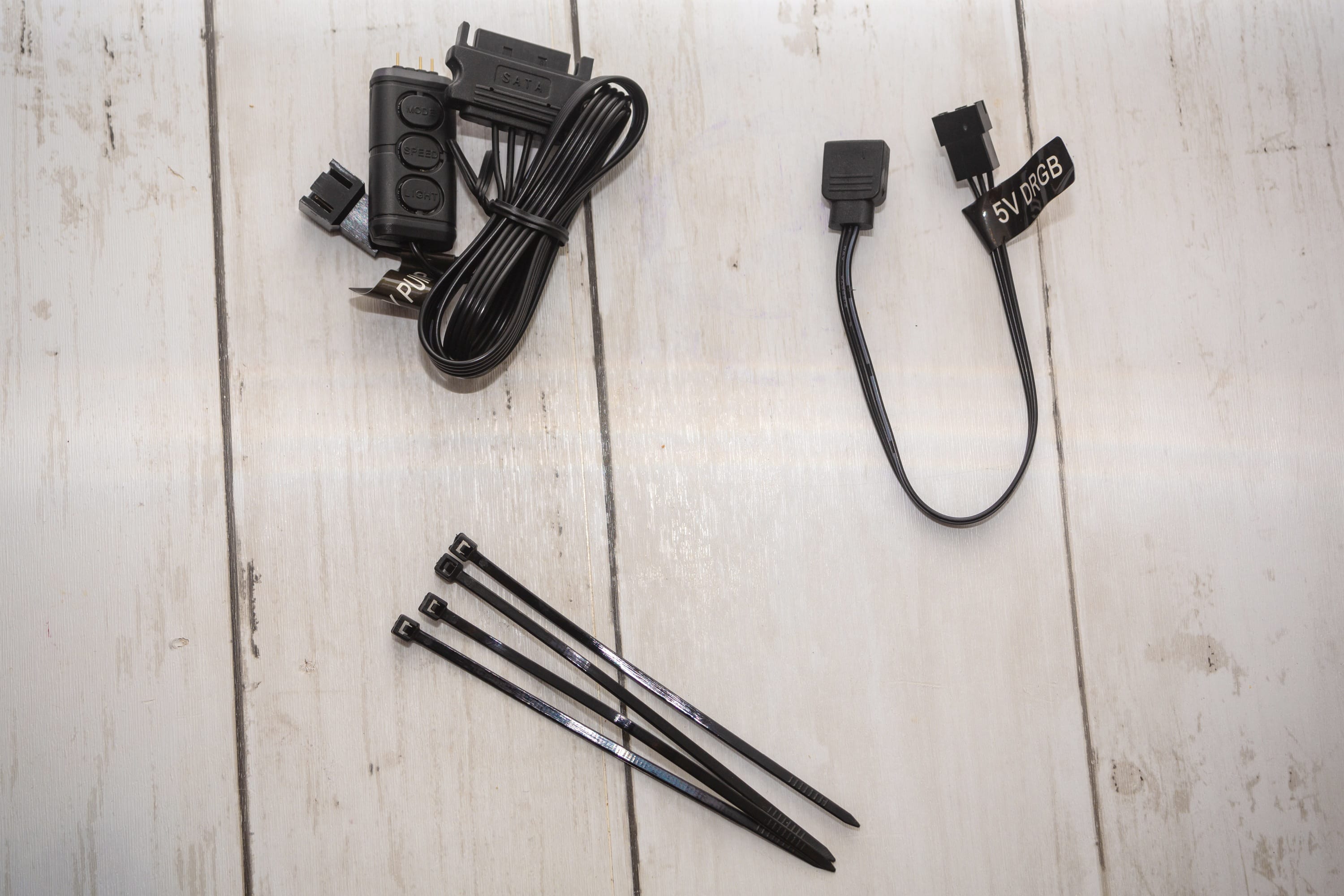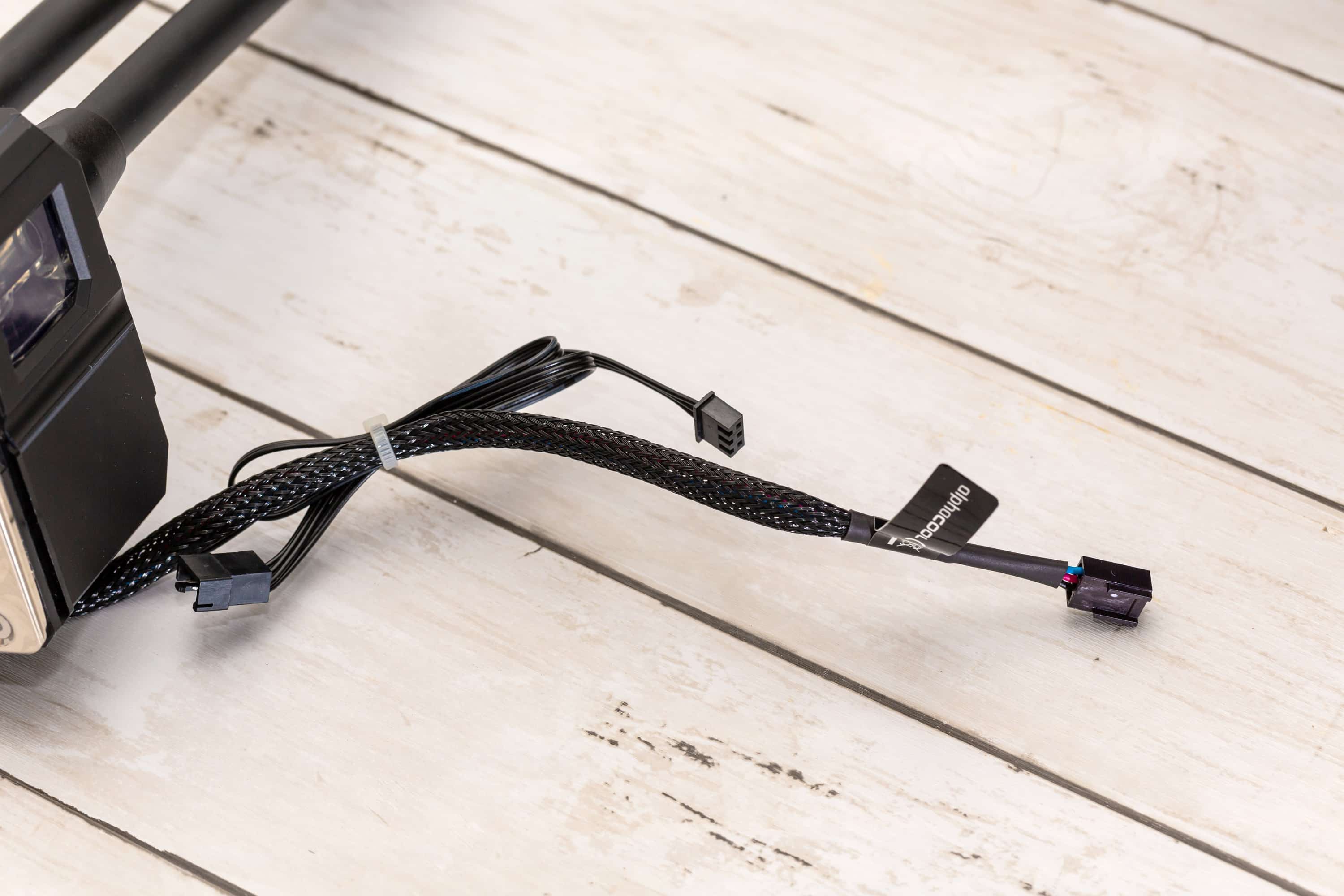 Die Lüfter kommen jeweils mit einem 4-Pin-PWM-Lüfterkabel und können durch einen mitgelieferten Splitter an einen Header angeschlossen werden. Im Gegensatz zum Lüfterkabel besitzen die RGB-Kabel an den Lüftern sowohl einen Male- als auch einen Female-Anschluss. Dadurch kann man die RGB-Kabel zusammenschließen, ebenso an einem Ende die Pumpeneinheit. Nun gibt es die Möglichkeit, den mitgelieferten ARGB-Controller zu nutzen oder durch das Adapterkabel auf einen regulären ARGB-Stecker am Mainboard oder an einem sonstigen Controller zu gehen.