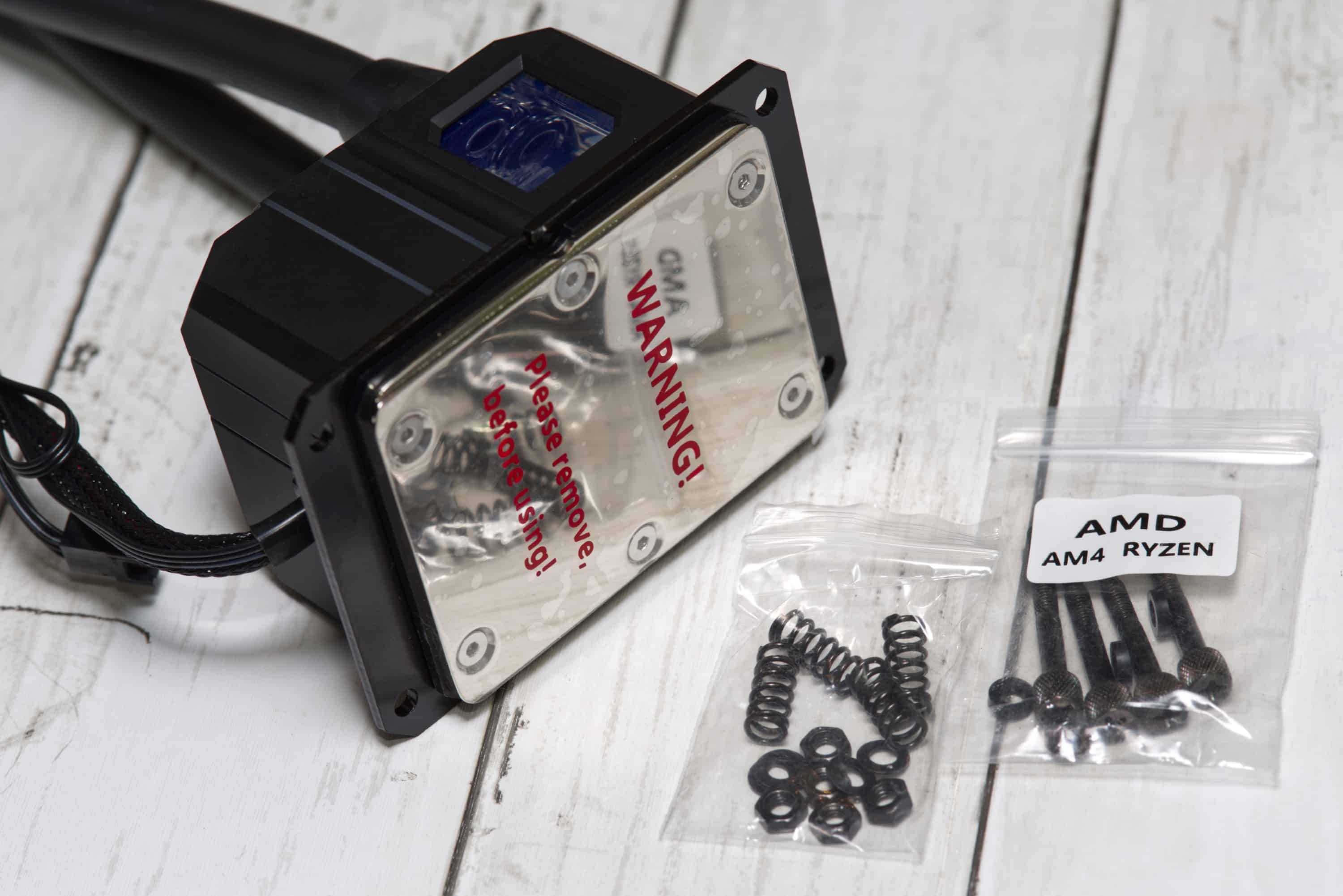 Die Montage der Alphacool Eisbaer Pro Aurora 360 CPU AIO ist prinzipiell kein Hexenwerk, aber gehört dennoch auf die eher komplexe Seite. Zu Beginn wirkt es noch ganz simpel: Die zwei Teile der Halterung werden um den Kühlerboden gesteckt und klicken einfach zusammen. Was aber etwas komplizierter ist, ist das, was nun folgt: Die Schraube muss vorbereitet werden. Da es für unterschiedliche Mechanismen unterschiedliche Kombinationen gibt, muss man hier genau aufpassen. Für den Test auf der AMD-Plattform werden folgende Dinge benötigt: Die Schraube für AM4, eine Druckfeder, eine 0,5-mm-Unterlegscheibe, eine 2-mm-Unterlegscheibe und eine Mutter. Zunächt kommt die Feder auf die Schraube, dann folgen beide Unterlegscheiben. Anschließend wird die Schraube durch die an der Bodenplatte befestigten Teile gedrückt und nun mit der Mutter festgezogen.