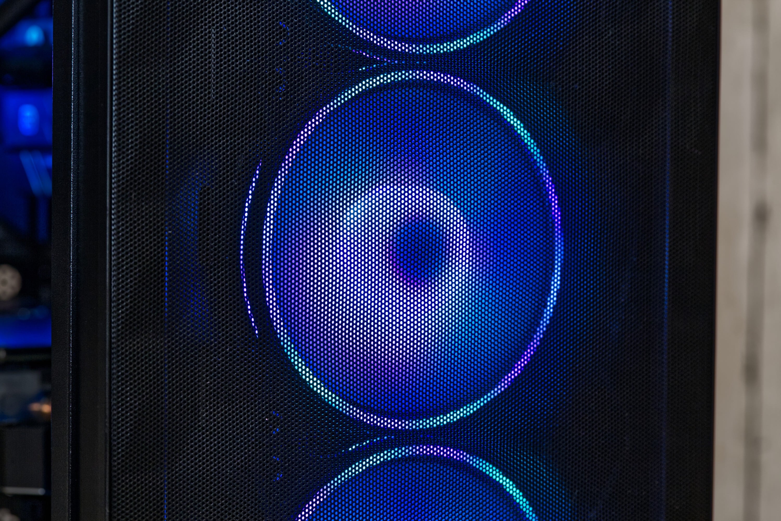 Wo sich die Feature-Liste der Alphacool Eisbaer Pro Aurora 360 CPU AIO sehr solide liest, war das Modell im Test zwar ordentlich verarbeitet, aber nicht überragend. Die Lüfter wirken eher mittelmäßig. Die Lüfterblätter sind recht dünn und haben viel Platz zu den Rändern. Auch das Material der Lüfter fühlt sich nicht nach Premium-Qualität an. Dennoch ist der Rahmen recht verwindungssteif und insgesamt wirken die Lüfter in Ordnung. Jeder Lüfter besitzt zwei Kabel – eines zur Lüftersteuerung und eines für die digitale RGB-Steuerung. Auch wenn das üblich ist, haben manche Firmen inzwischen Konzepte entwickelt, den Kabelsalat besser unter Kontrolle zu halten. Außerdem ist die Rahmenform der Lüfter so gehalten, dass Luft aus den Zwischenräumen wieder nach vorne dringen kann, statt komplett durch den Radiator gedrückt zu werden.